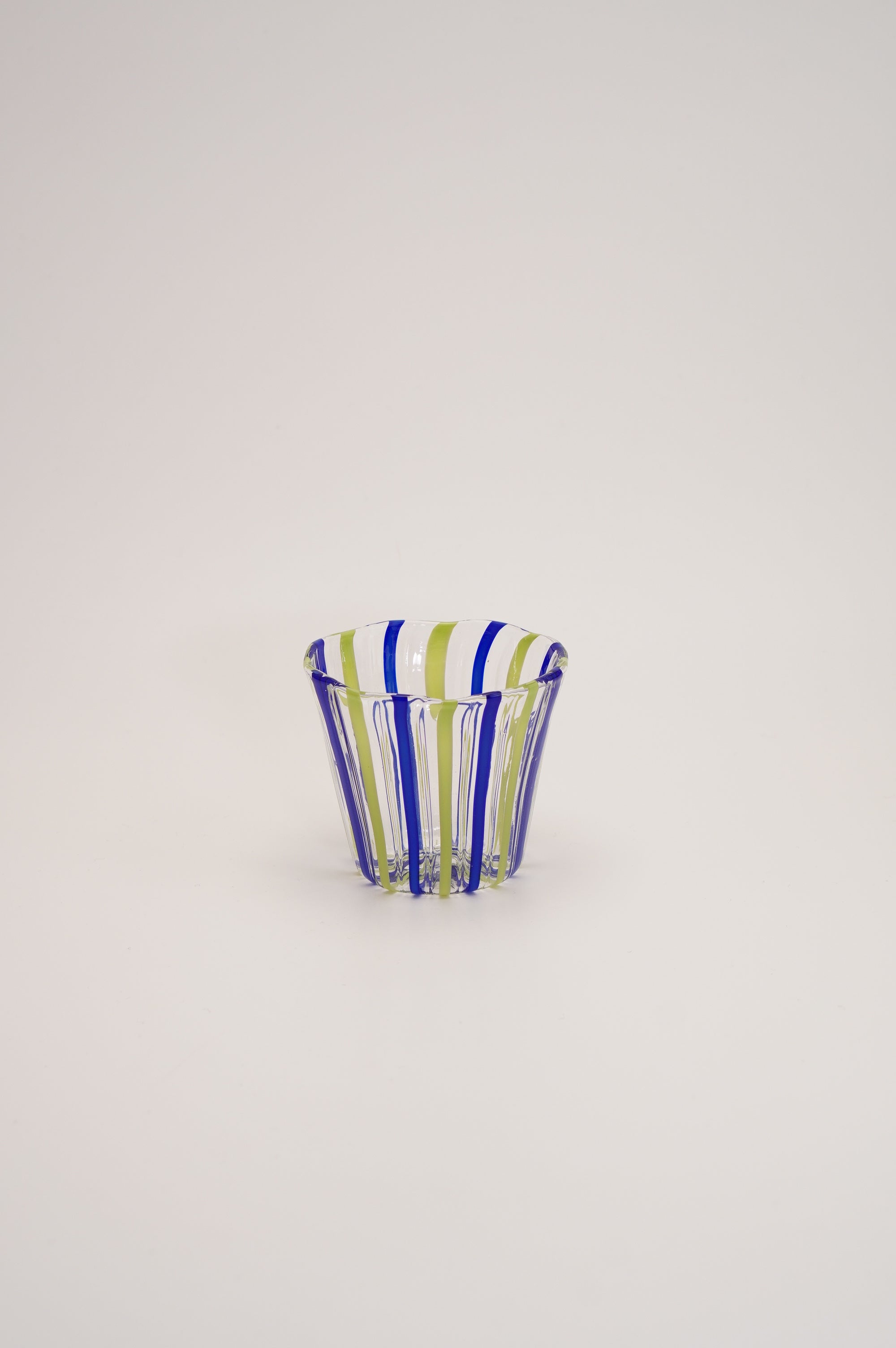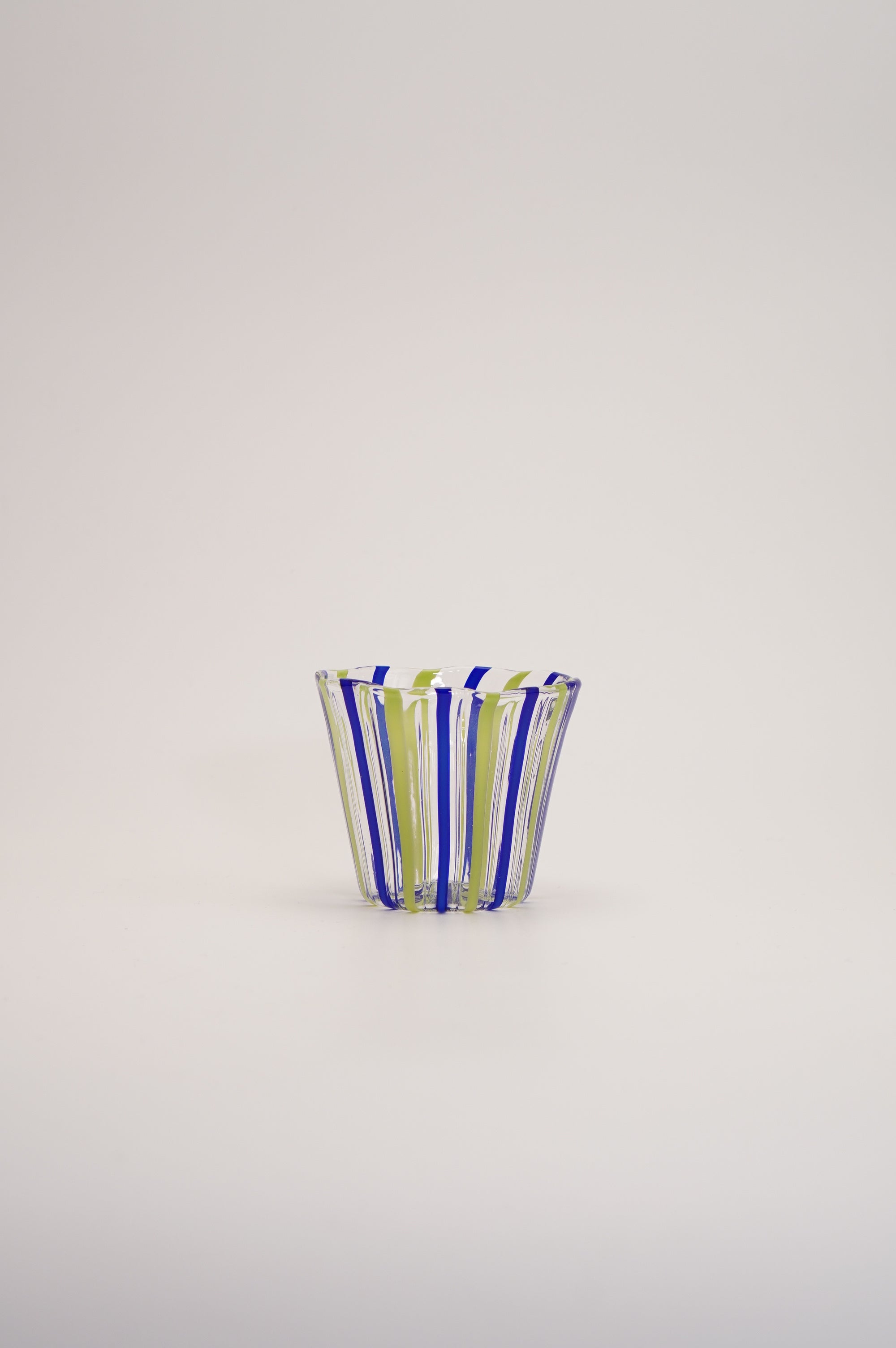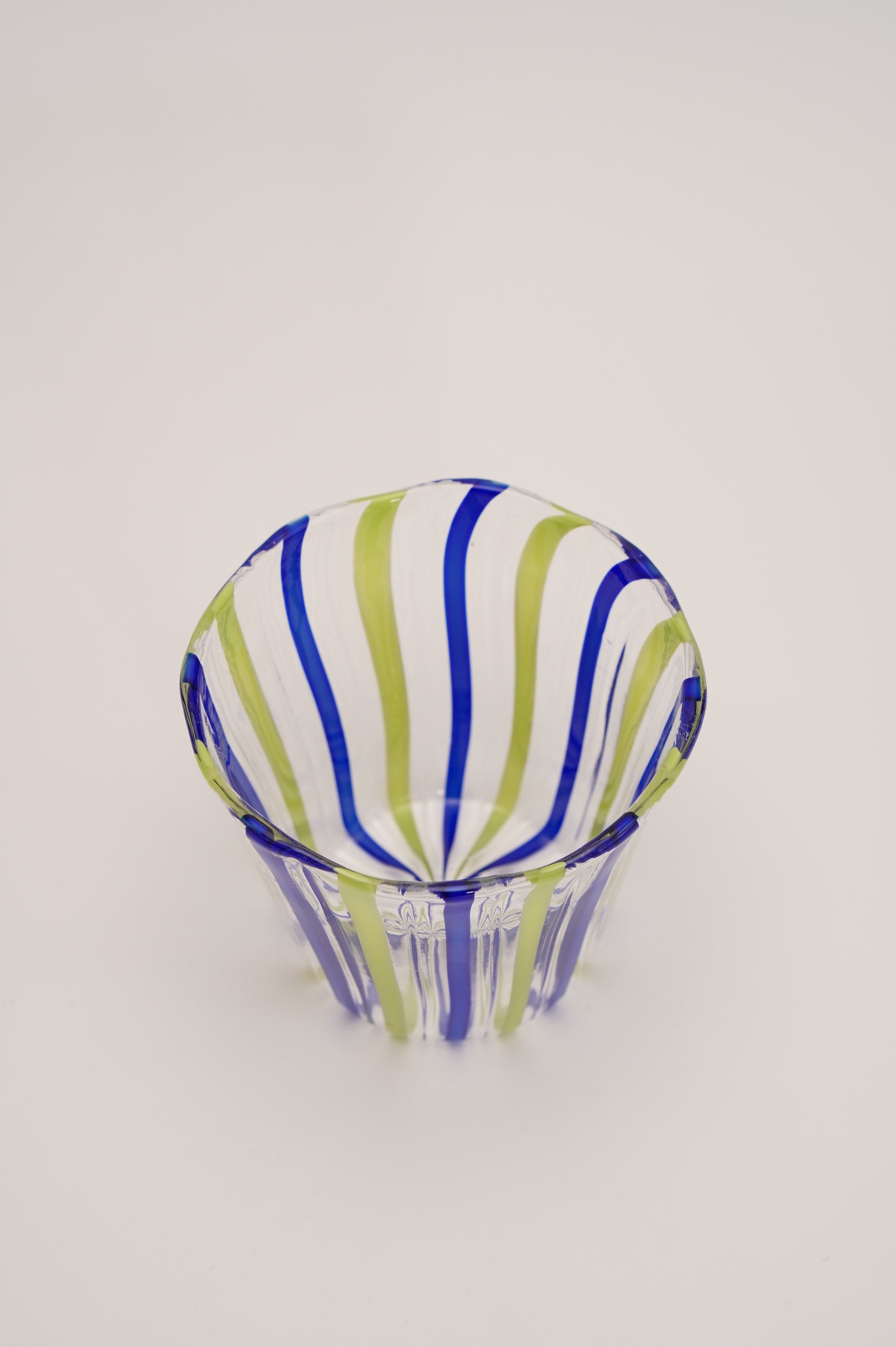 きりっとしたブルーと柔らかな若草色の組み合わせが美しく、スッキリした縦縞が美しいそば猪口。