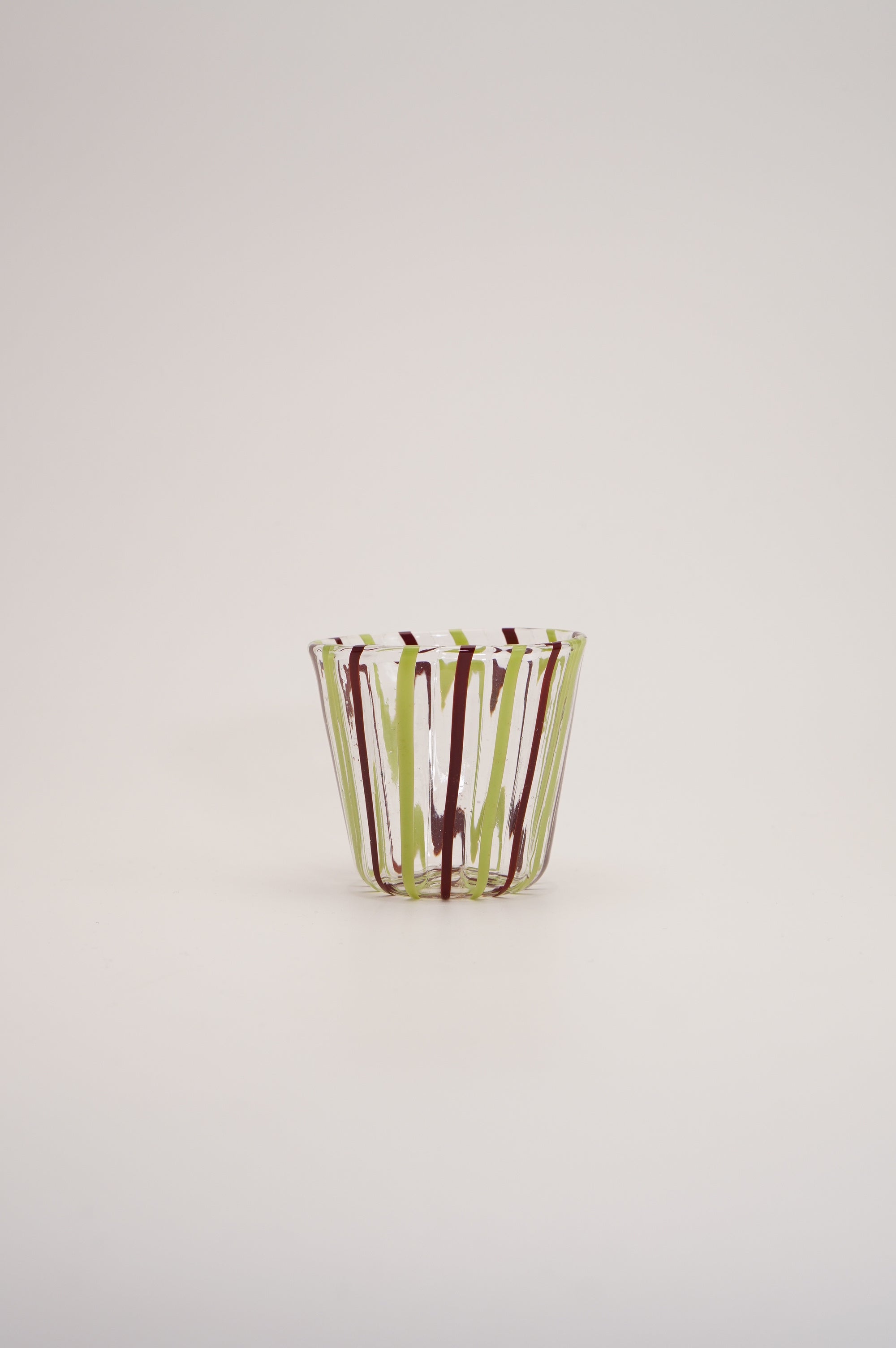 えんじ色と柔らかな若草色の組み合わせが美しく、スッキリした縦縞が美しいそば猪口。