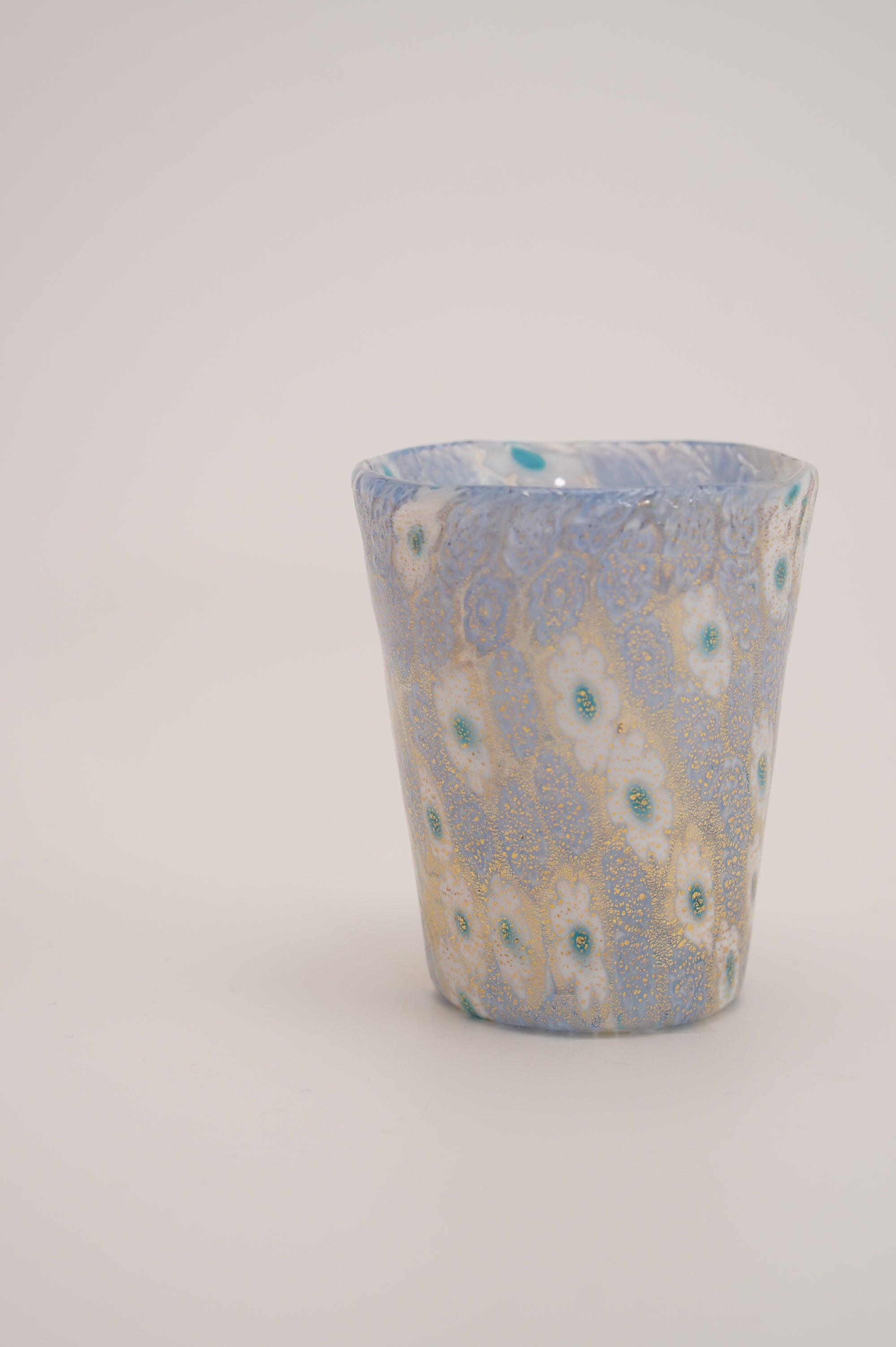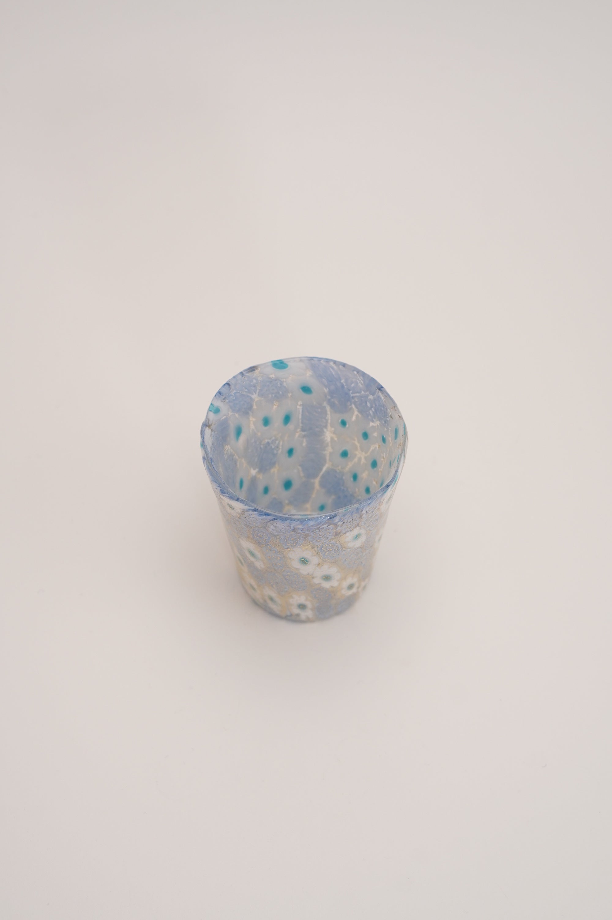 まず断面がお花模様になるようにガラス棒を作り、そのガラスを金太郎飴のようにカットし並べ、ガラスの塊で巻き取った後、マエストロが吹き、形を形成します。