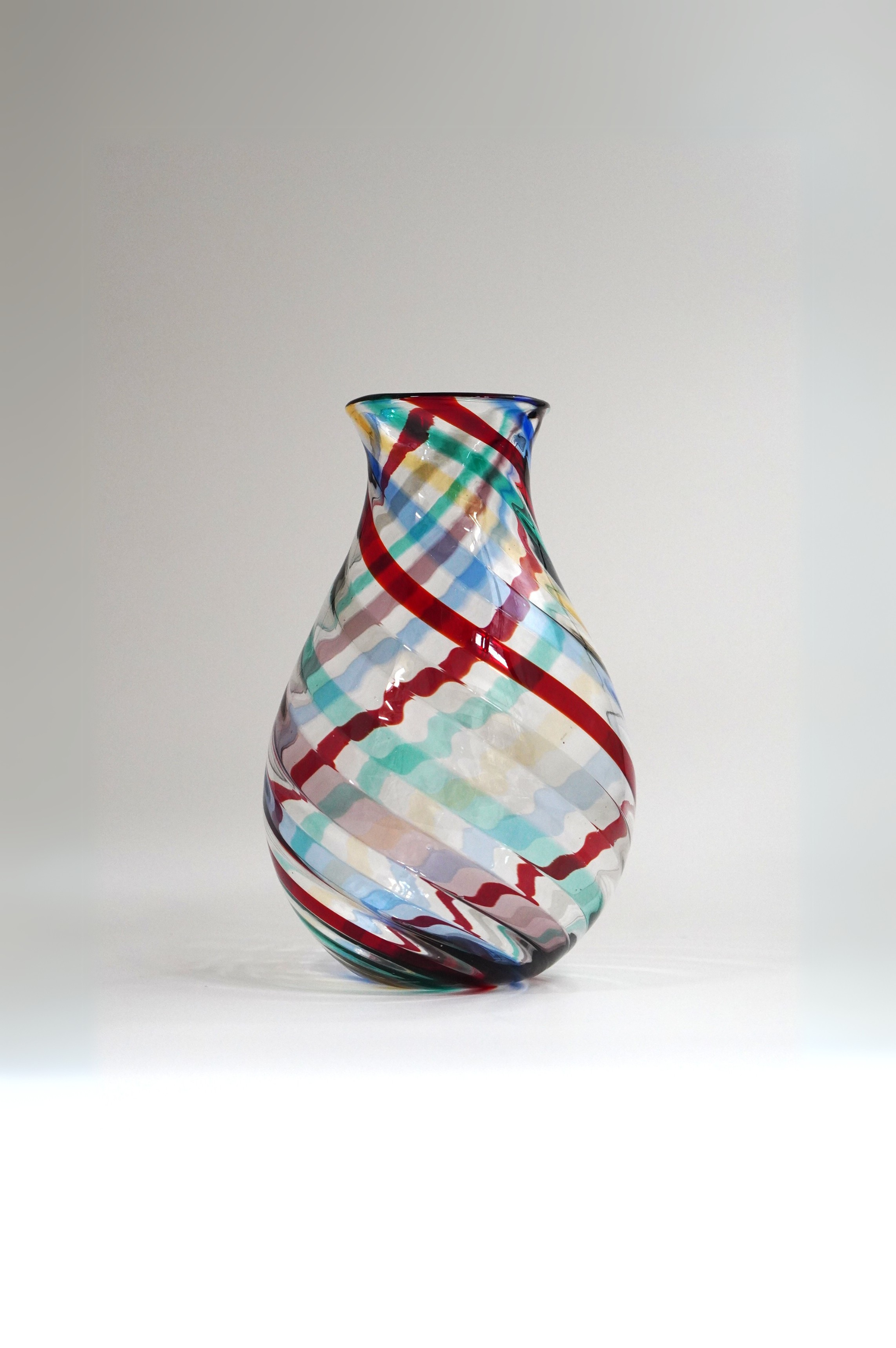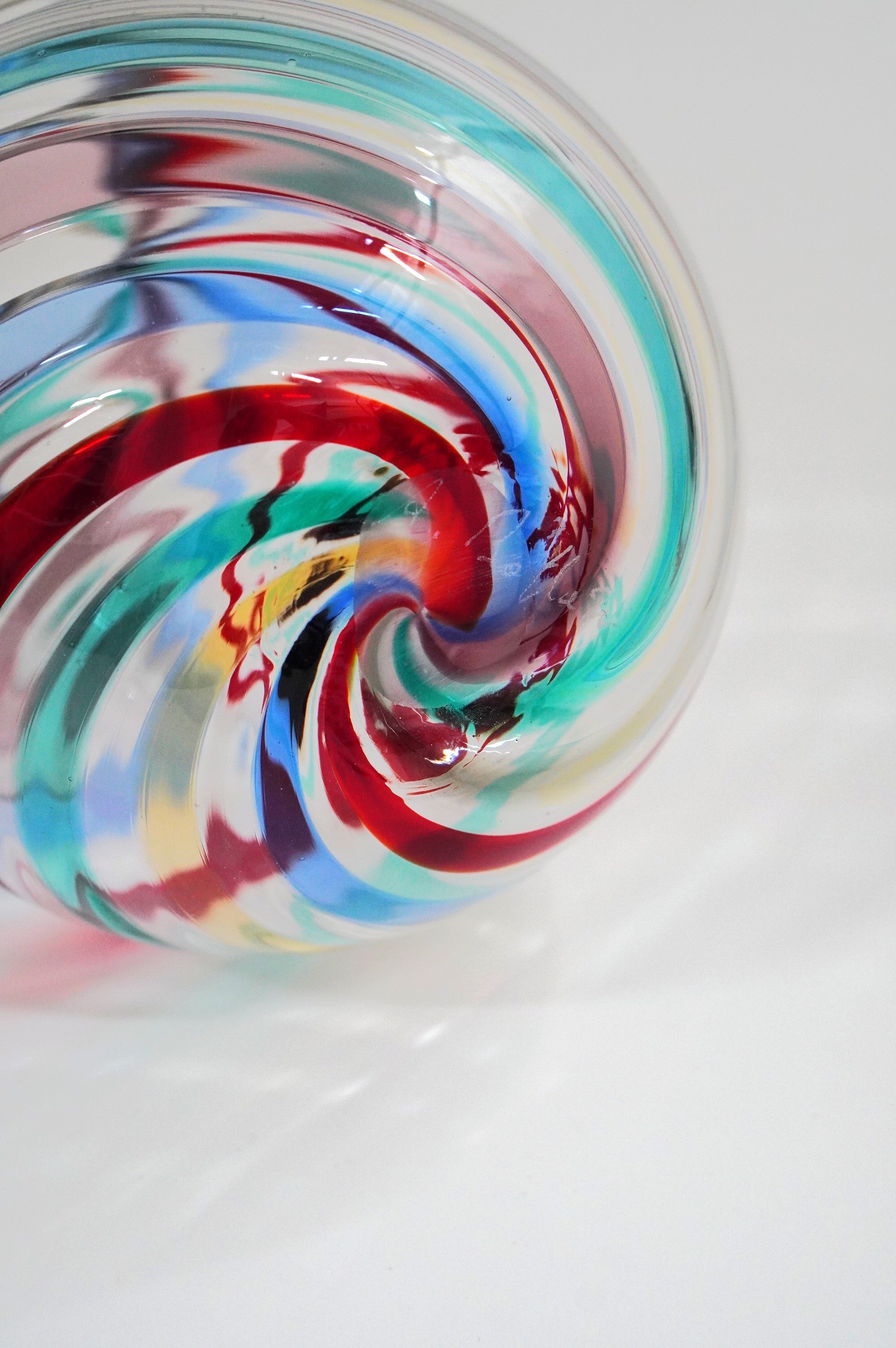とろりと熔けたガラスで色ガラス棒を巻き取り、捻じりながら吹き広げガラスの意のままに躍らせたようなデザイン。