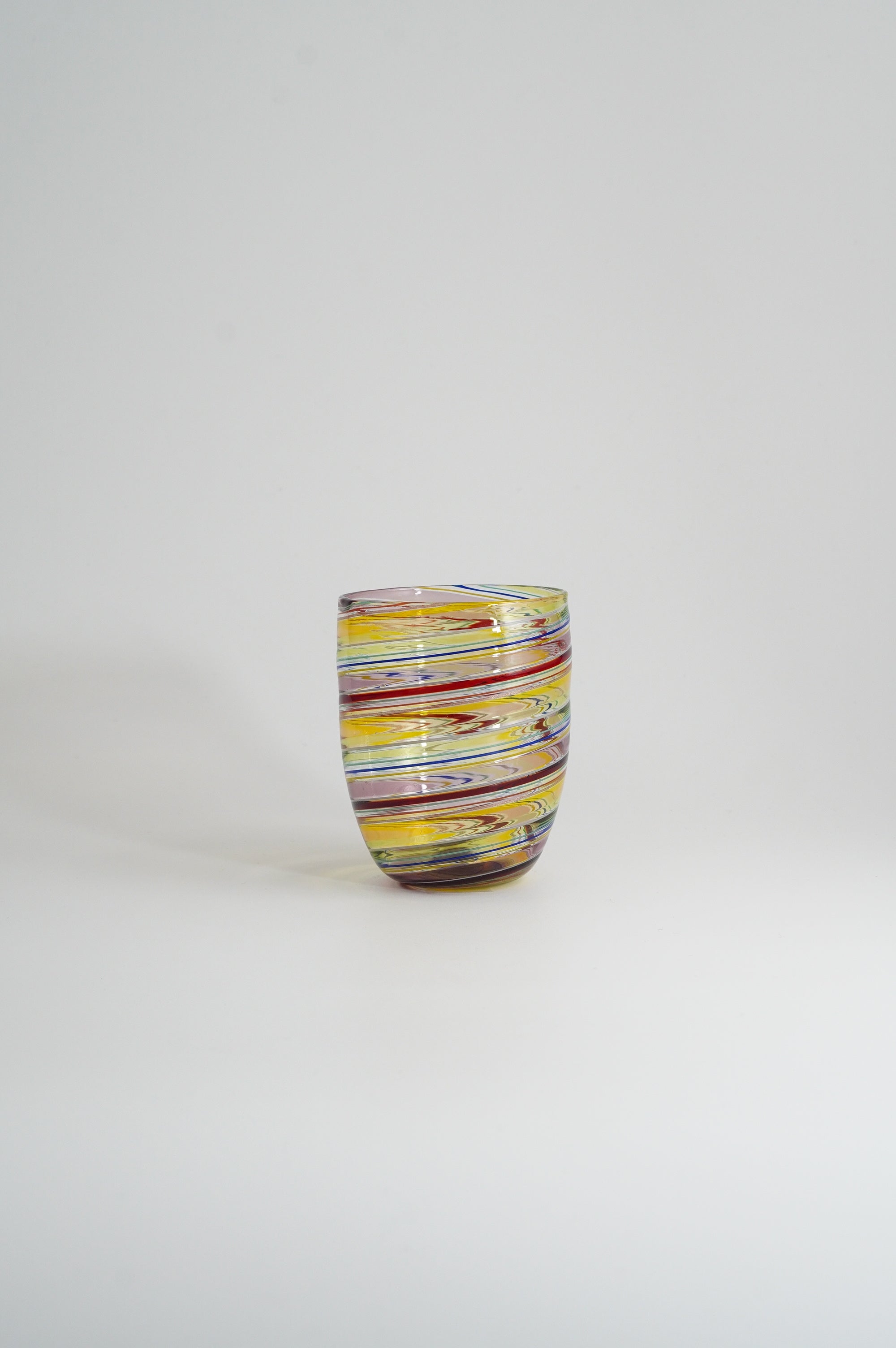 赤、青、黄色、ピンクなどカラフルな色ガラスの細い線がらせん状にめぐる「フィリグラーナ(Filigrana:線状模様)」が美しいグラスです。