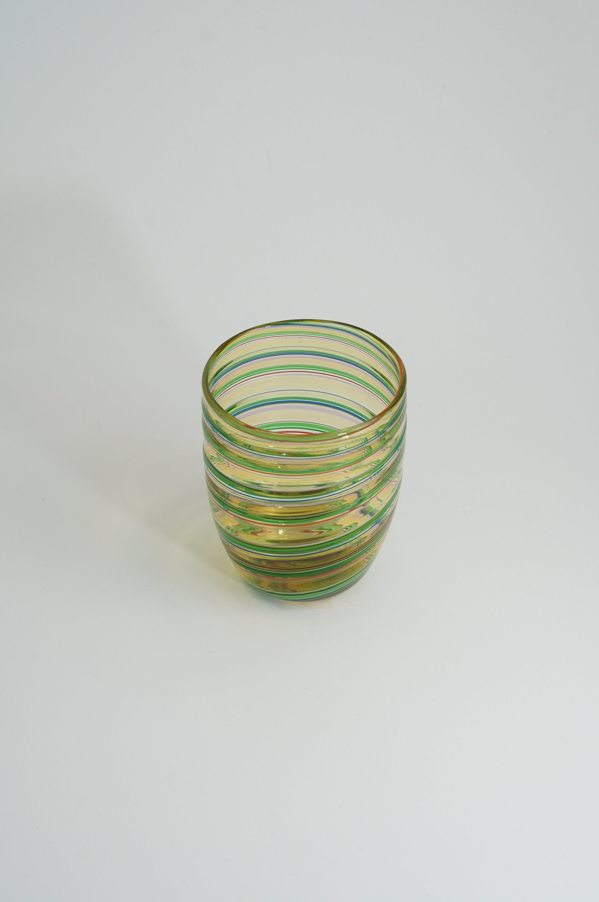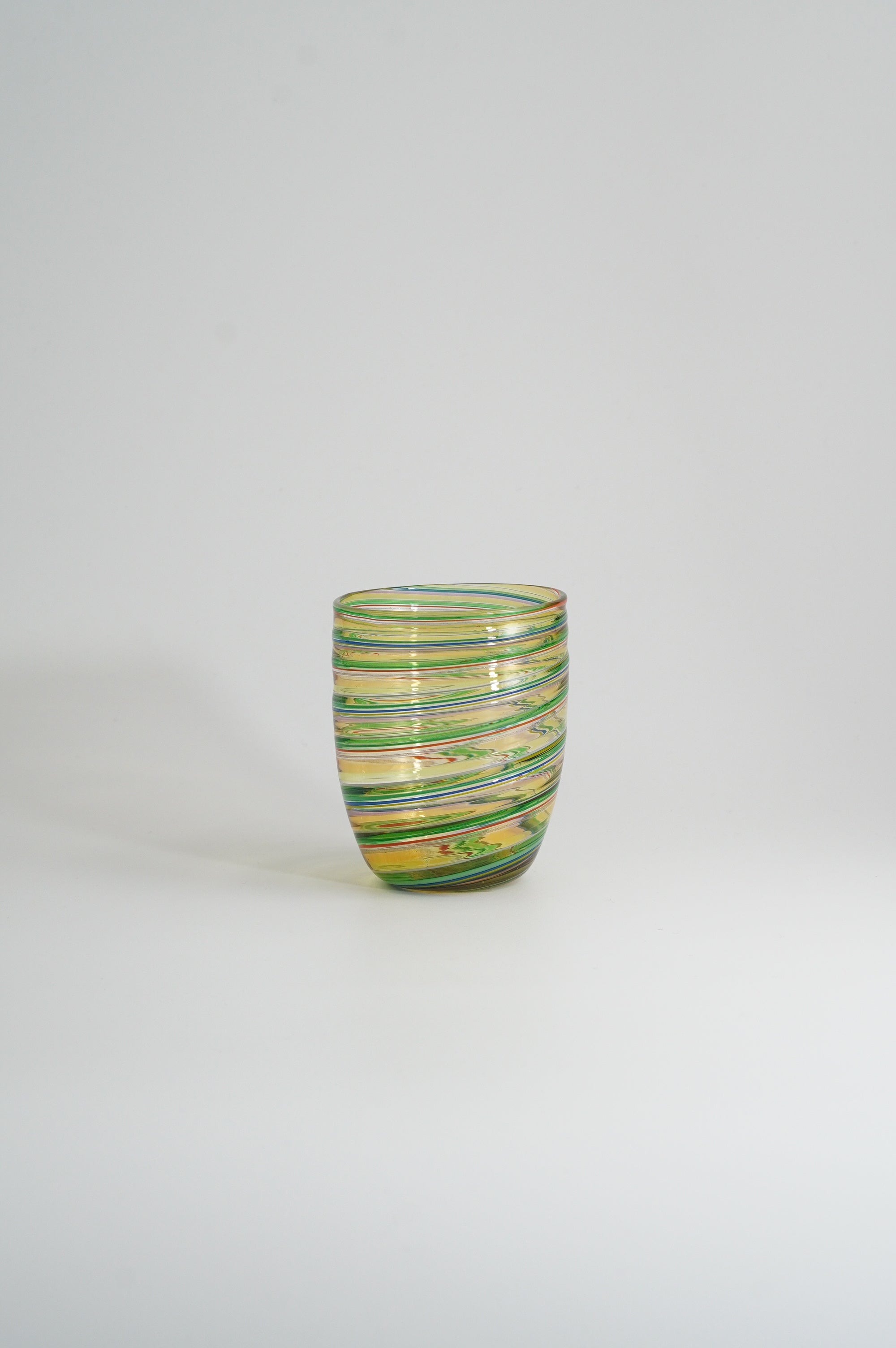 緑、青、黄色、白などカラフルな色ガラスの細い線がらせん状にめぐる「フィリグラーナ(Filigrana:線状模様)」が美しいグラスです。