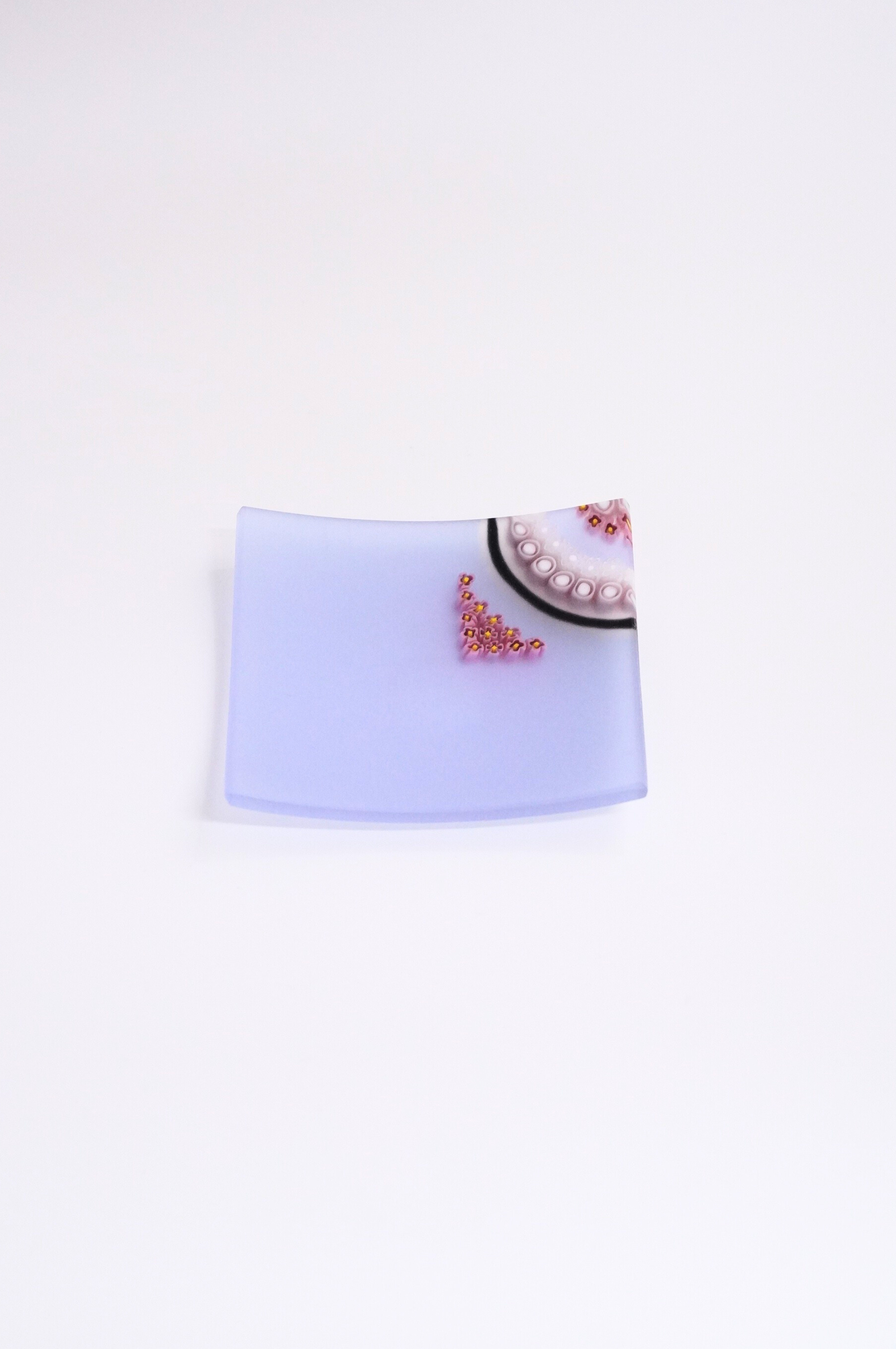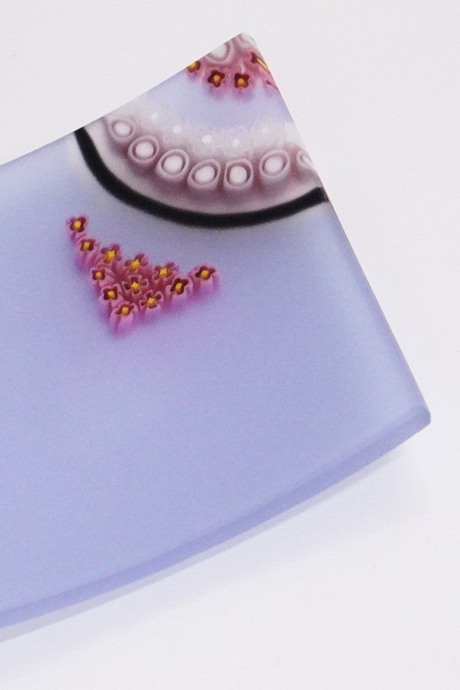 霞のようなアレキサンドライトカラーのプレートの一角にだけ、ムリーネの装飾が施された抽象画のような美しさを持つ一枚。