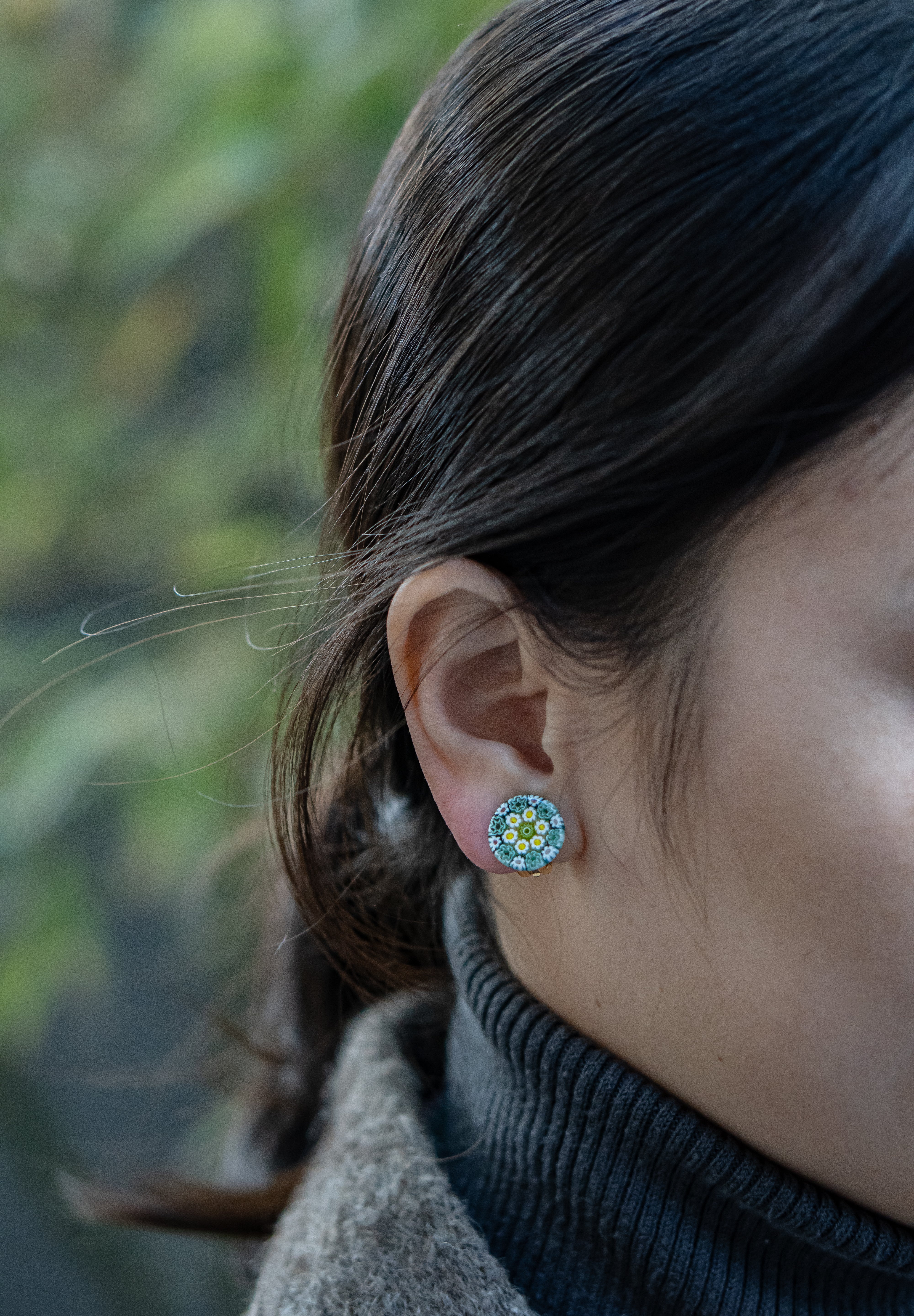 直径約1cmの小さなピースに仕上げるためには、極細に作られたガラス棒を一本一本ピンセットで慎重に並べるという、熟練の技術と忍耐が必要です。ムリーネ模様を丁寧に配置し、低温で焼成した後、丹念に磨き上げることで完成します。