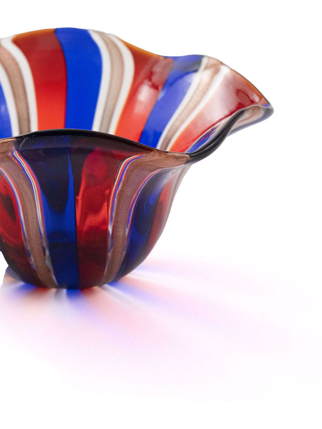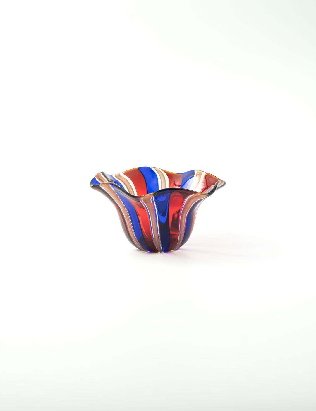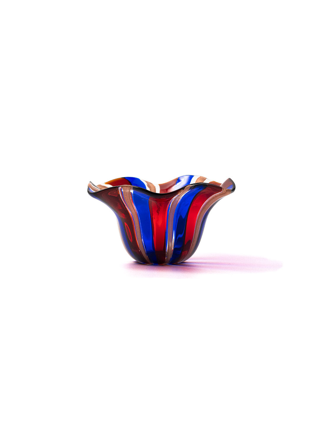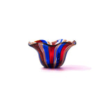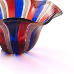 ムラーノガラスらしい鮮やかなカラーと、風に揺れているような柔らかなフォルムは、マエストロが木の棒を当てながら、ひとつひとつ手作りしています。お食事をいれれば、お花が咲いたようにもみえ、より一層食卓を華やかにしてくれます。洗う時もフリルに指をかけられるので、安心して洗うことが出来ます。