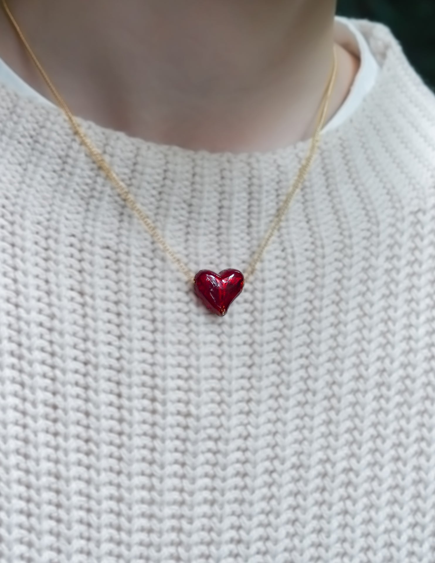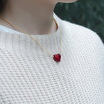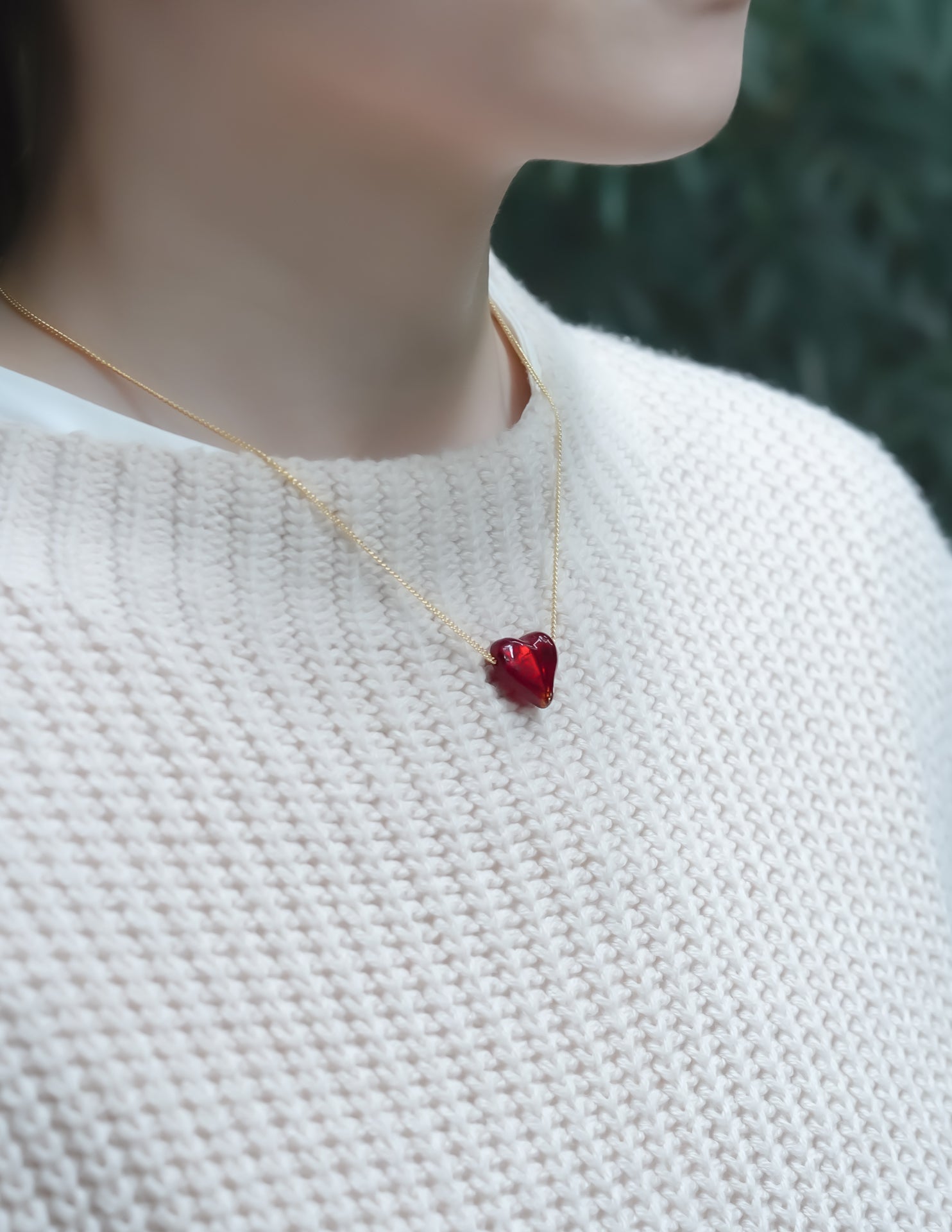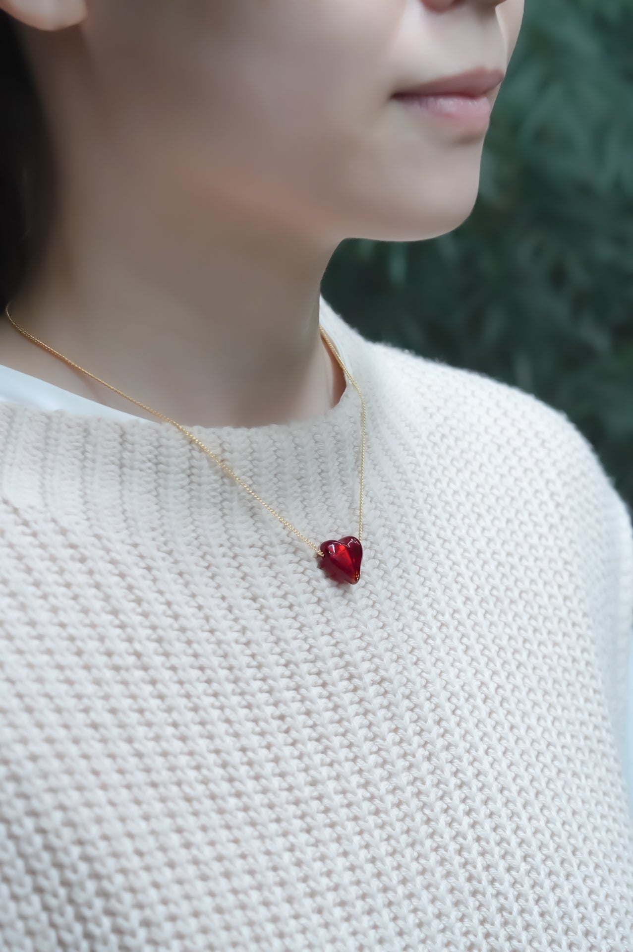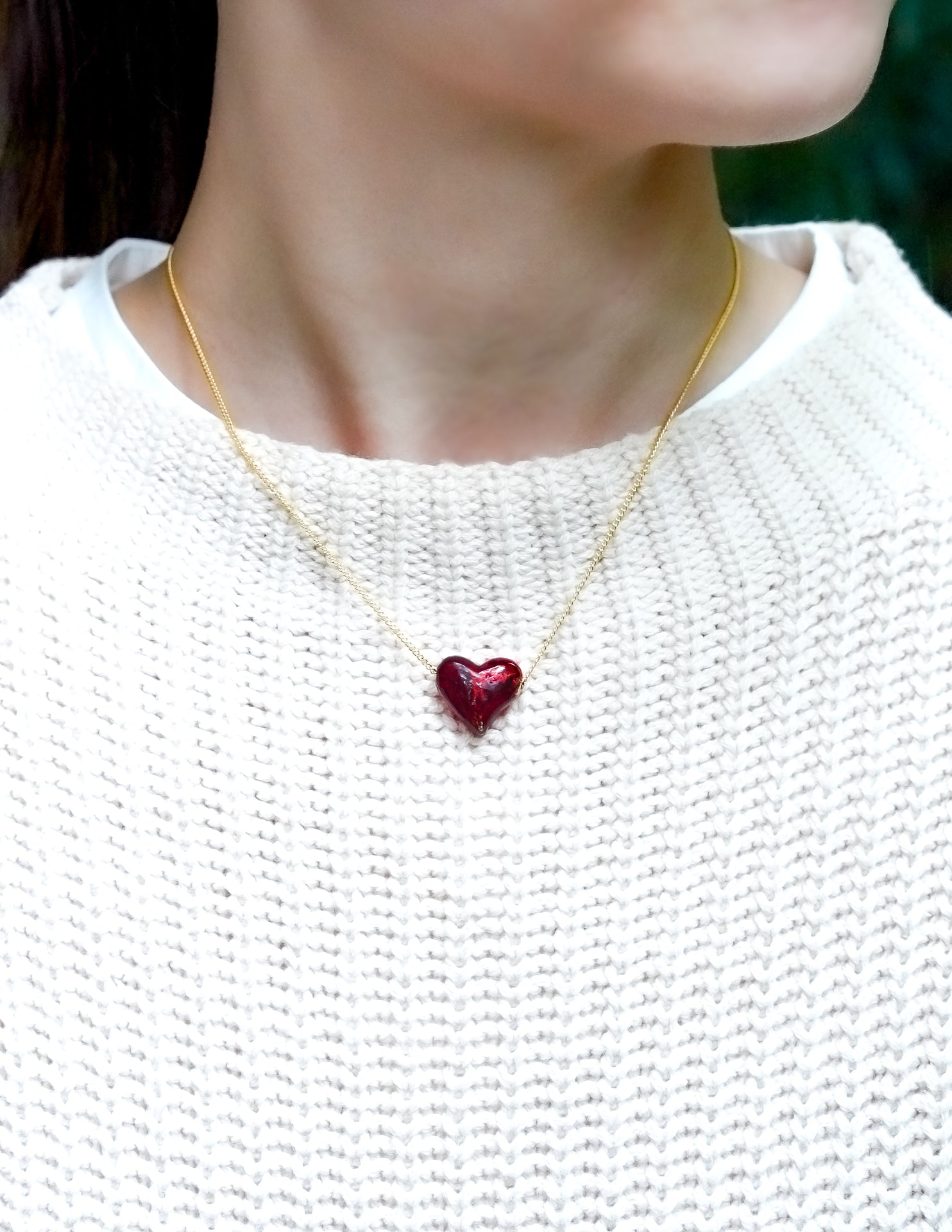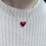 ペンダントは、24金箔の上から深紅のガラスを重ね、愛らしいハート型に仕上げています。その確かな存在感とデザインの美しさは、さまざまなスタイルに自然と馴染みます。深みのある赤色は、年代を問わず多くの方にご愛用いただけることでしょう。