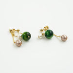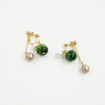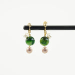 その名の通り、クリスマスをイメージした緑のビーズに、光沢のあるガラスパールを合わせました。不思議な色合いの緑のビーズは天然石で、見る角度によって深い緑から爽やかな色味と表情を変えます。キャッチから垂れ下がるピンクのガラスパールがゆらゆらと揺れ、遊び心と上品さを兼ね備えた、聖夜にぴったりのイヤリングです。