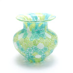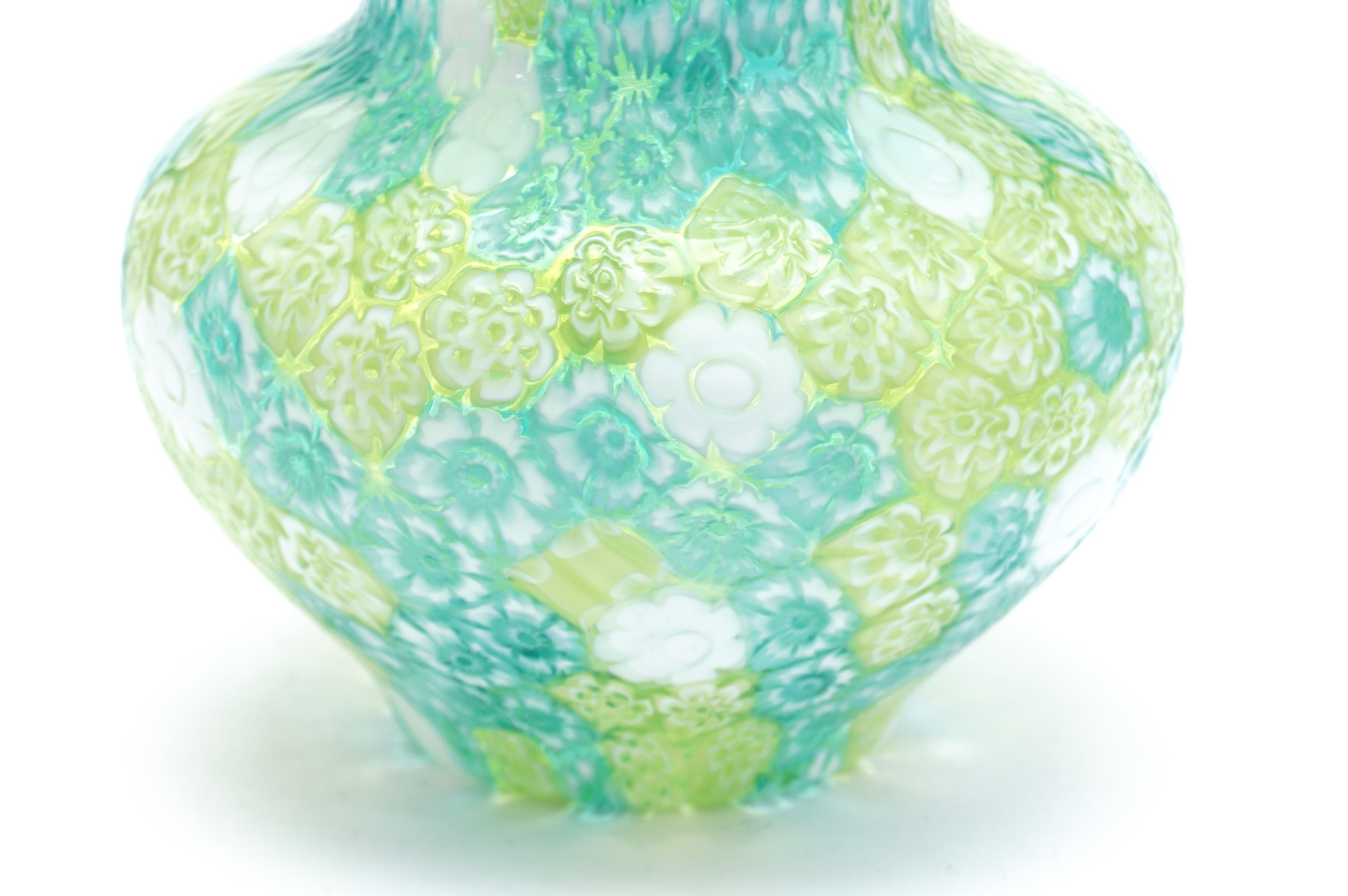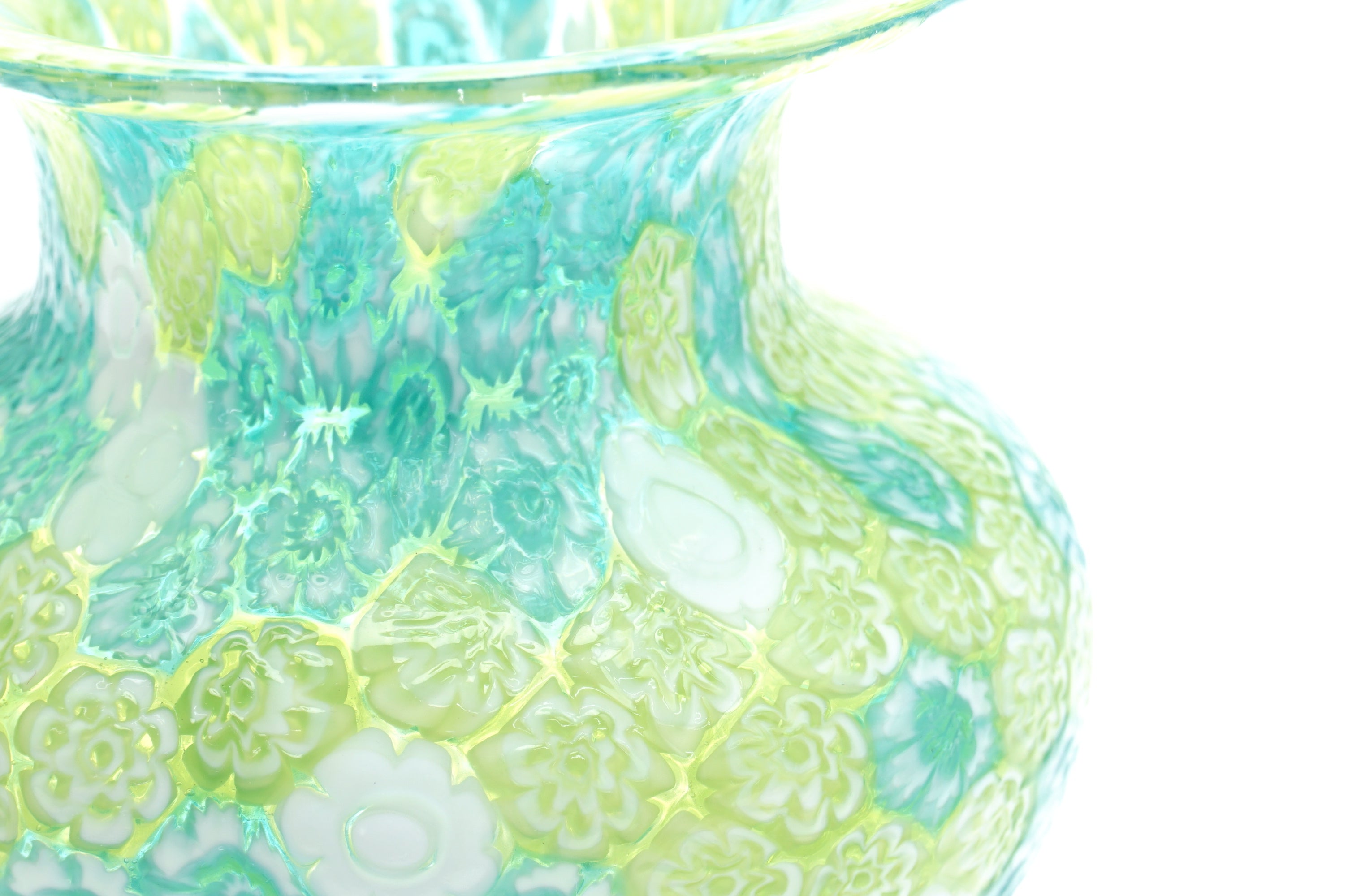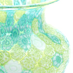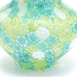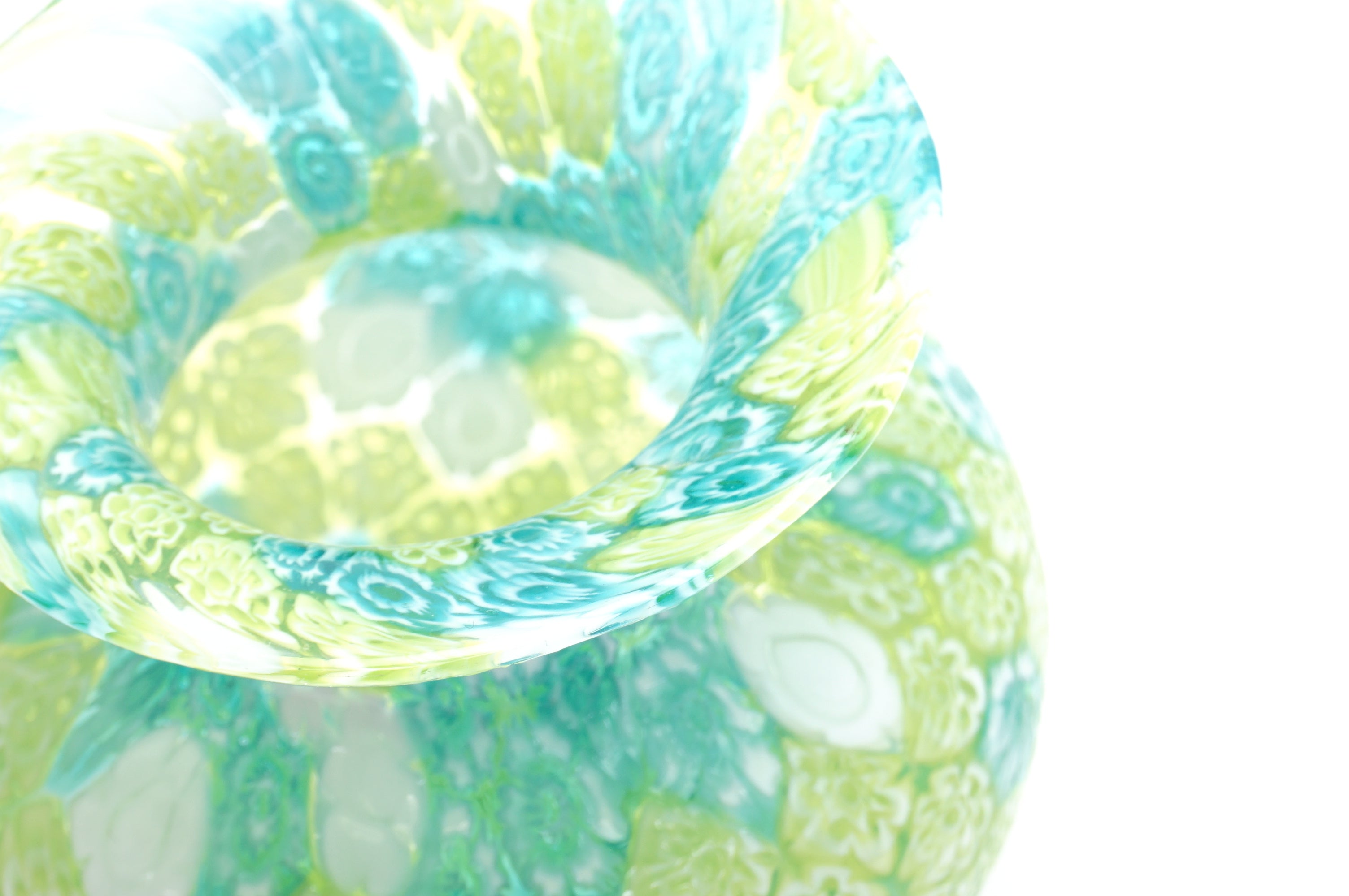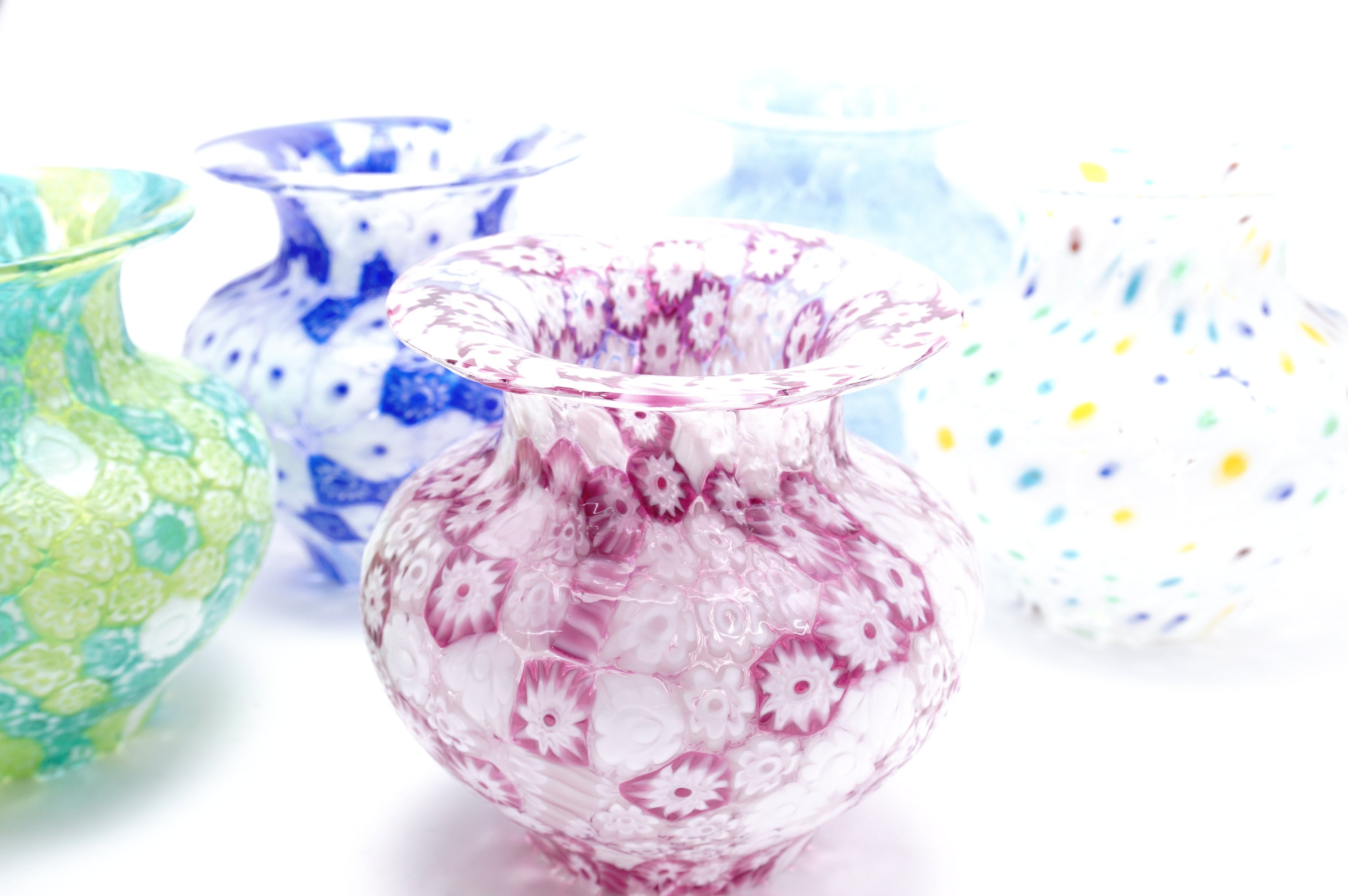 こちらの花器は、まず断面がお花模様になるようにガラス棒を作り、そのガラスを金太郎飴のようにカットし並べ、ガラスの塊で巻き取った後、マエストロが吹き、形を形成します。