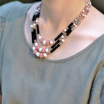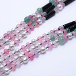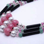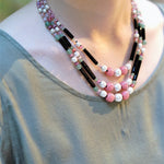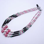 そこに日本製のガラスパール、乳白ピンクのヴィンテージアフリカンビーズ、さらには大小さまざまなヴィンテージガラスビーズつかいデザインいたしました。
