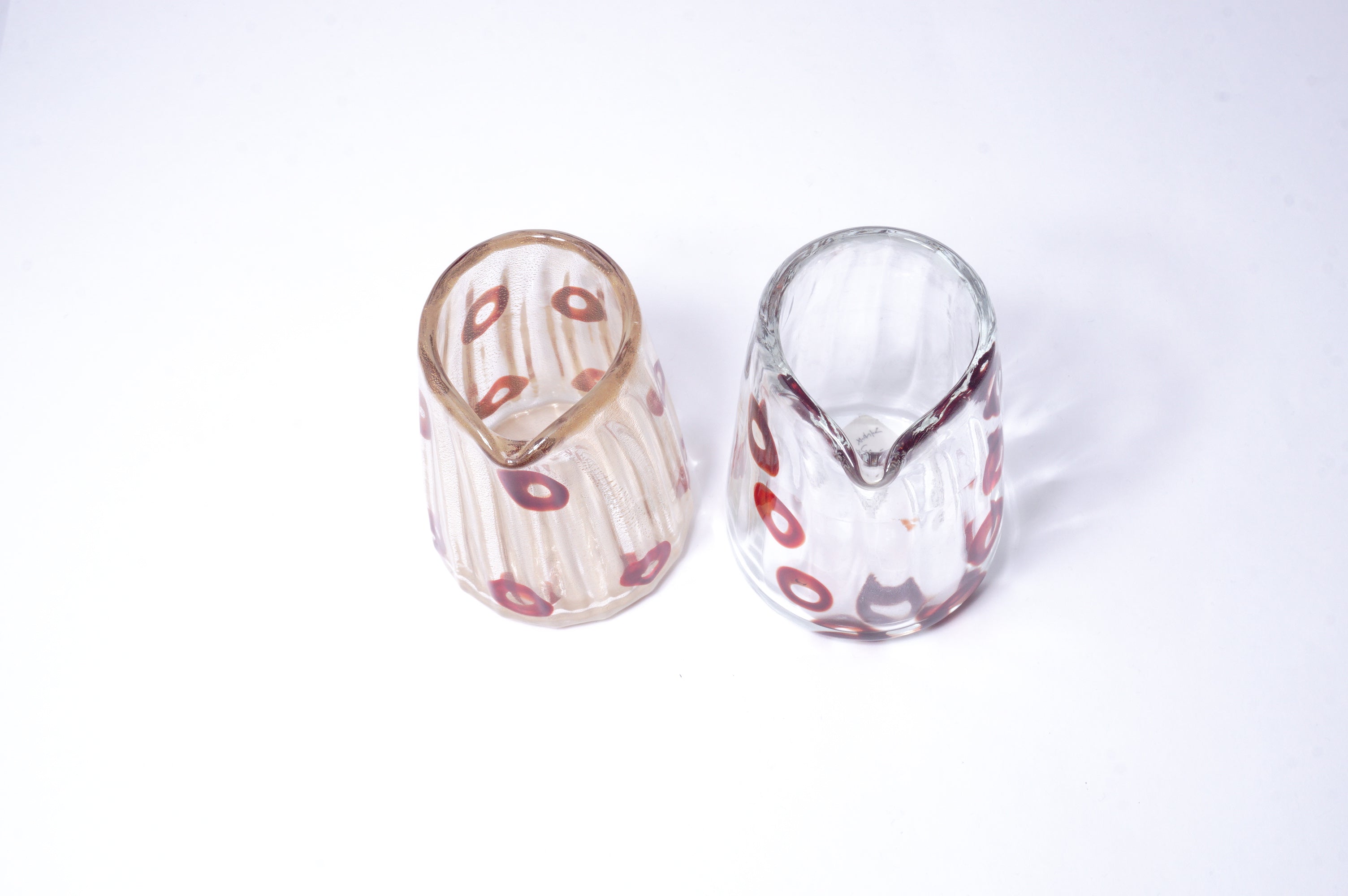 吹きガラスにおいては、制作途中に発生する小さな気泡や黒点、底面にポンテ跡(吹き竿を外した際の凹凸)がある場合がございます。
