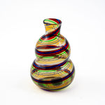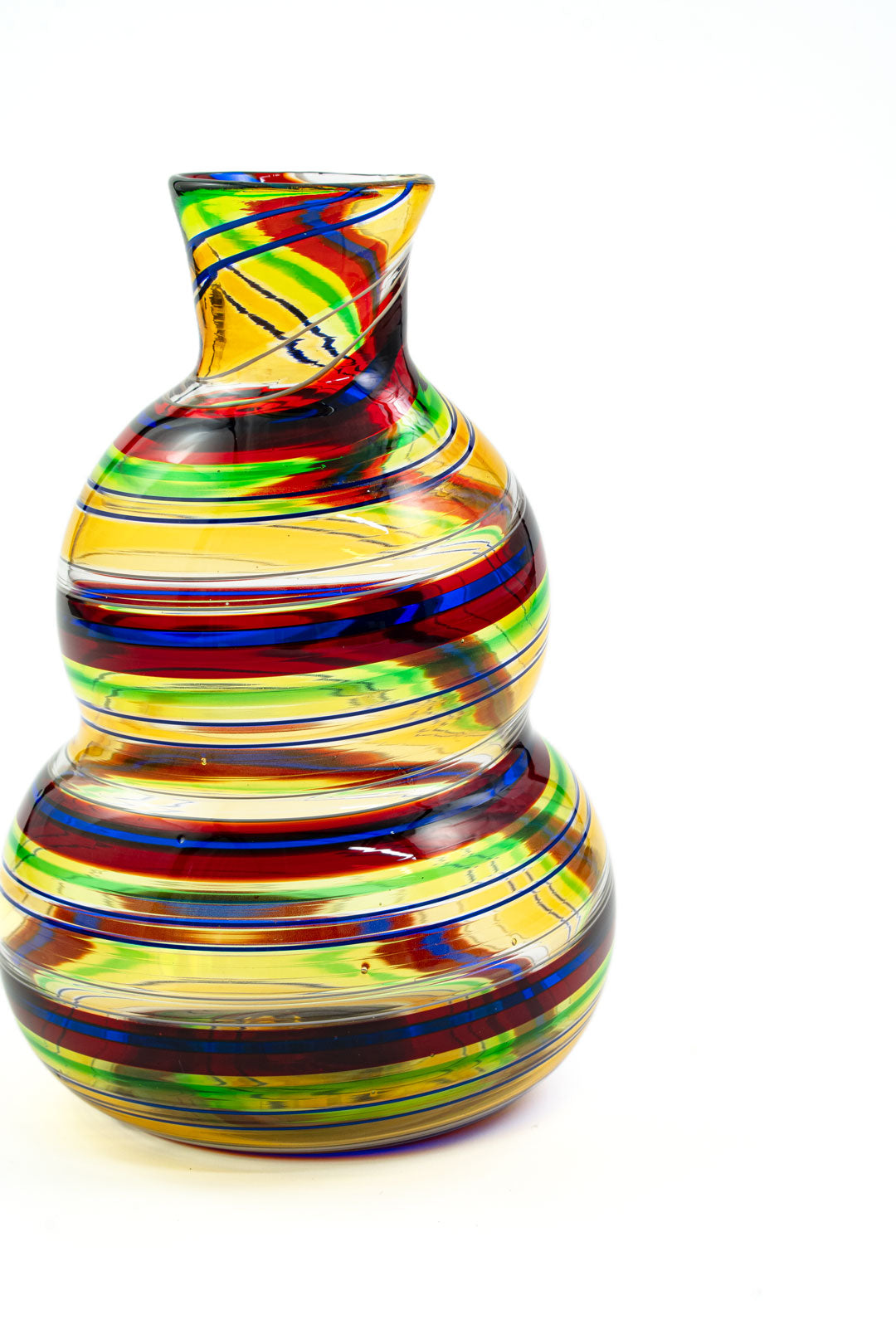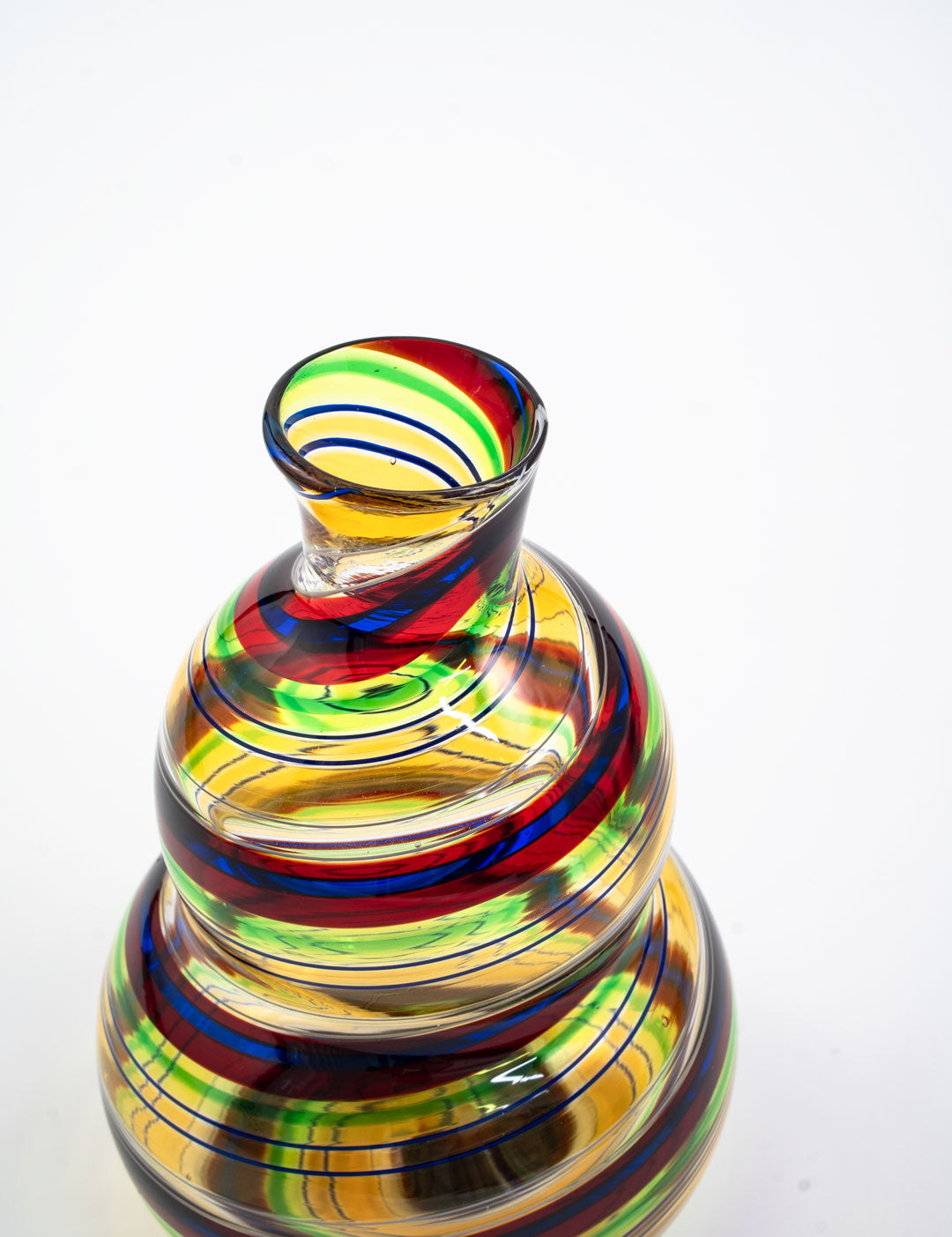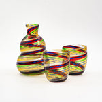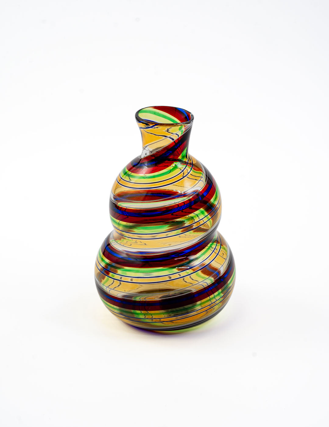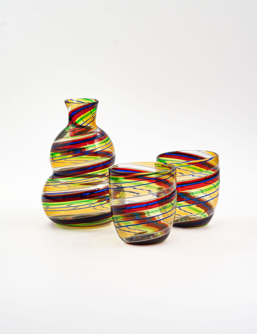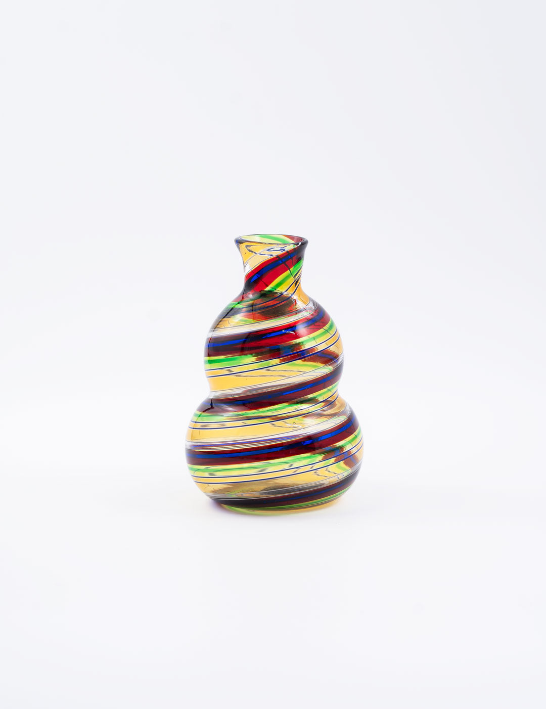 こちらの徳利は小瀧千佐子がデザインをした商品で、ガラスの色合わせからフォルムまでこだわりを貫いた逸品です。一見シンプルなデザインですが、よく見ると様々なガラス棒を使い、そのひとつひとつを見ていても飽きない商品です。
