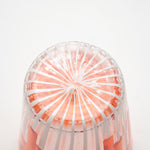 こちらのコロラートは、他の多くのムラーノガラス同様、縦方向にガラス棒が並べて使われています。しかし、一般的にはガラス棒はすべて同じ長さに整えてから成形するのに対し、色ガラス棒とフィリグラーナ(鉛筆の芯のように中心の白色のガラスを配したガラス棒)の長さを全ての列で異なる長さで組み合わせてから同じ長さにそろえるという、大変手間のかかる制作工程を踏んでいます。そのため、色ガラスの長さがランダムで、ユニークな表情をみせています。