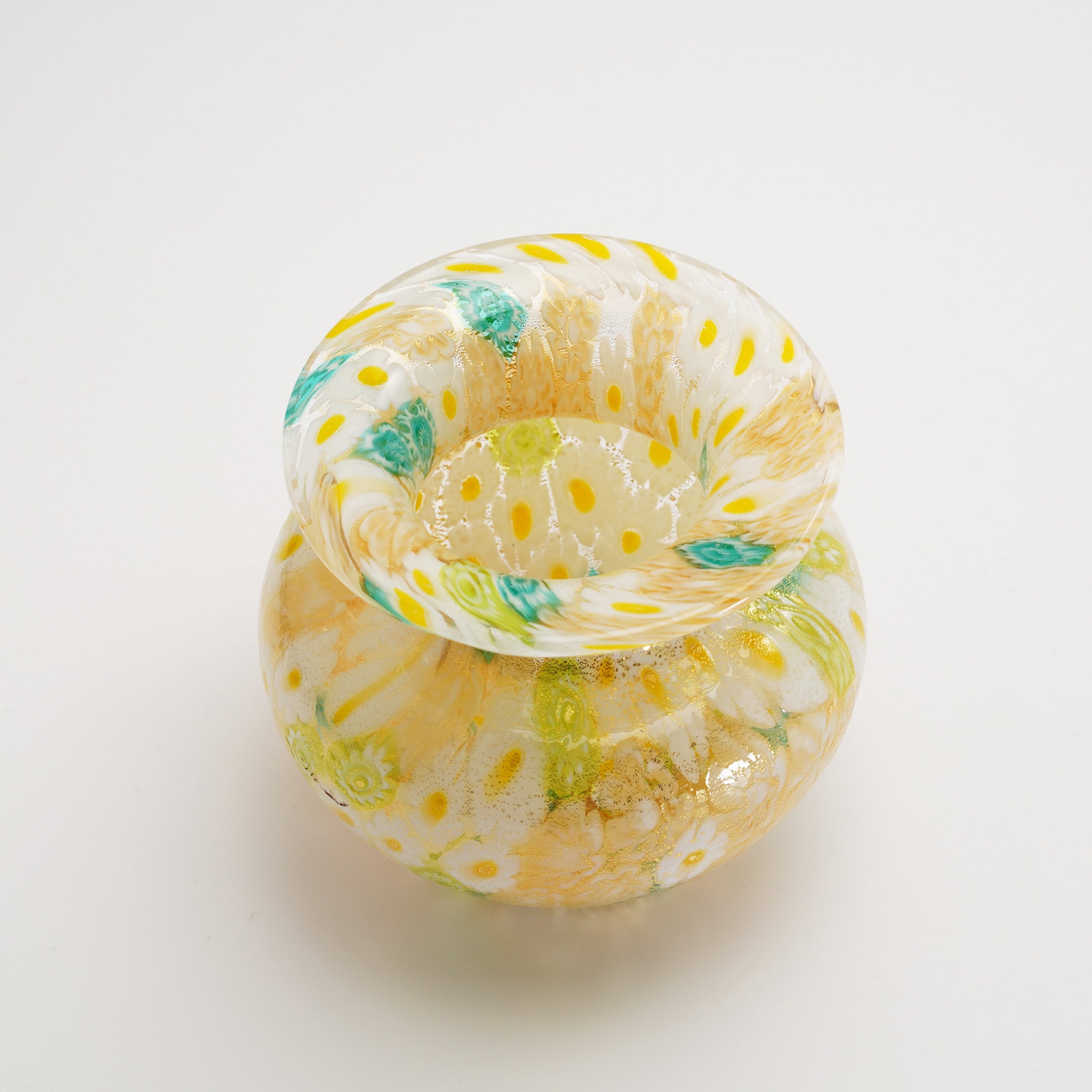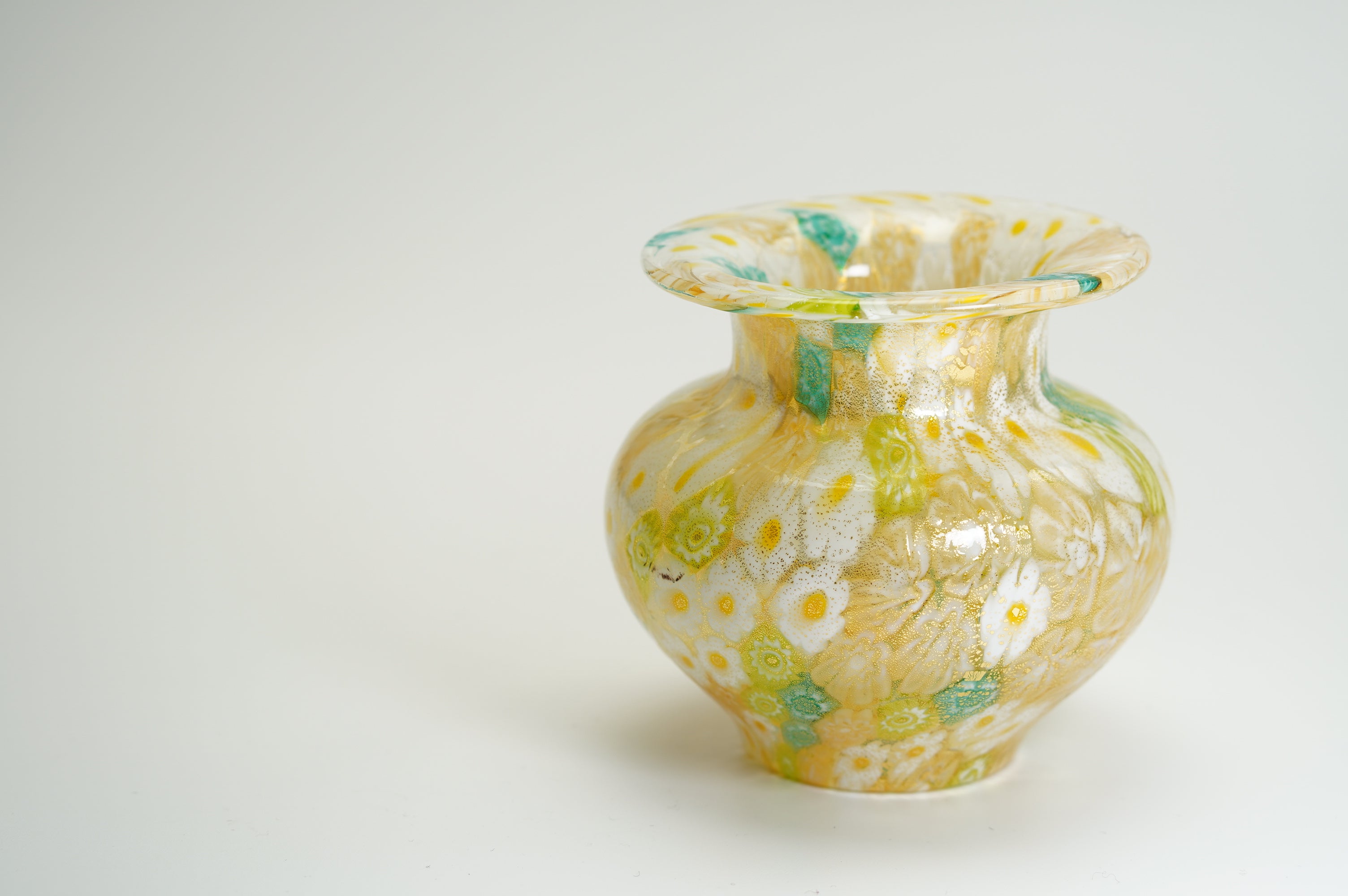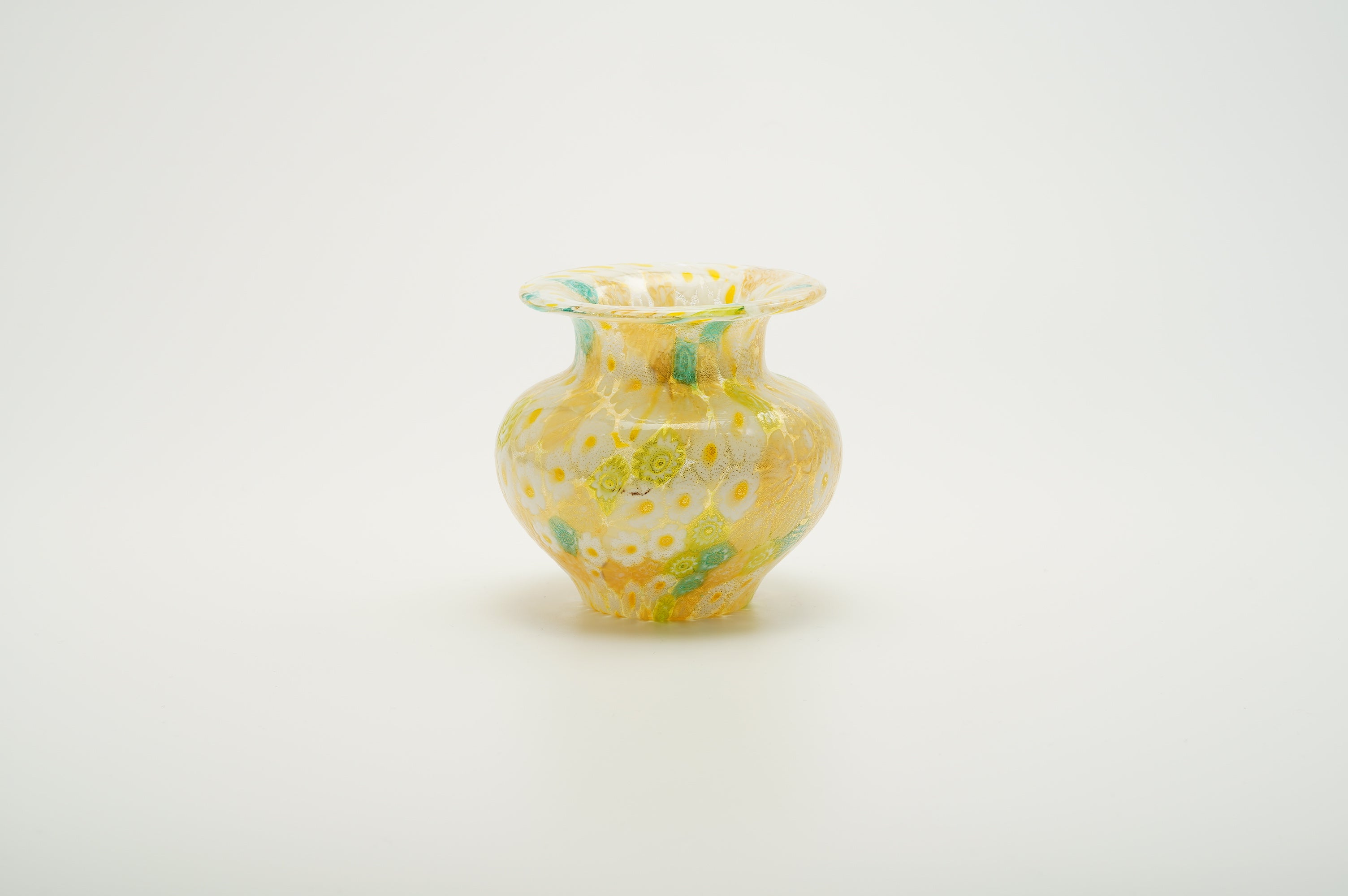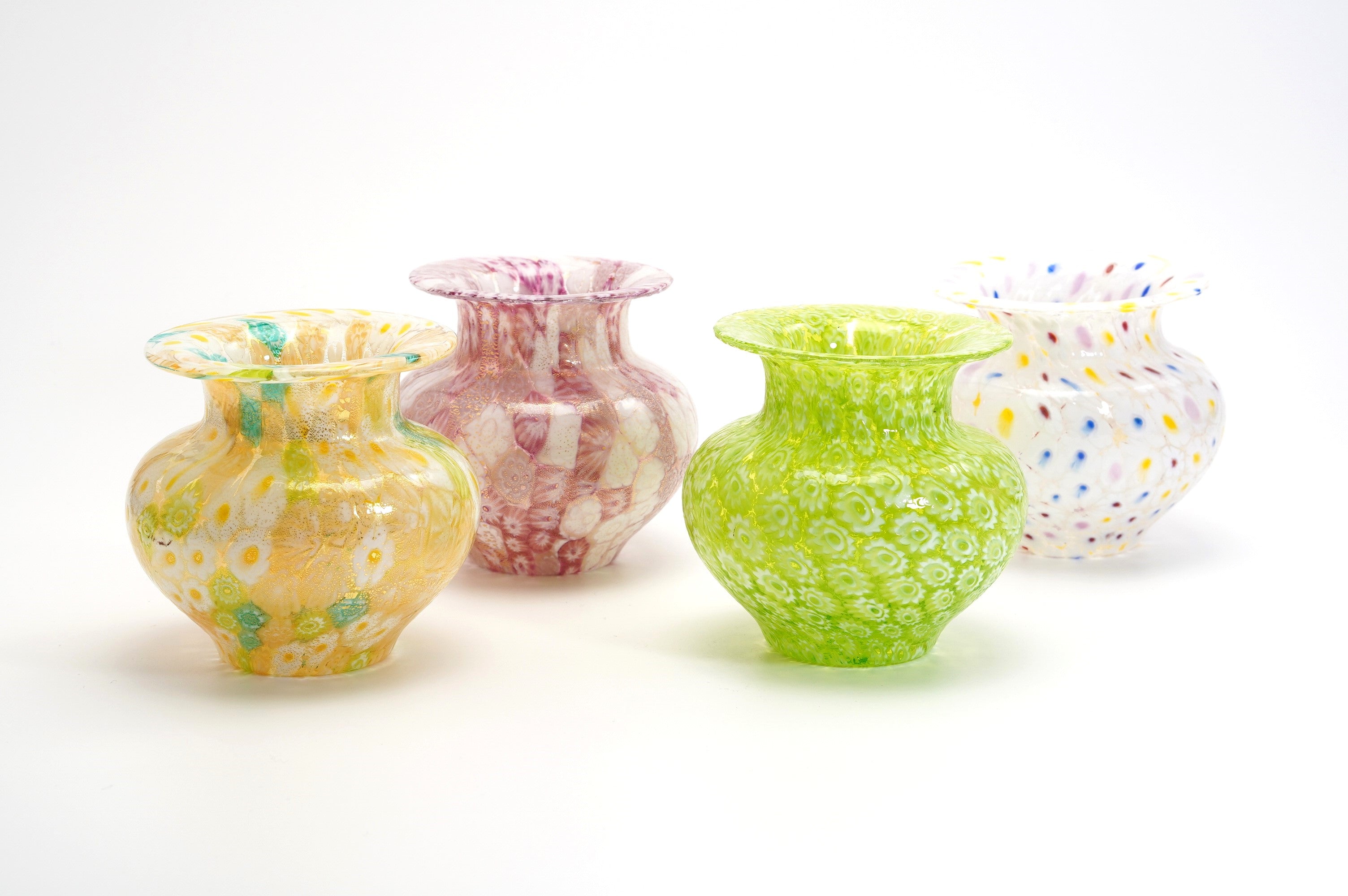 こちらの花器は、まず断面がお花模様になるようにガラス棒を作り、そのガラスを金太郎飴のようにカットし並べ、ガラスの塊で巻き取った後、マエストロが吹き、形を形成します。一つ一つ手づくりでつくられるムリーネガラスは、それぞれに個性をもって可愛らしい表情をみせてくれます。