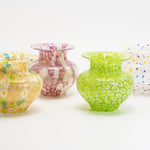 こちらの花器は、まず断面がお花模様になるようにガラス棒を作り、そのガラスを金太郎飴のようにカットし並べ、ガラスの塊で巻き取った後、マエストロが吹き、形を形成します。