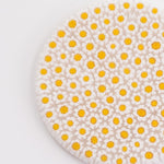 白と黄色のマーガレット模様がぎっしりと敷き詰められ、華やかでありながらも清楚な印象。