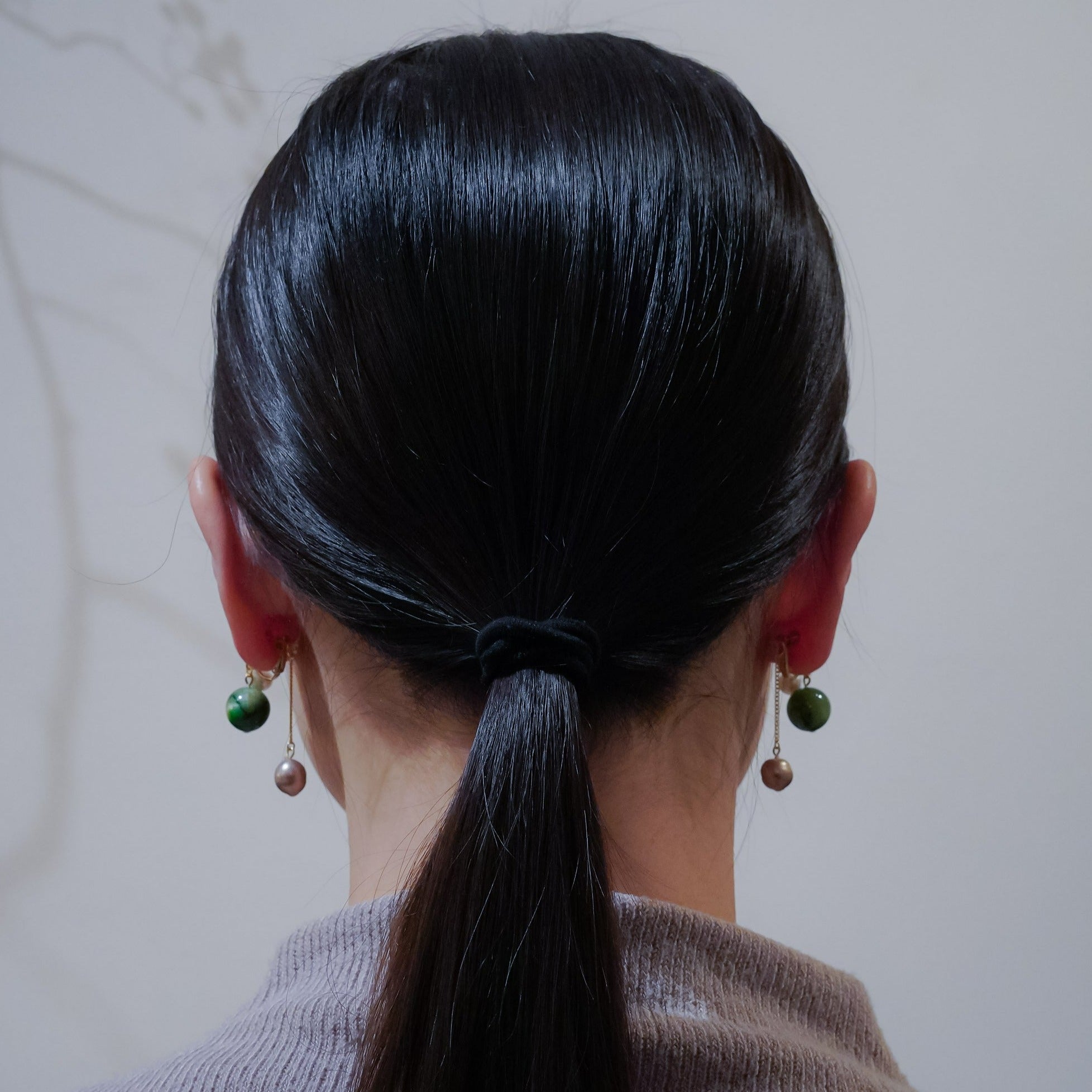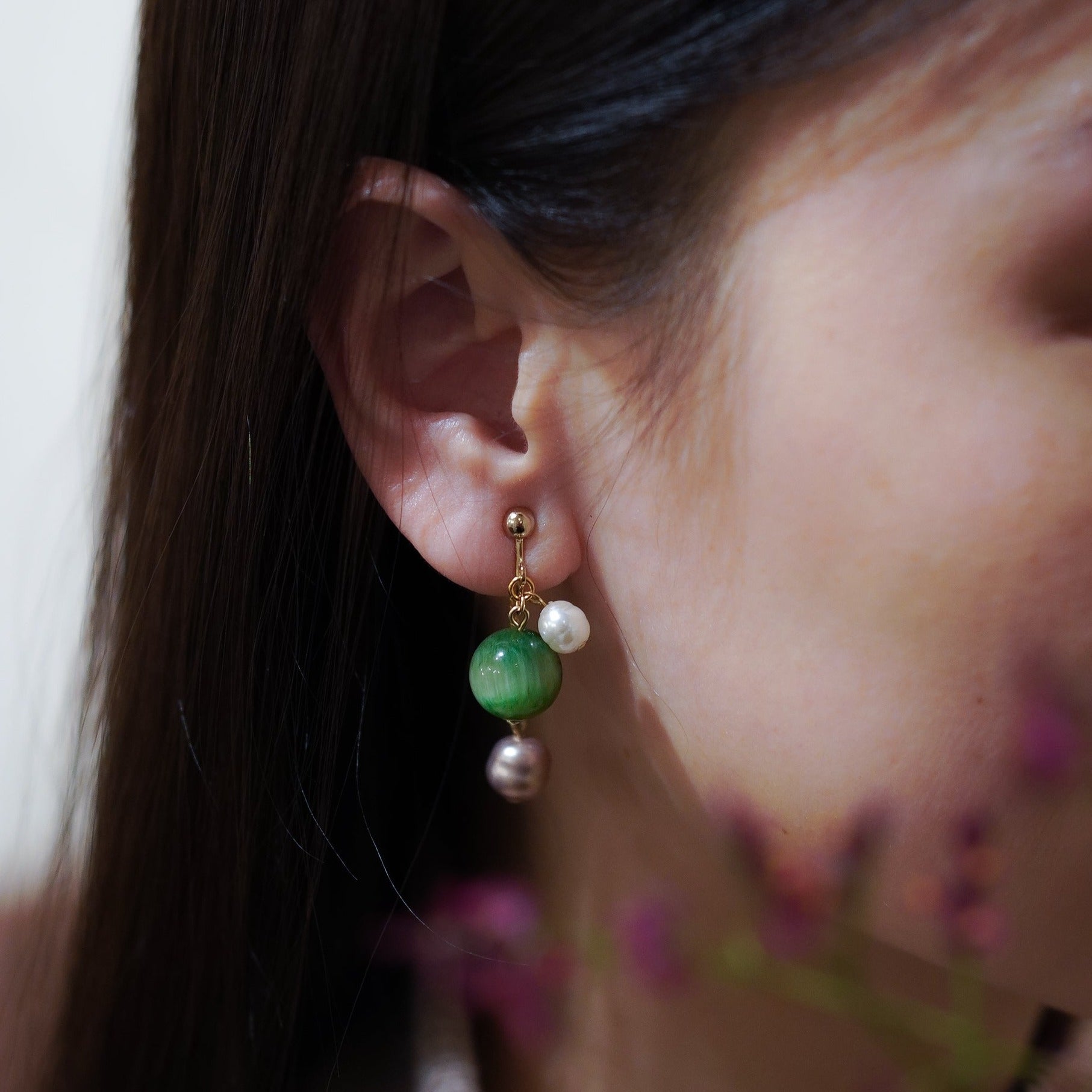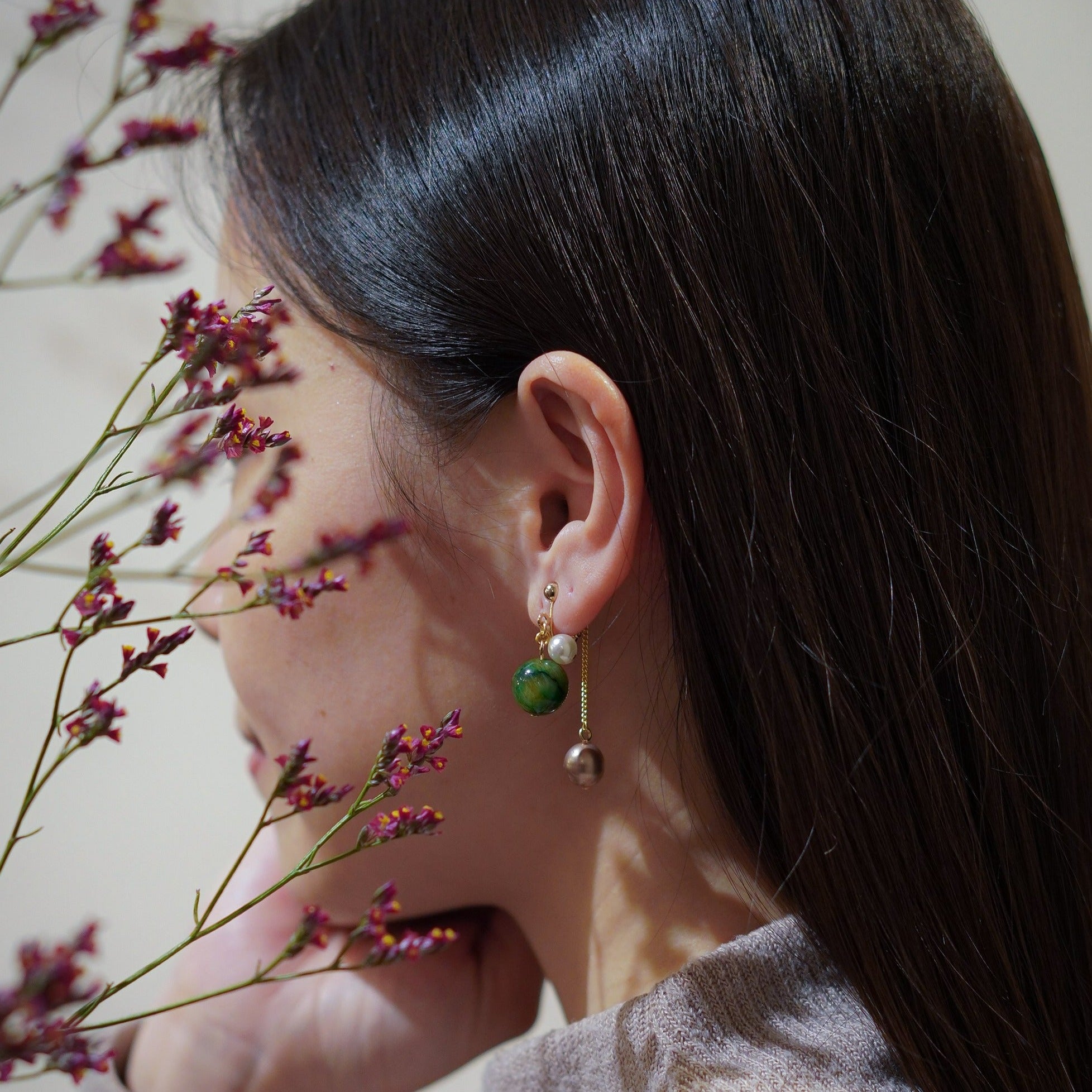 その名の通り、クリスマスをイメージした緑のビーズに、光沢のあるガラスパールを合わせました。不思議な色合いの緑のビーズは天然石で、見る角度によって深い緑から爽やかな色味と表情を変えます。キャッチから垂れ下がるピンクのガラスパールがゆらゆらと揺れ、遊び心と上品さを兼ね備えた、聖夜にぴったりのイヤリングです。