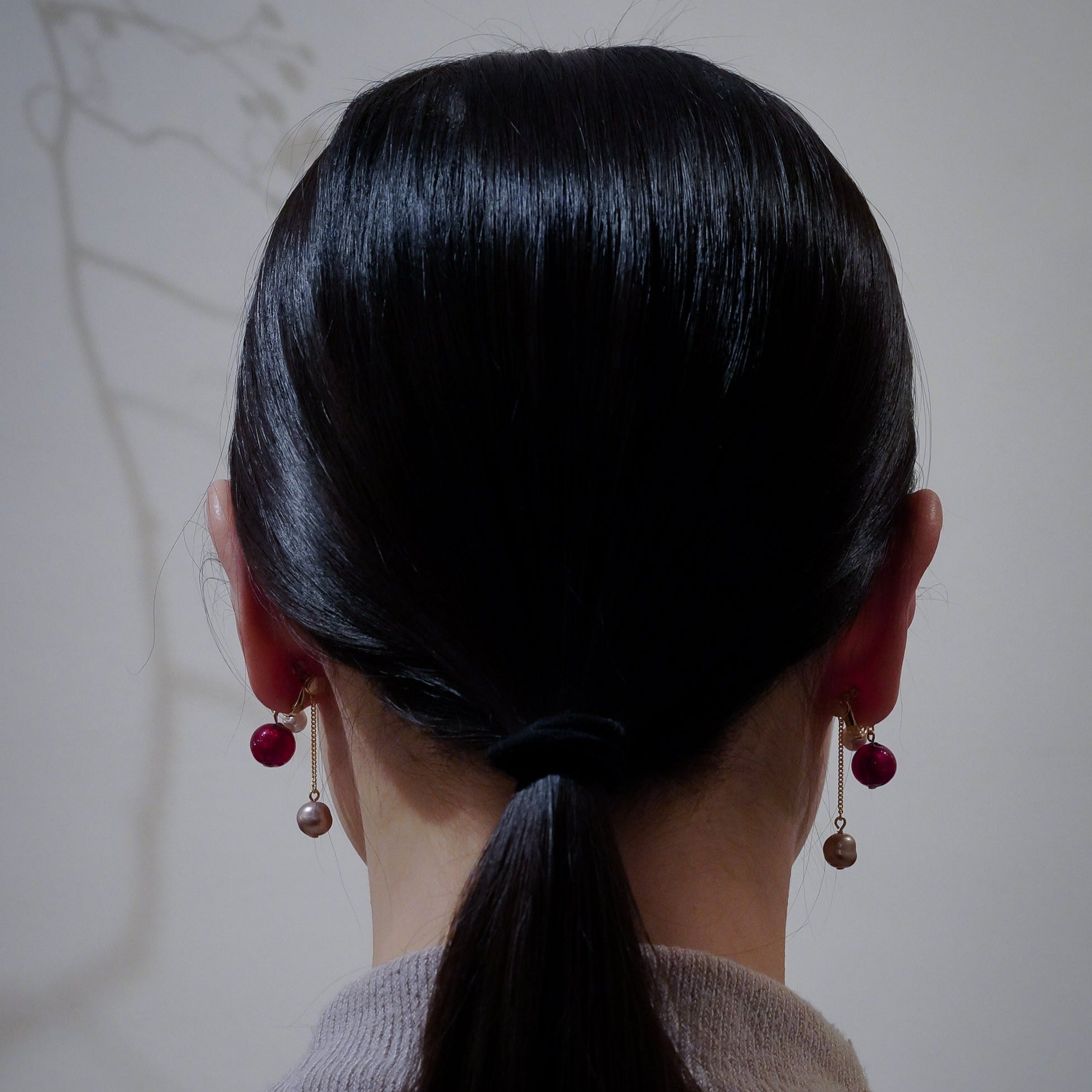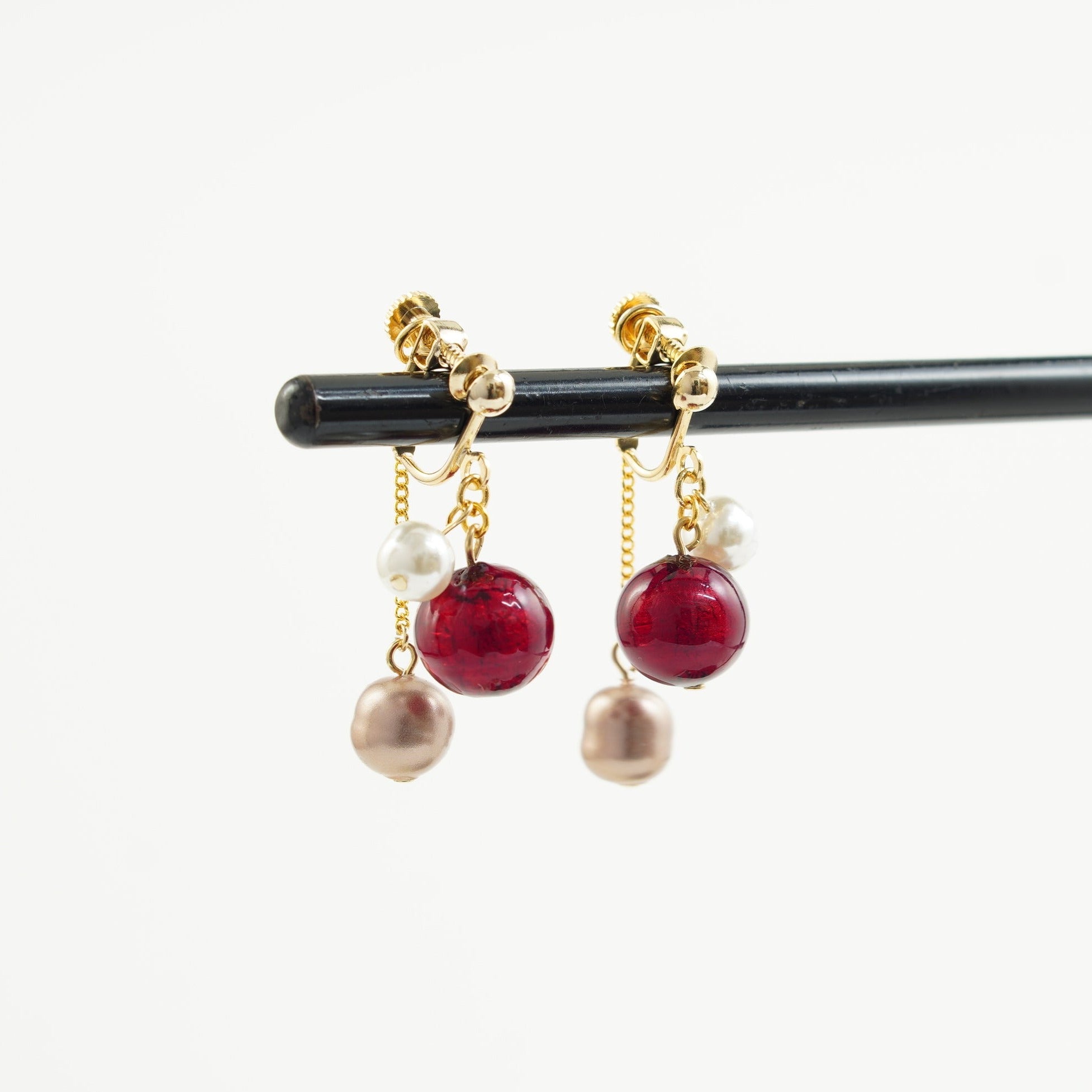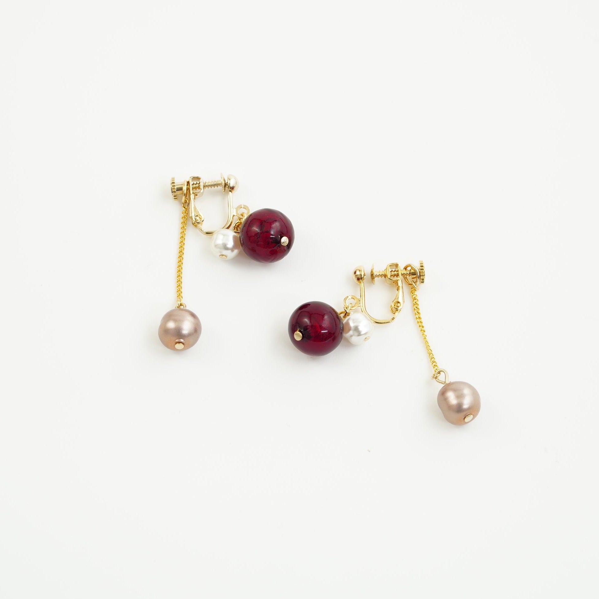 その名の通り、クリスマスをイメージした華やかな赤のビーズに、光沢のあるガラスパールを合わせました。ビーズは2層になっており、中の銀箔の層がより外側の赤の発色を美しく輝かせます。キャッチから垂れ下がるピンクのガラスパールがゆらゆらと揺れ、遊び心と上品さを兼ね備えた、聖夜にぴったりのイヤリングです。
