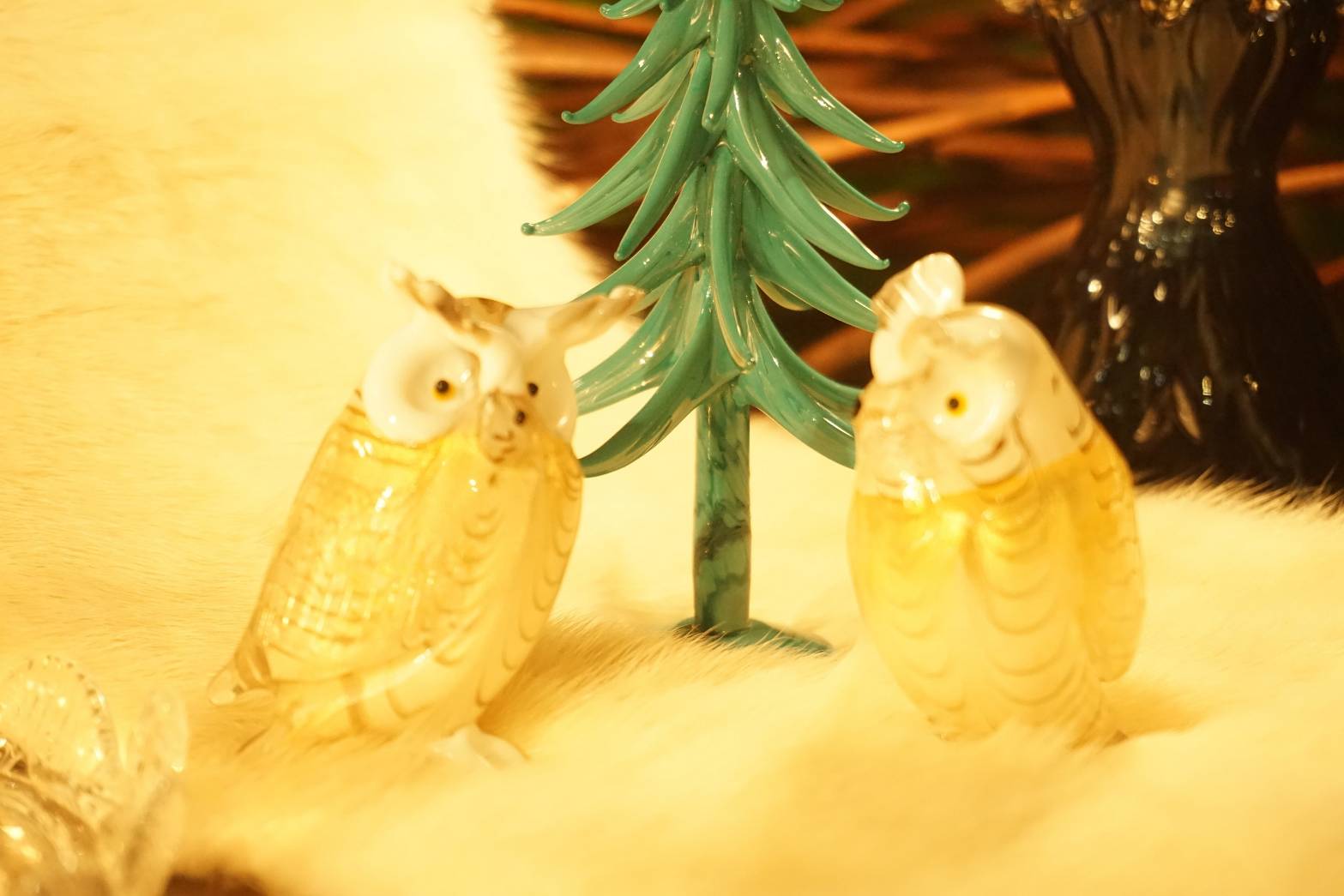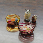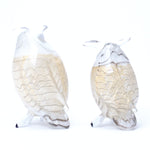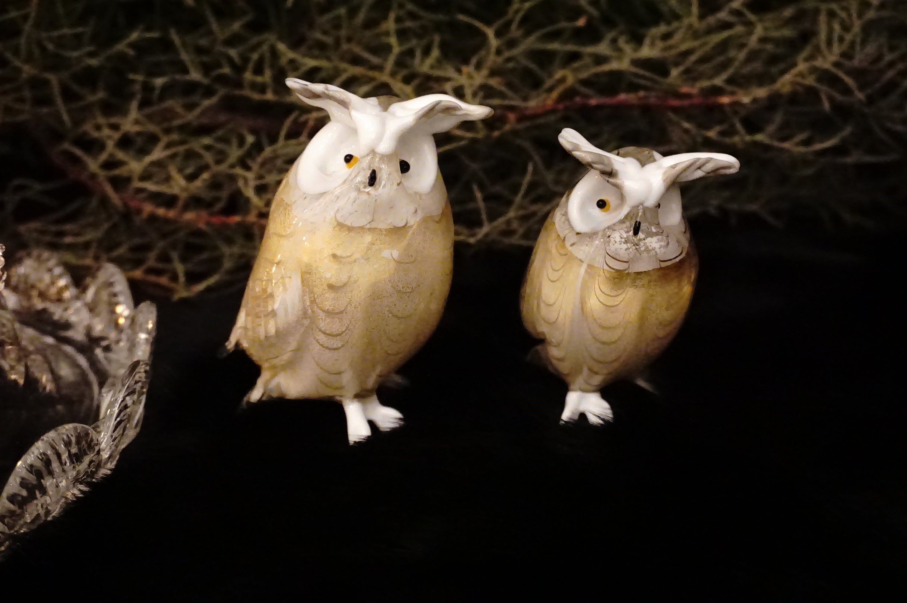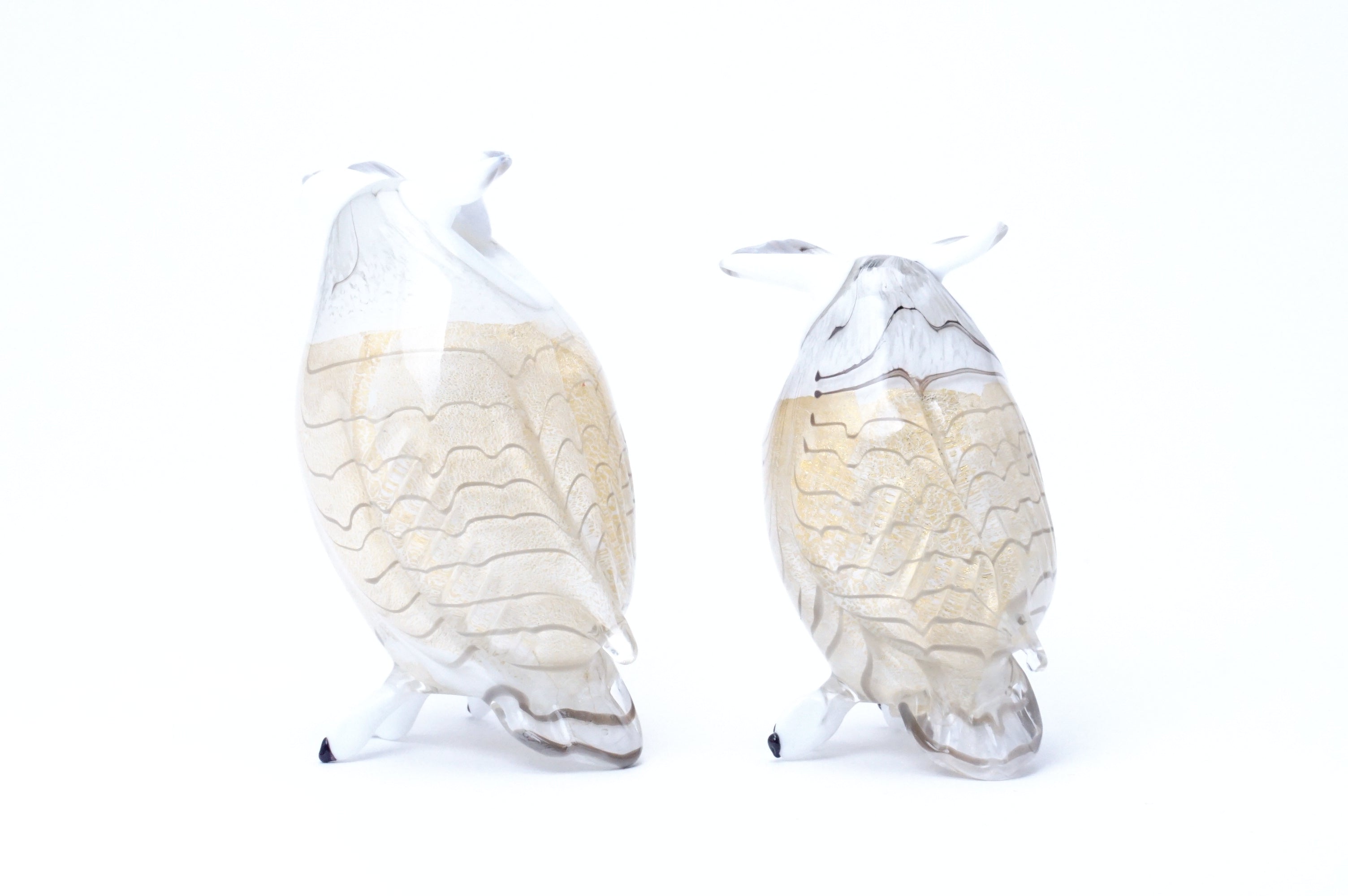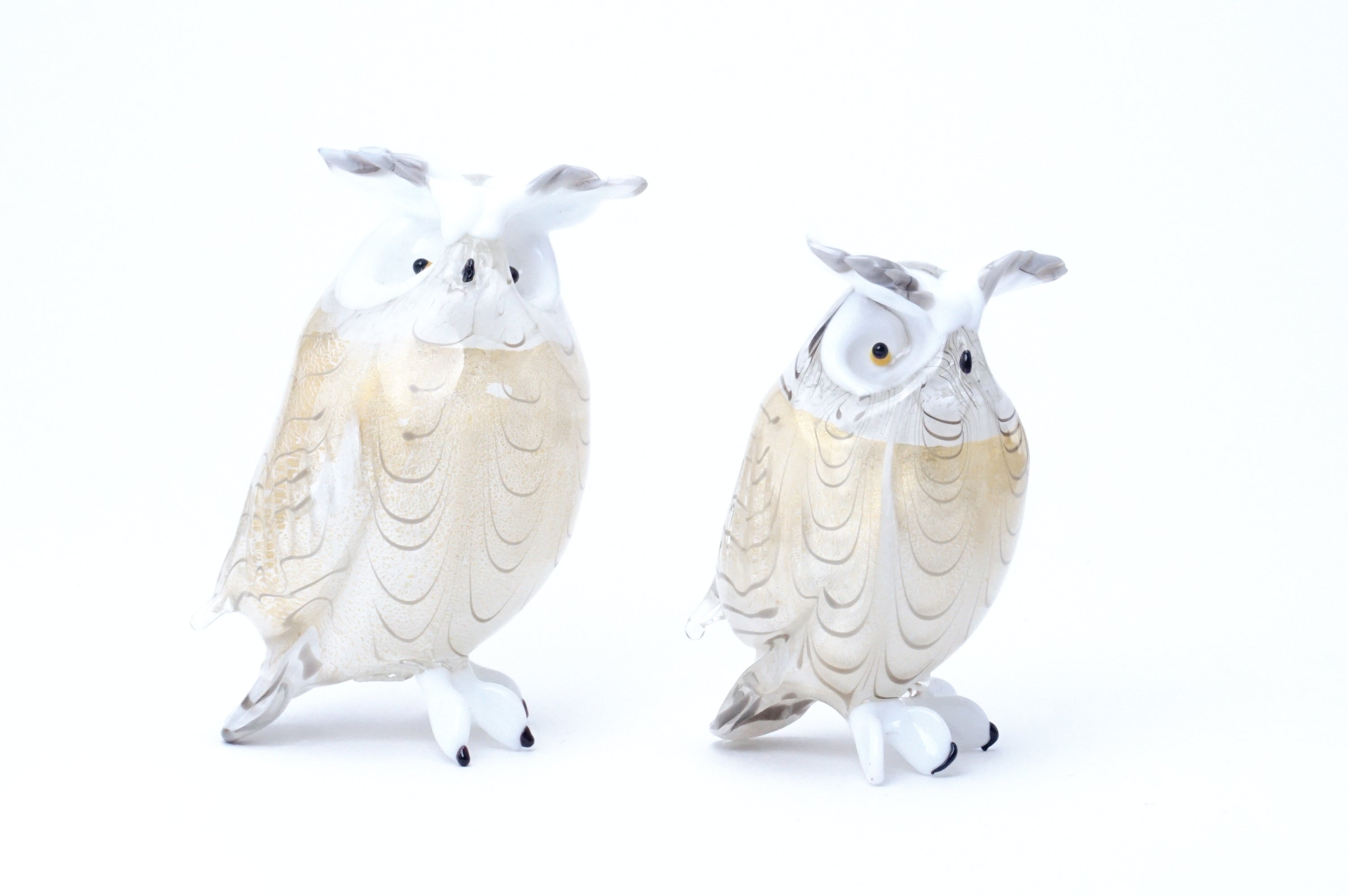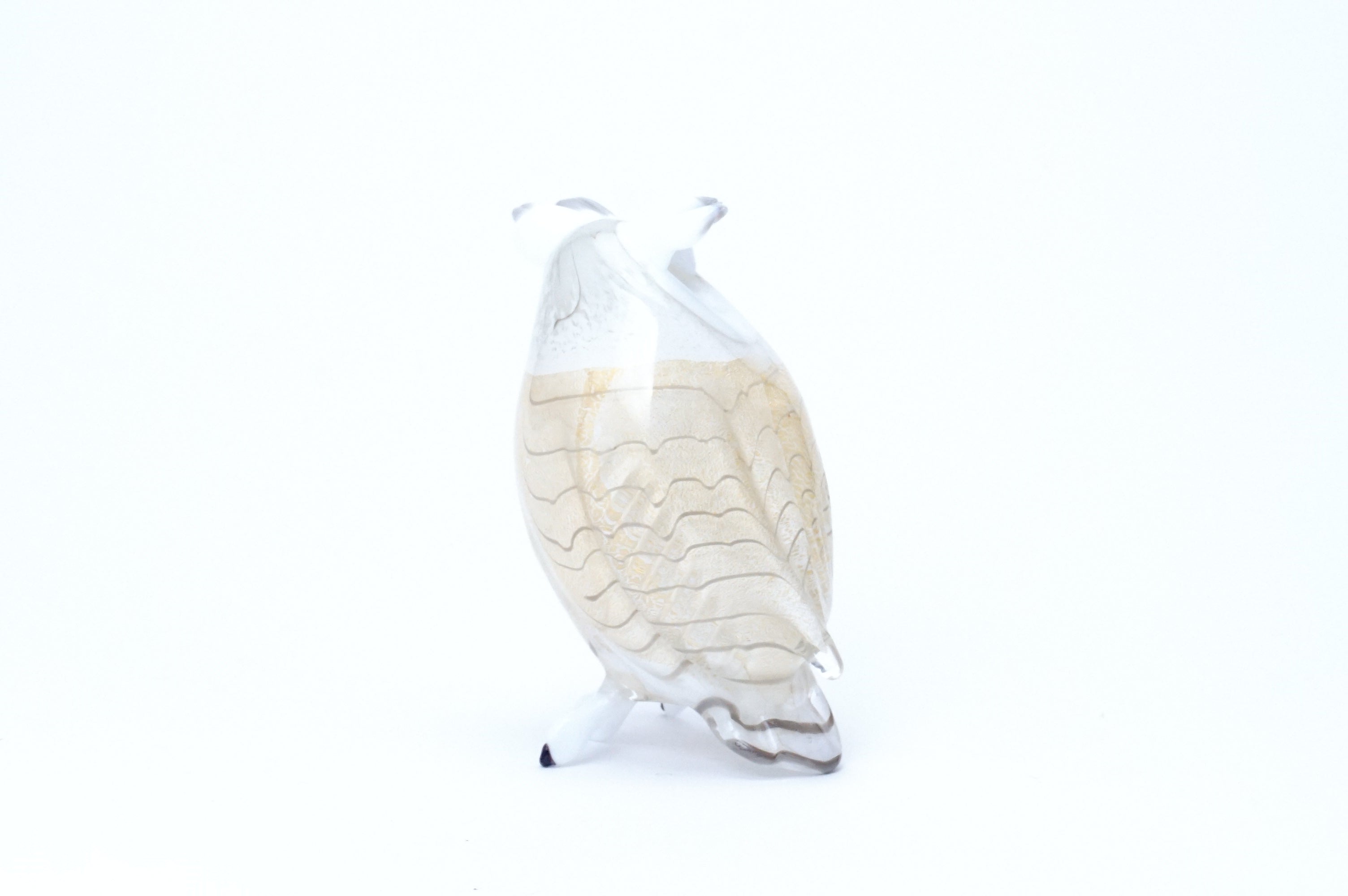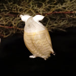 ボディに24金箔を巻き、ガラスを重ね、まさに「羽」を意味するピューマータ技法で柔らかそうな羽模様が描かれた美しくも可愛らしいフクロウのミニチュア。