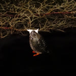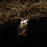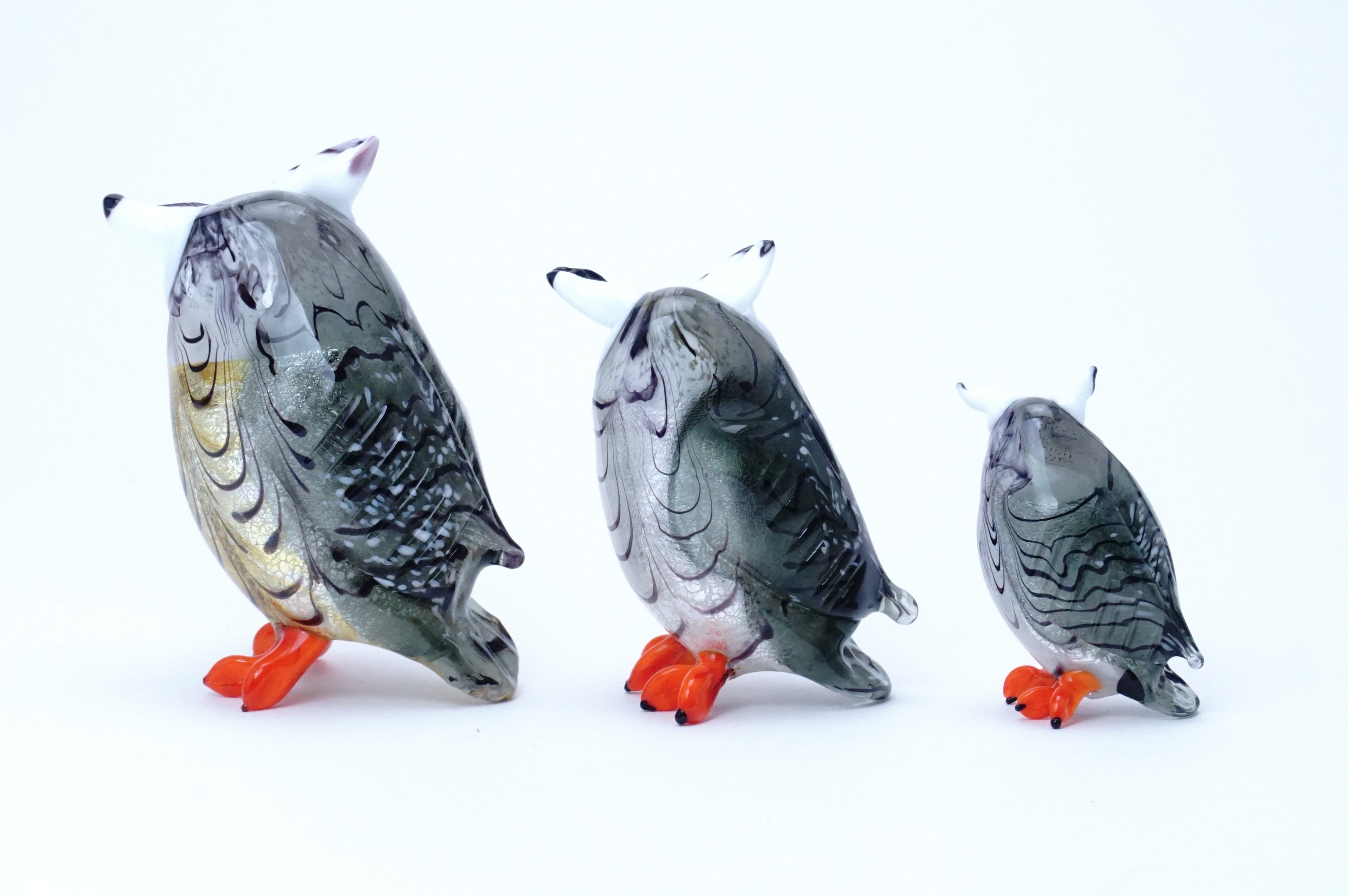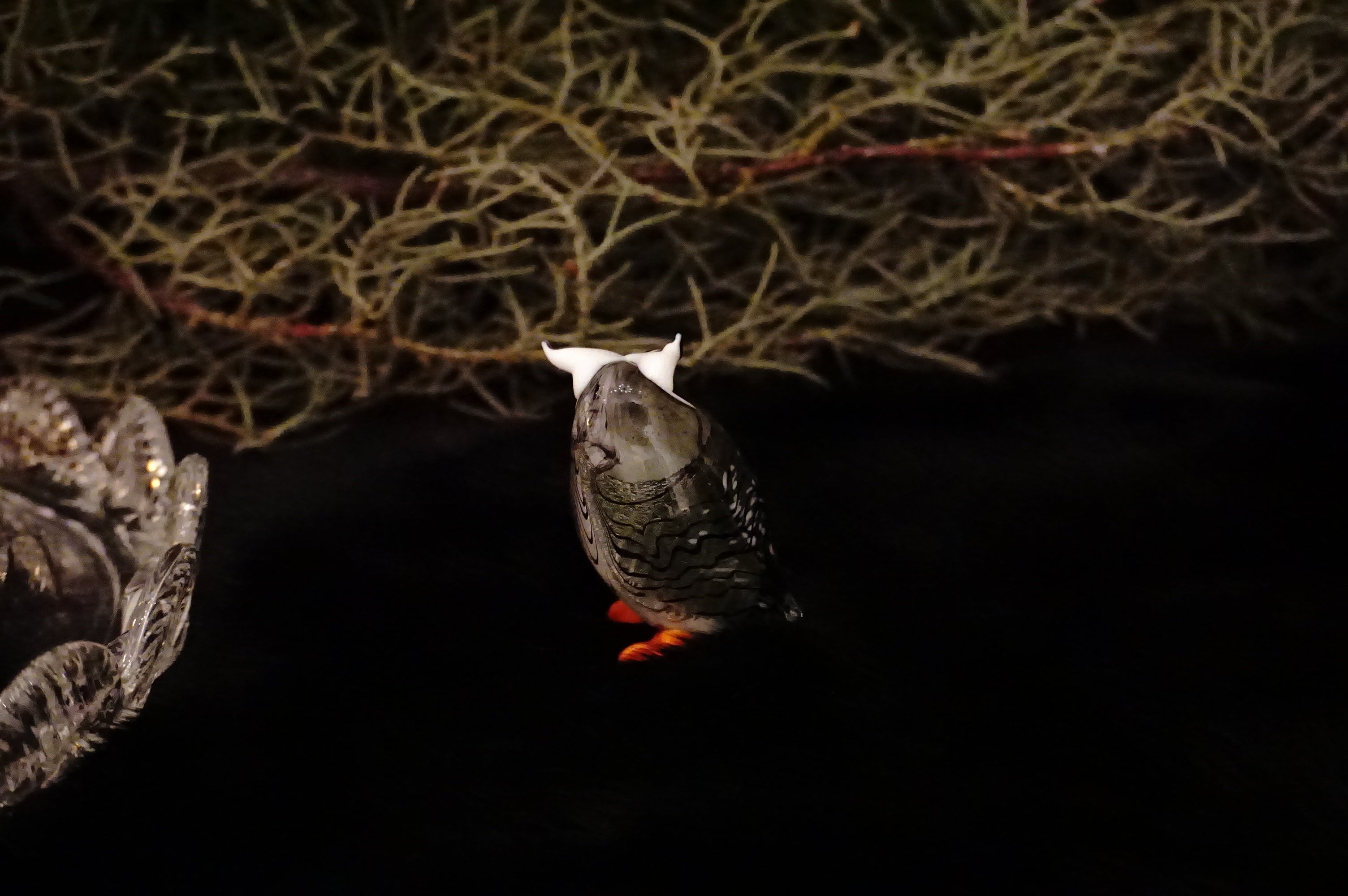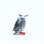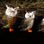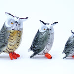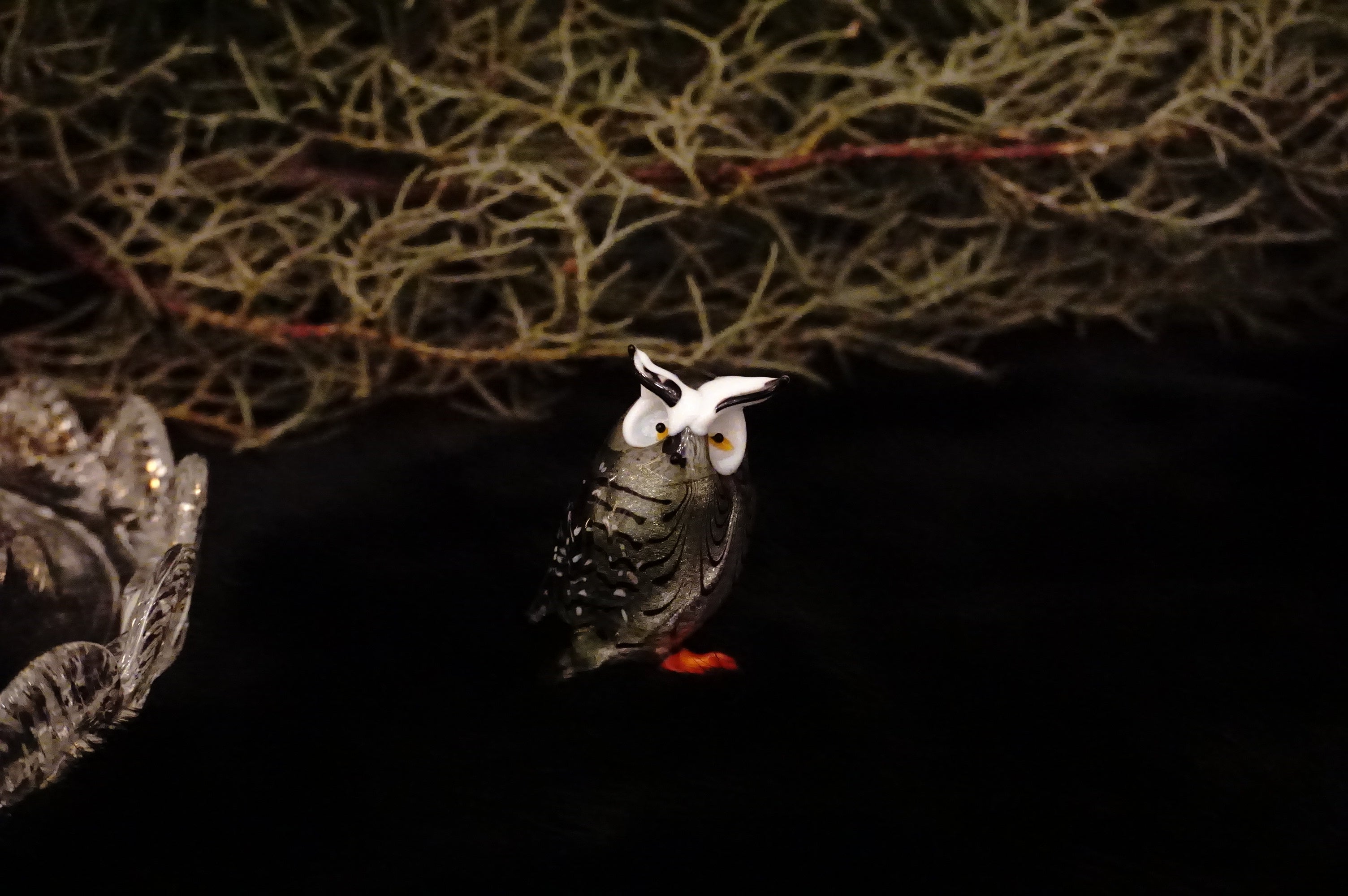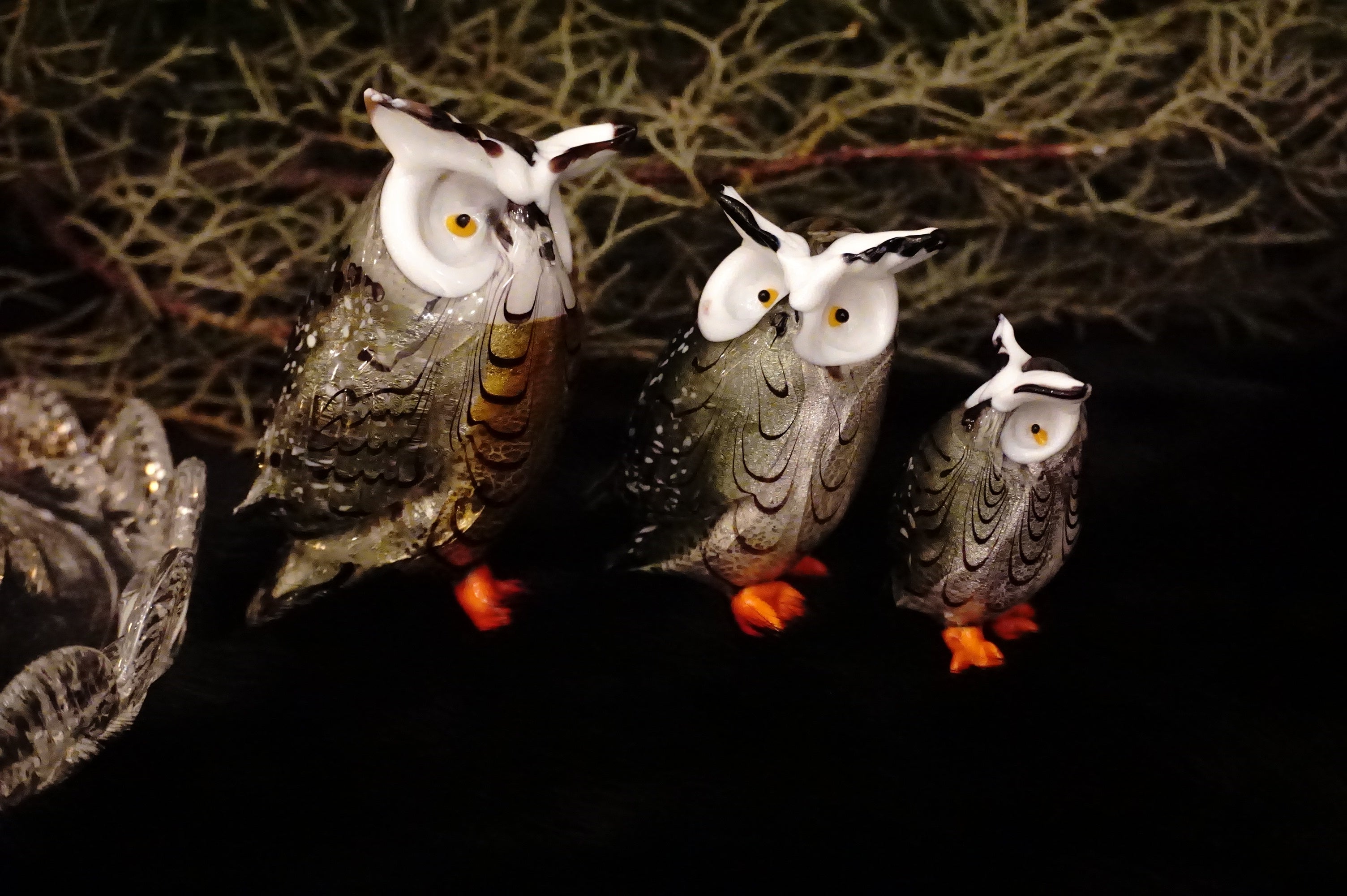 ボディに24金箔を巻き、ガラスを重ね、まさに「羽」を意味するピューマータ技法で柔らかそうな羽模様が描かれた美しくも可愛らしいフクロウのミニチュア。