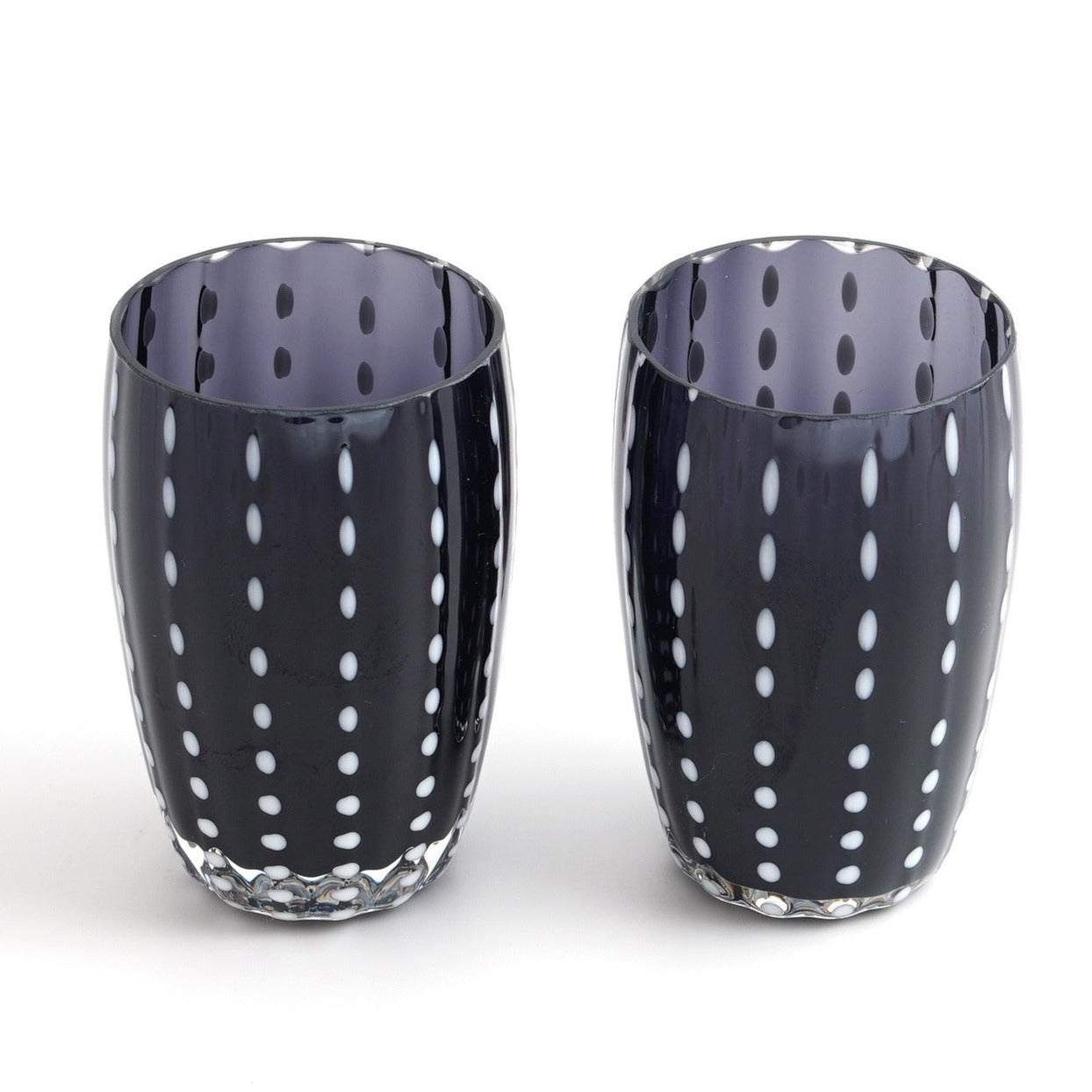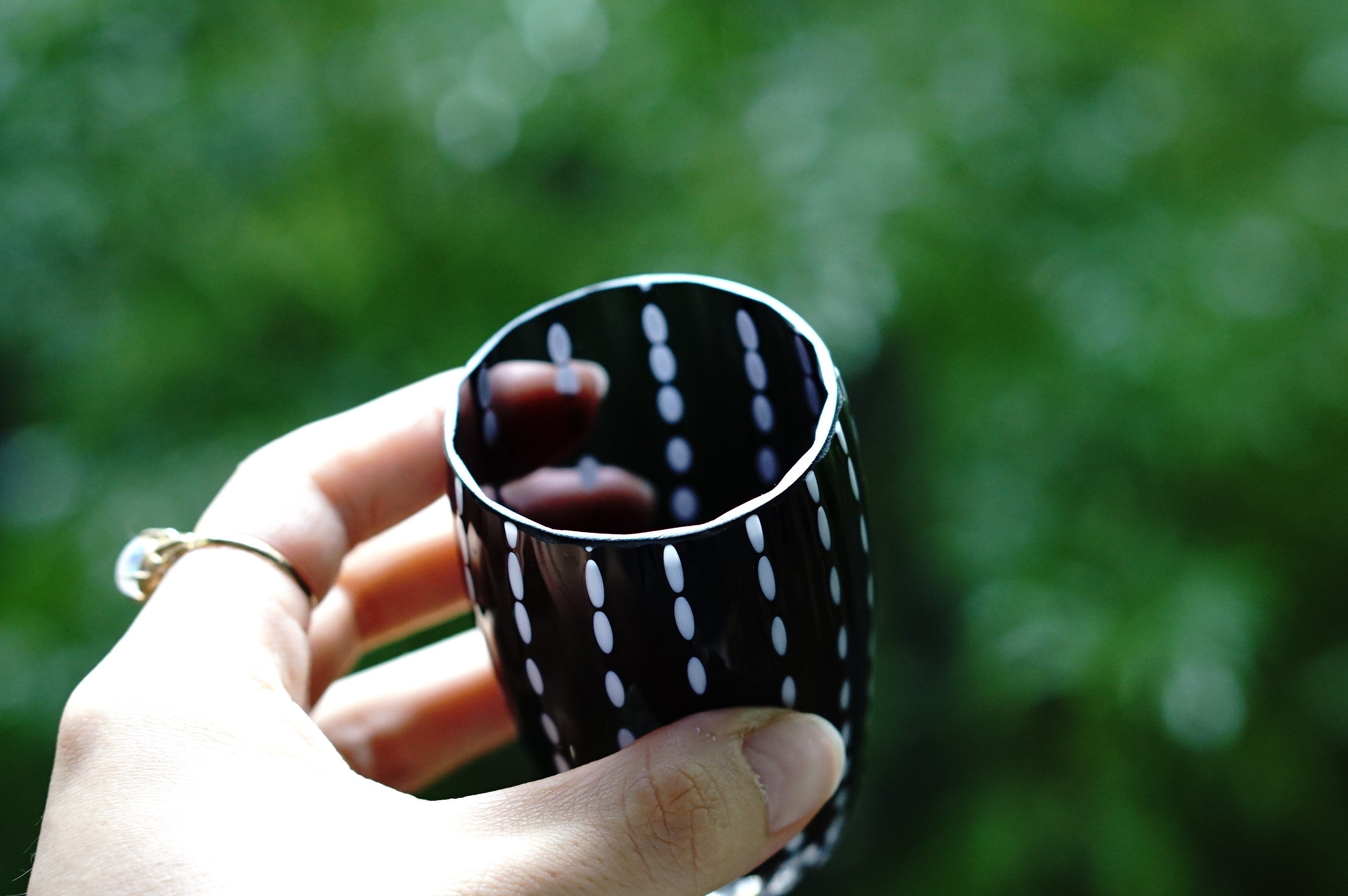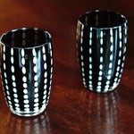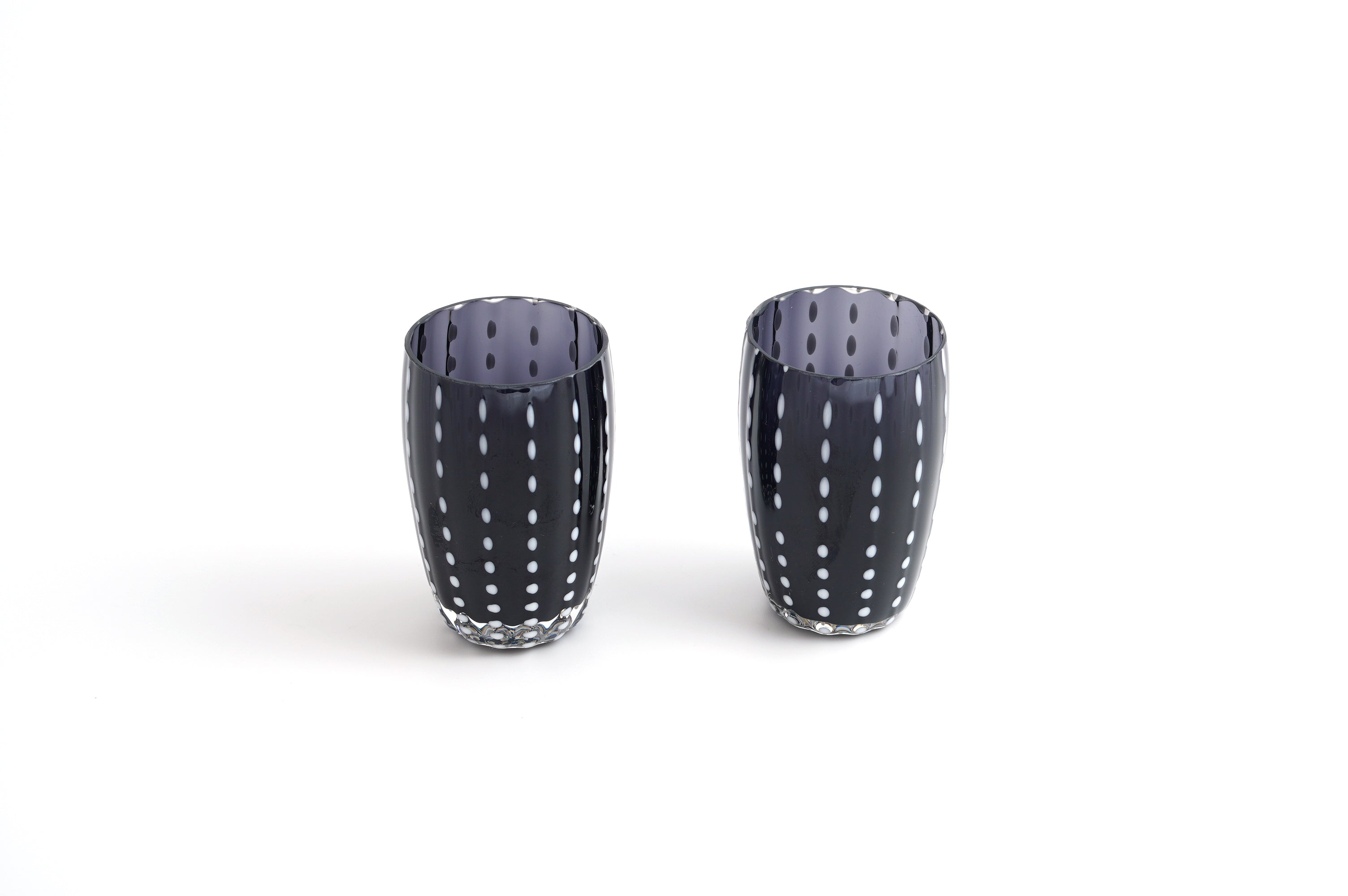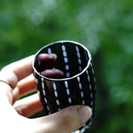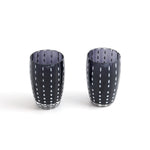 クールな漆黒のガラスに、まるでひと針ひと針縫うように白いガラスをたらした、ステッチ柄が愛らしいグラスです。片手ですっぽりおさまるサイズで、ちょっとお水を飲みたいときや、ぐい呑みとしても使用できます。抜け感のあるデザインで、男性に特に人気があるグラスです。