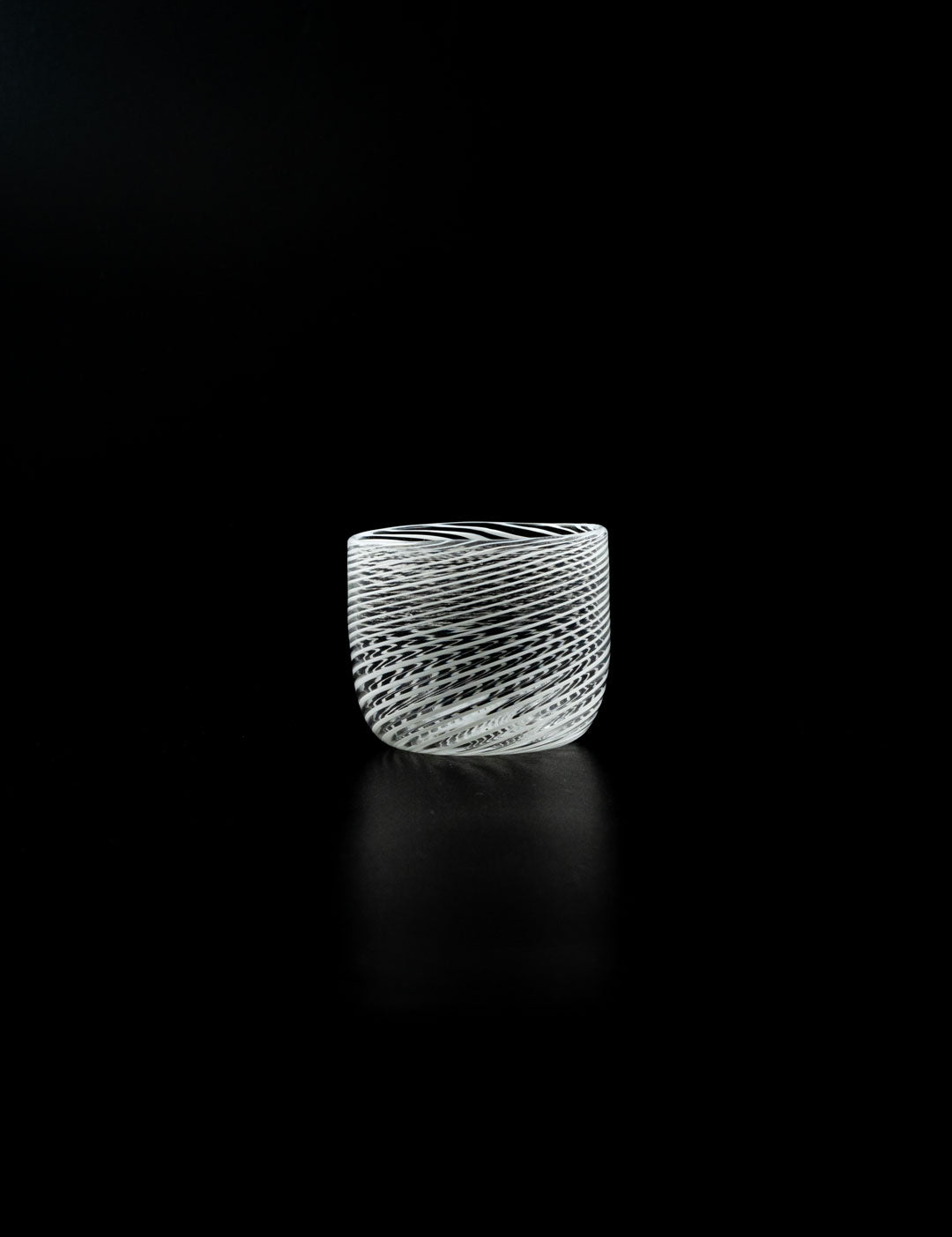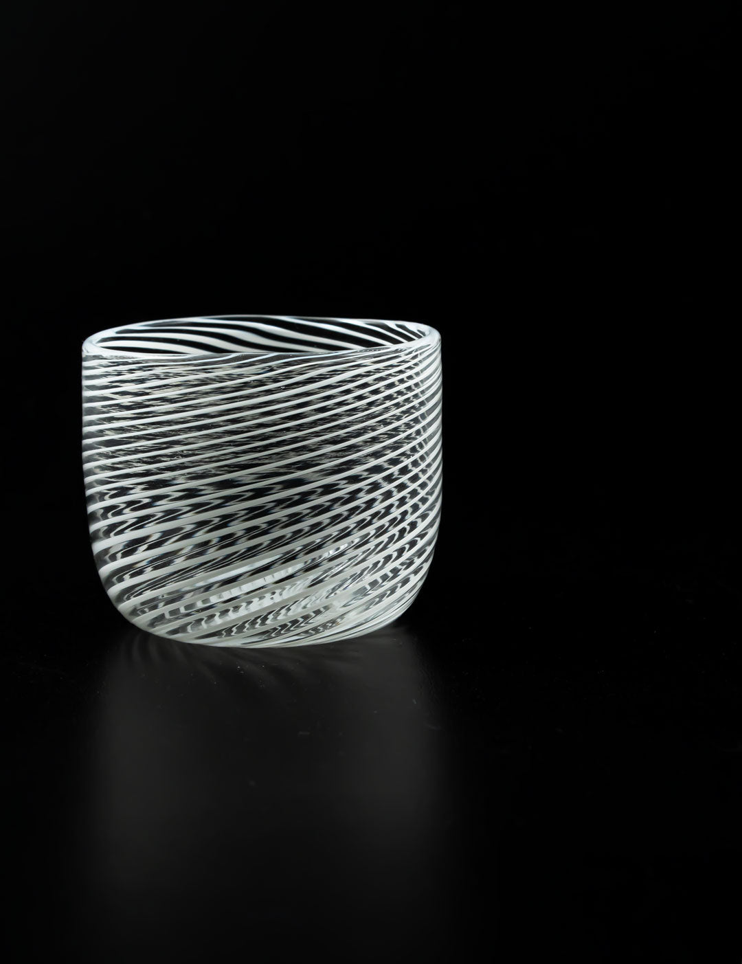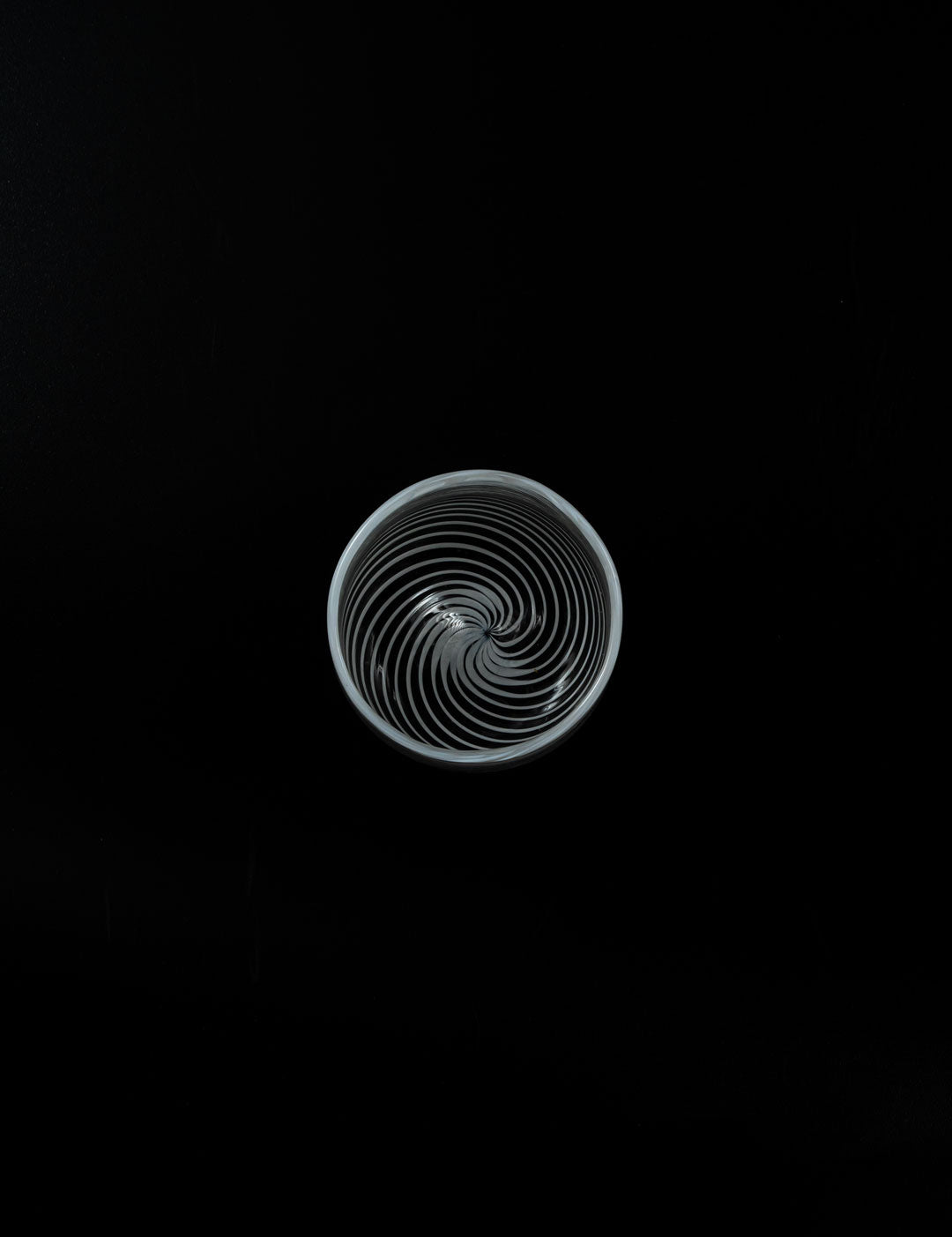小瀧千佐子がデザインし、サルバドーレ工房で制作された、白い細い線がらせん状にめぐる「フィリグラーナ(Filigrana:線状模様)」が美しいお猪口です。一見シンプルなデザインですが、細かいフィリグラーナが幻想的な雰囲気を演出し、飲み物をいれればより一層うつわの美しさを際立たせます。