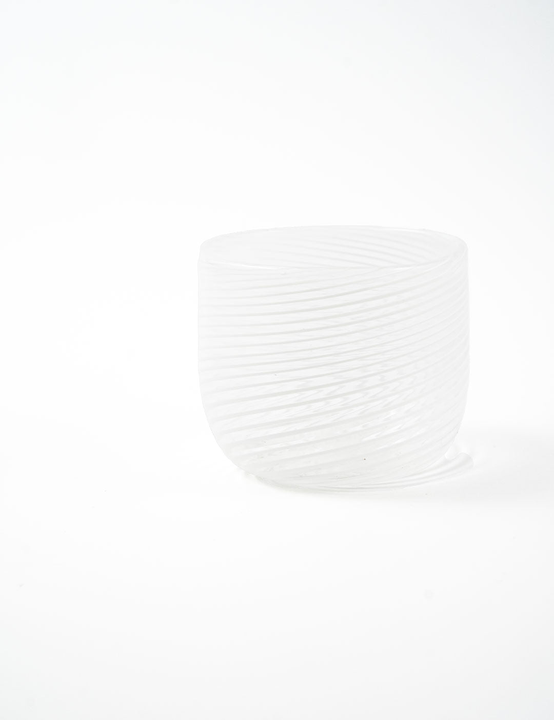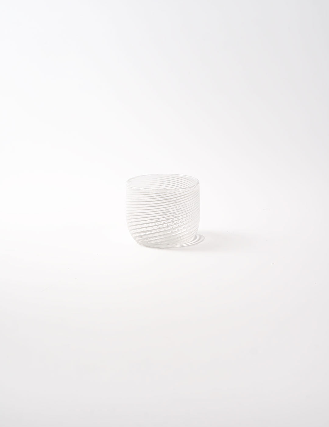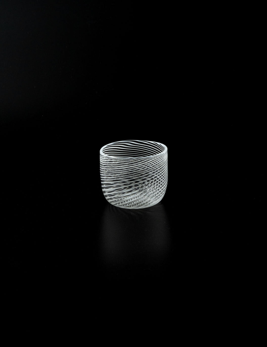 小瀧千佐子がデザインし、サルバドーレ工房で制作された、白い細い線がらせん状にめぐる「フィリグラーナ(Filigrana:線状模様)」が美しいお猪口です。一見シンプルなデザインですが、細かいフィリグラーナが幻想的な雰囲気を演出し、飲み物をいれればより一層うつわの美しさを際立たせます。