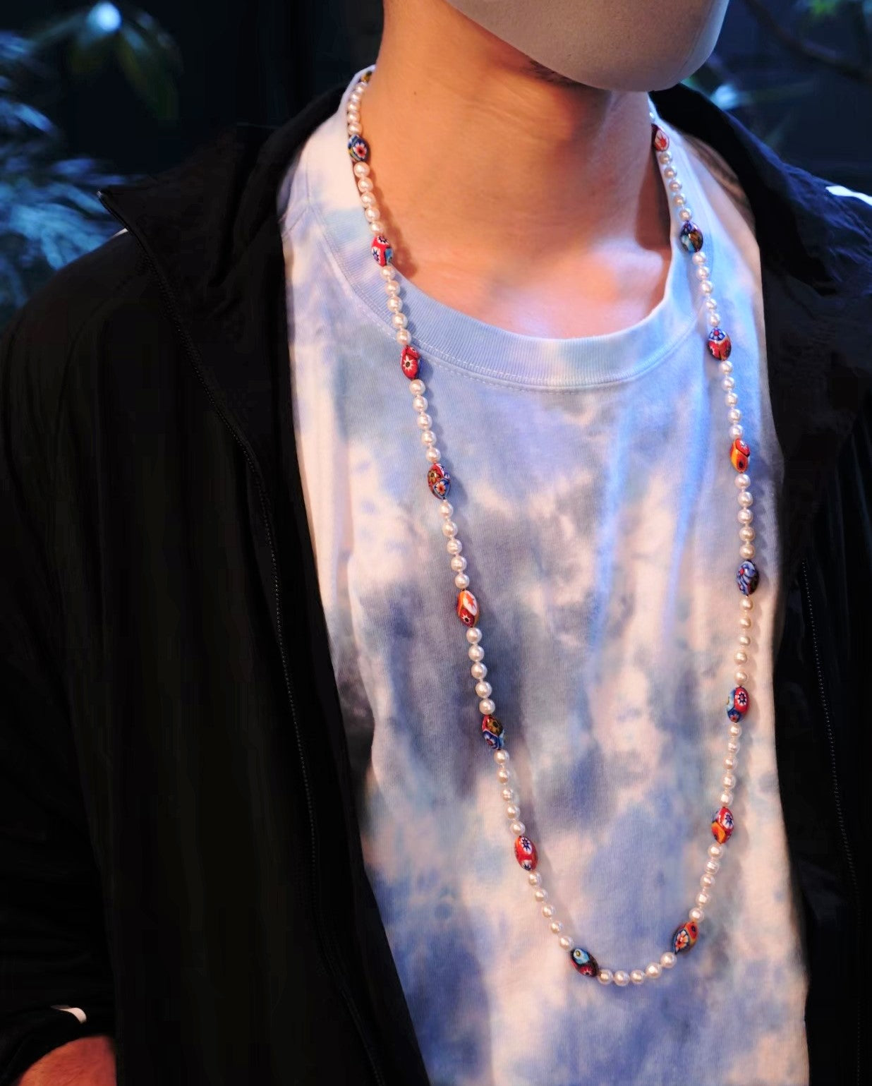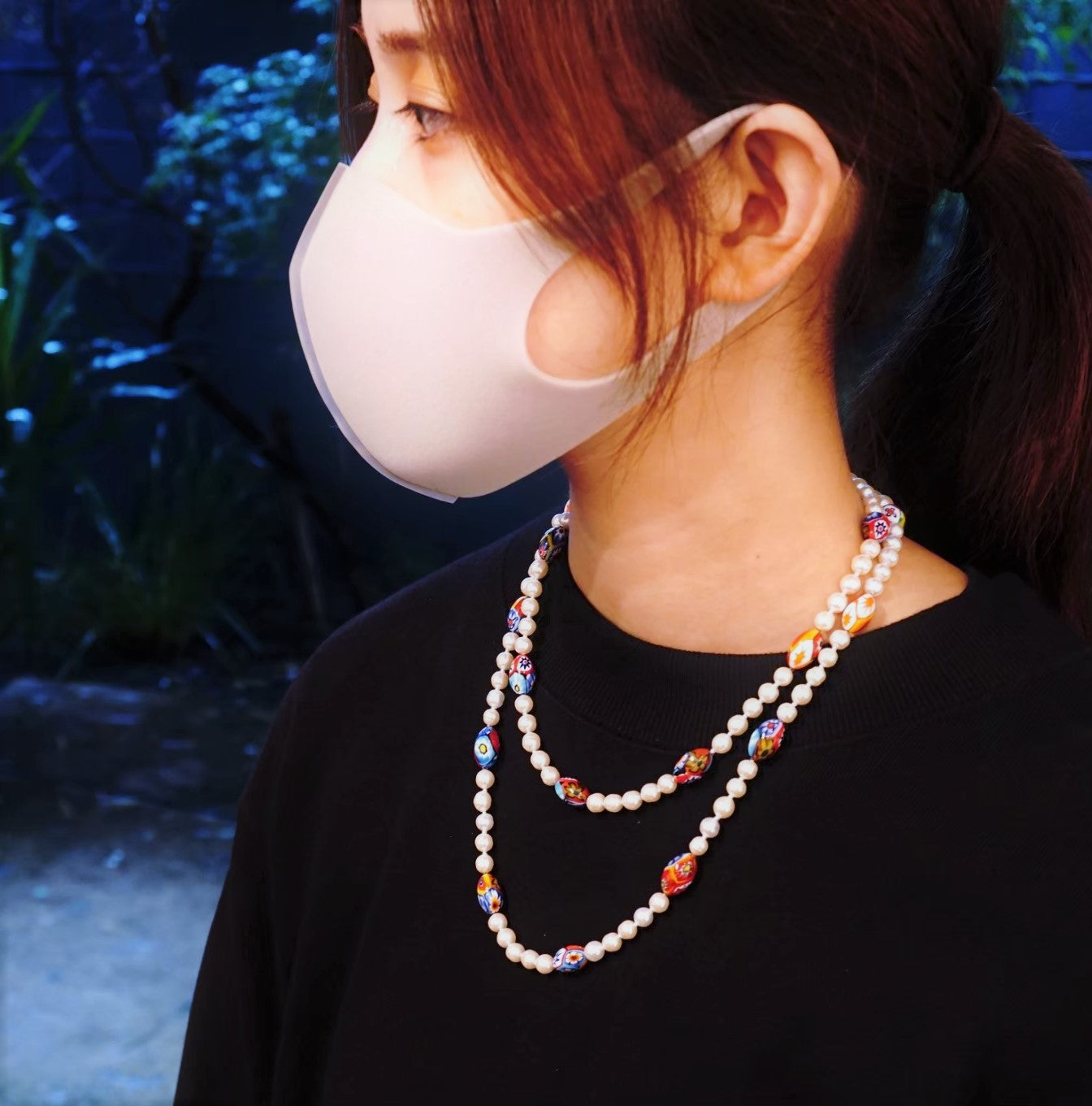 ロングネックレスとして楽しんで頂くために、ムリーネビーズの間隔を少し広げ、息苦しくならないよう調整しています。