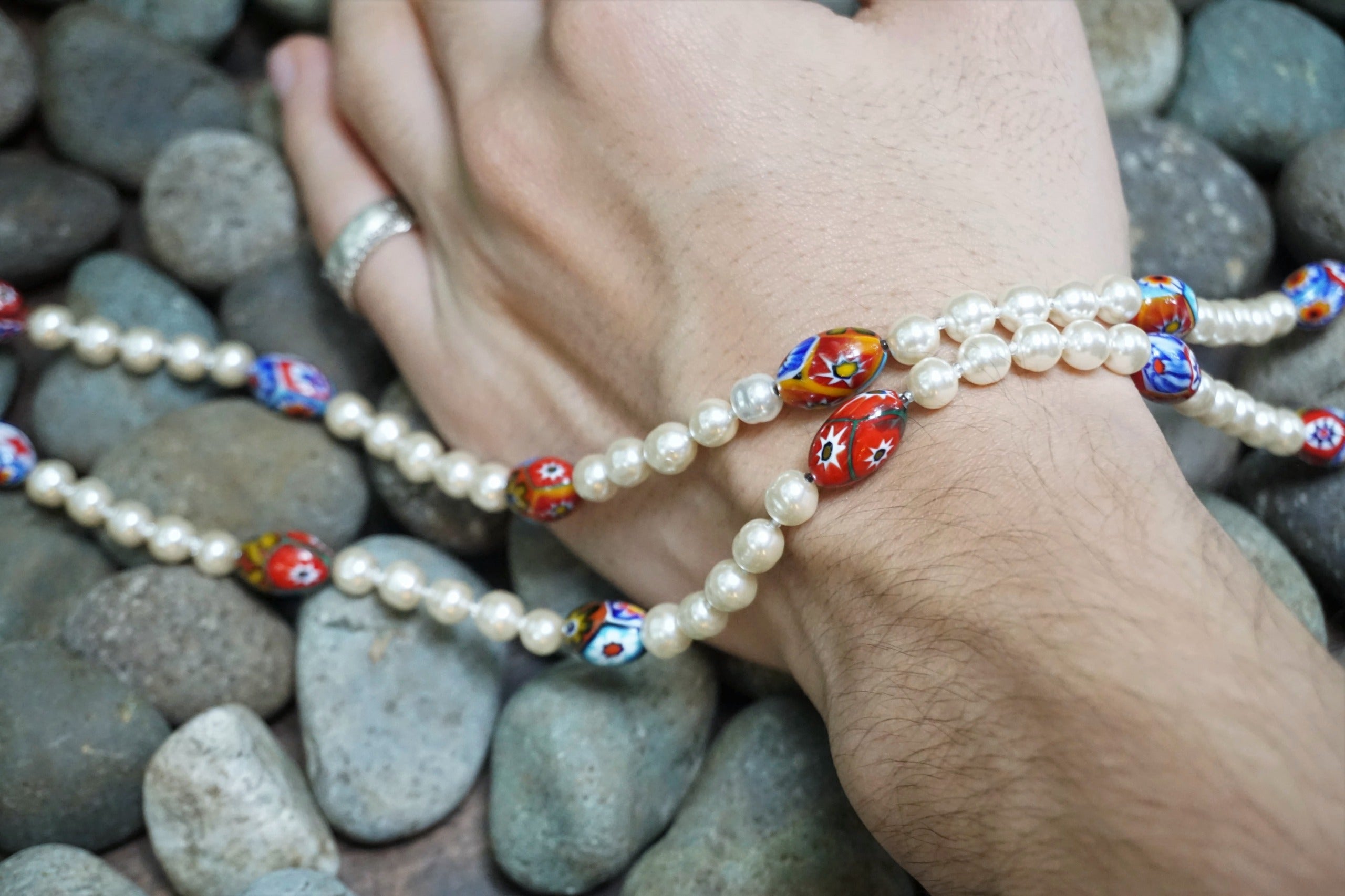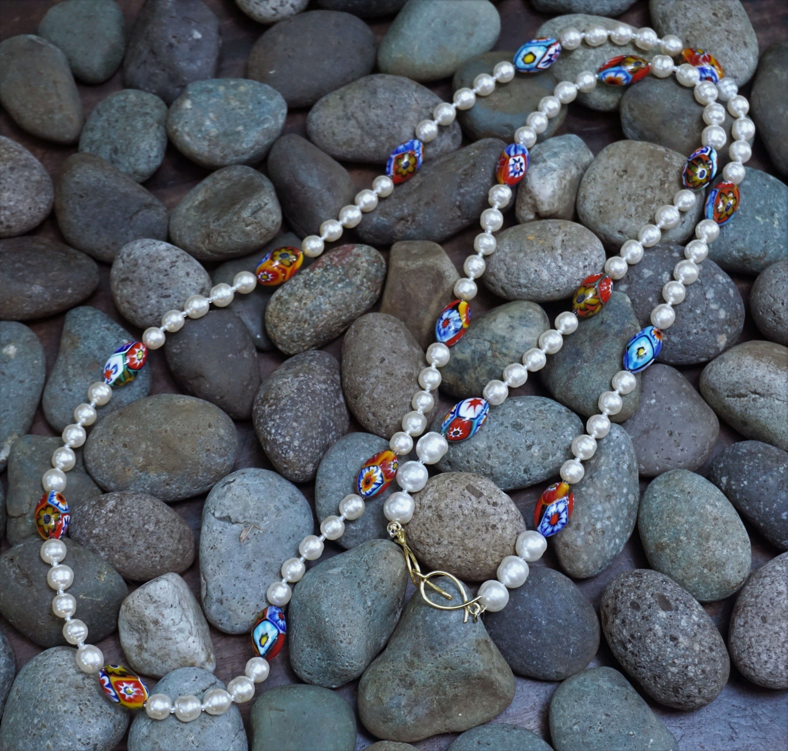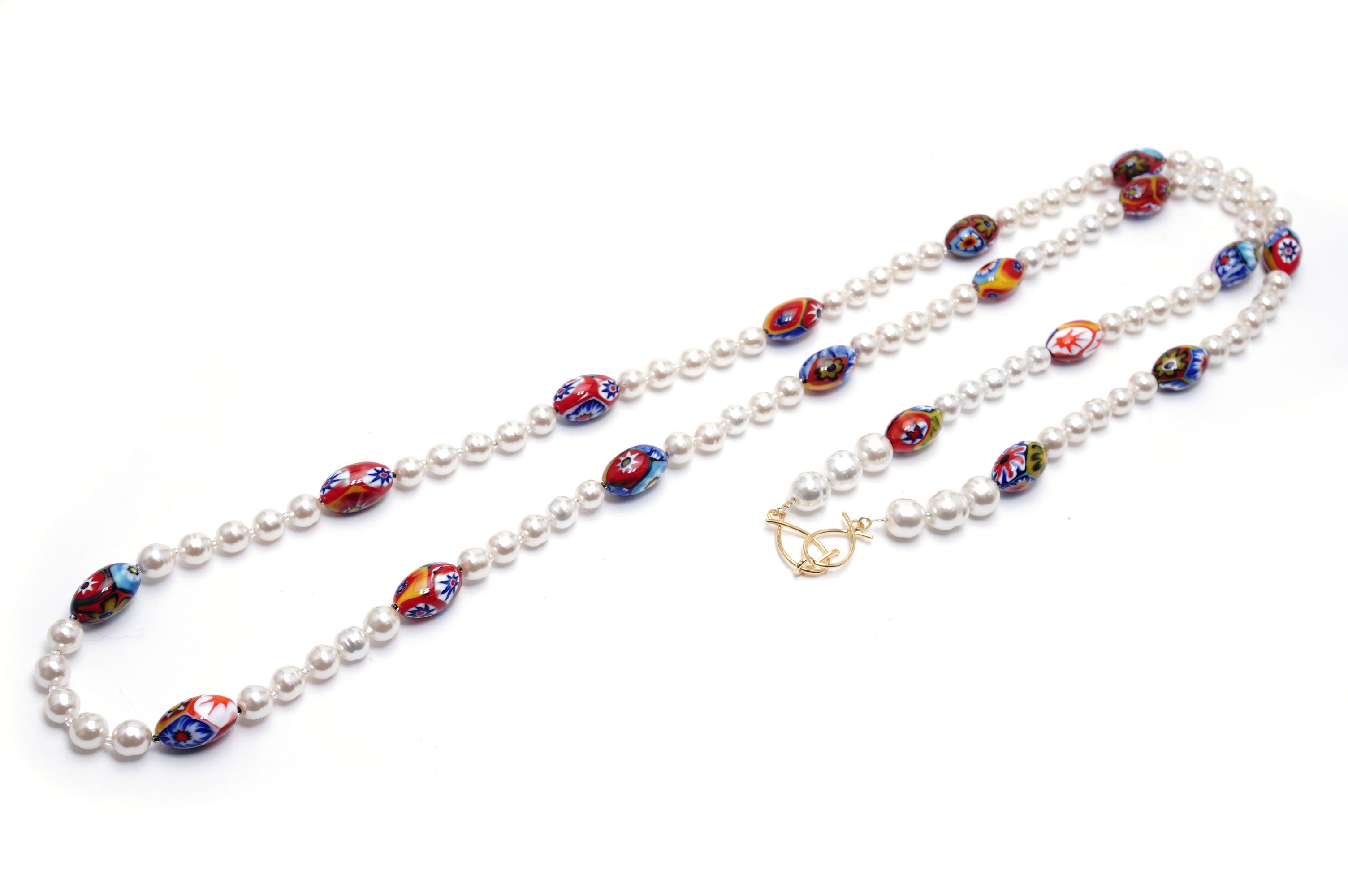 イタリアはムラーノ島の技術が光る、小さな金太郎飴状のガラス棒を芯に圧着し作るムリーネビーズ。