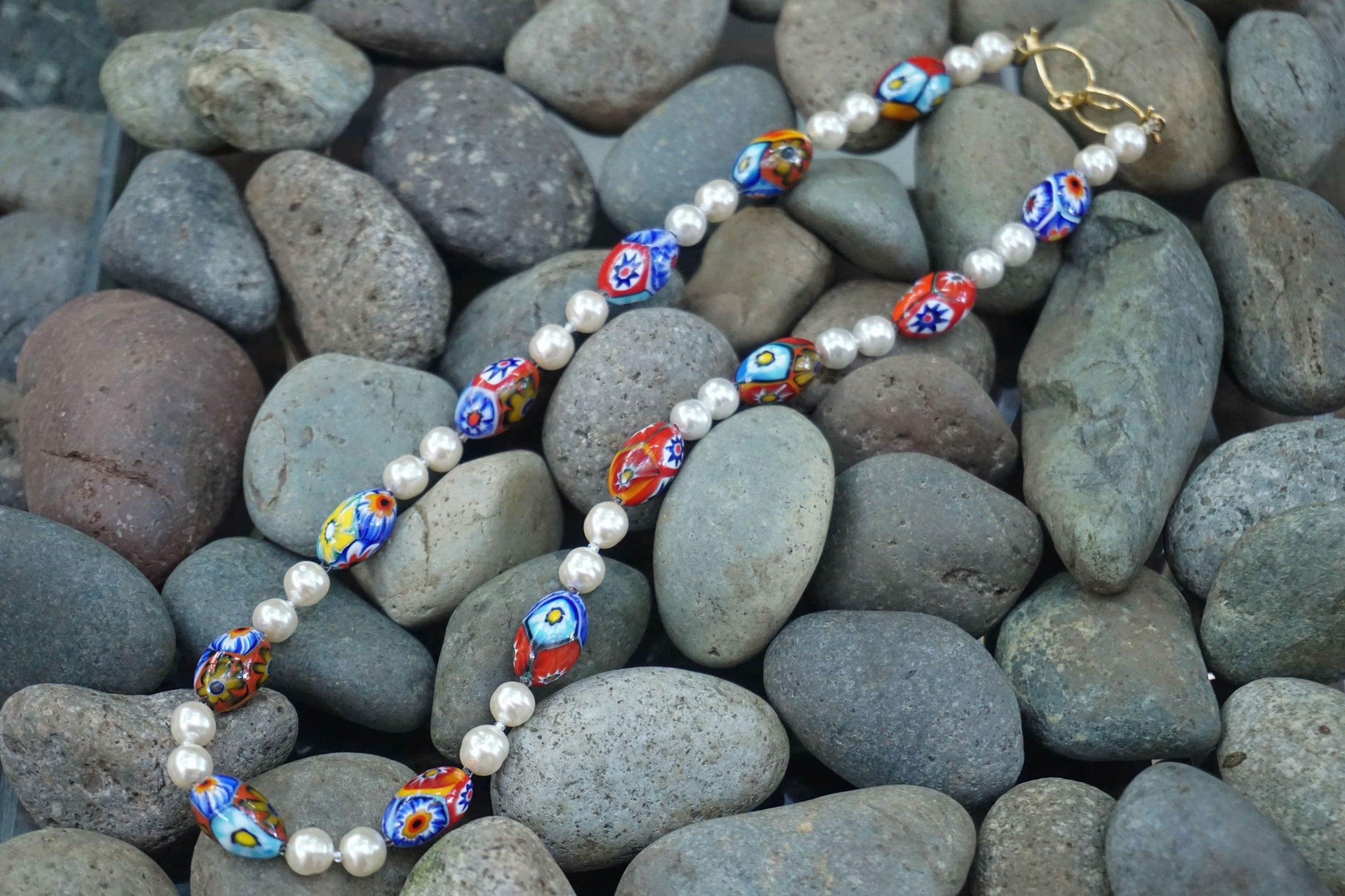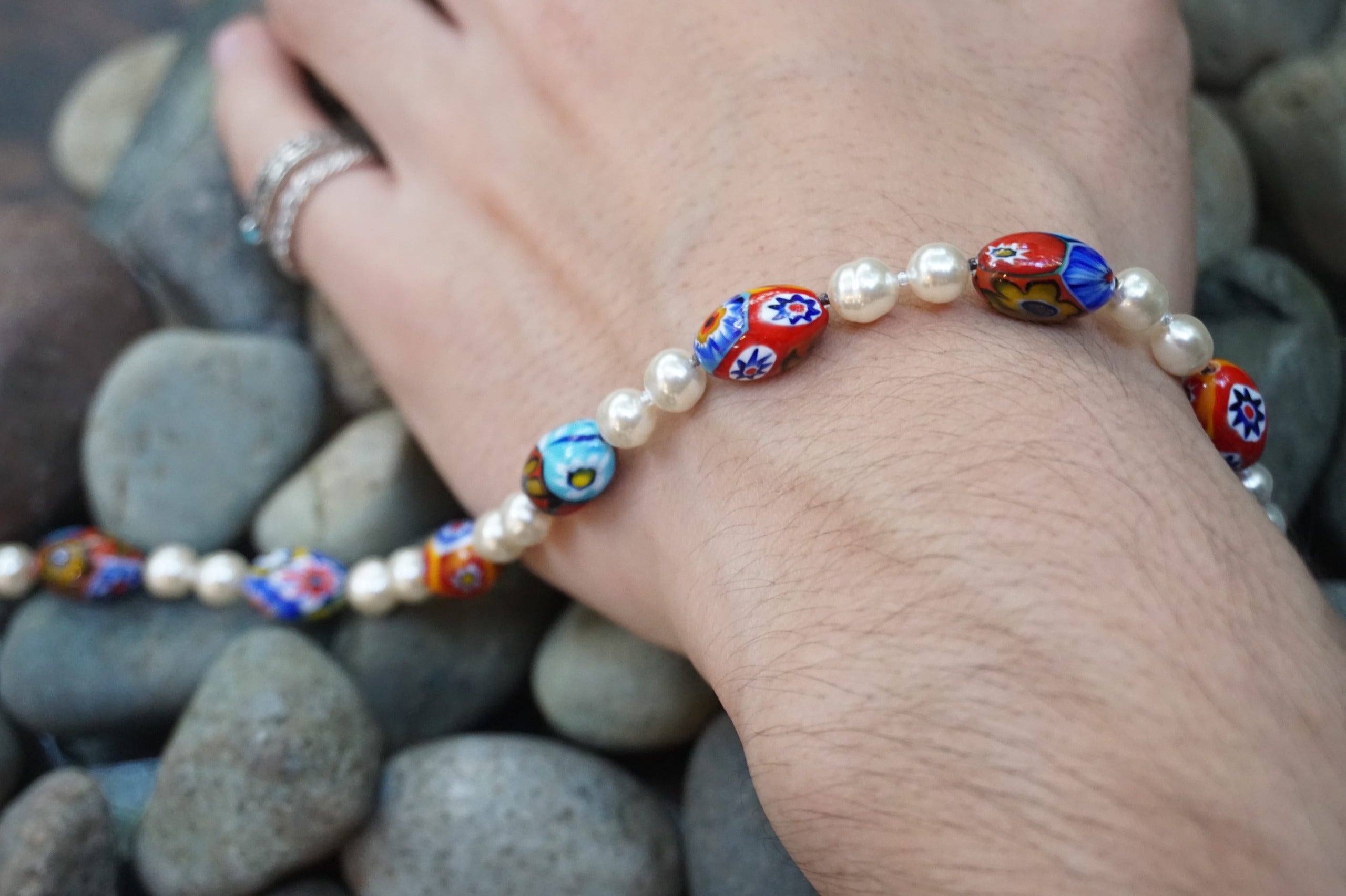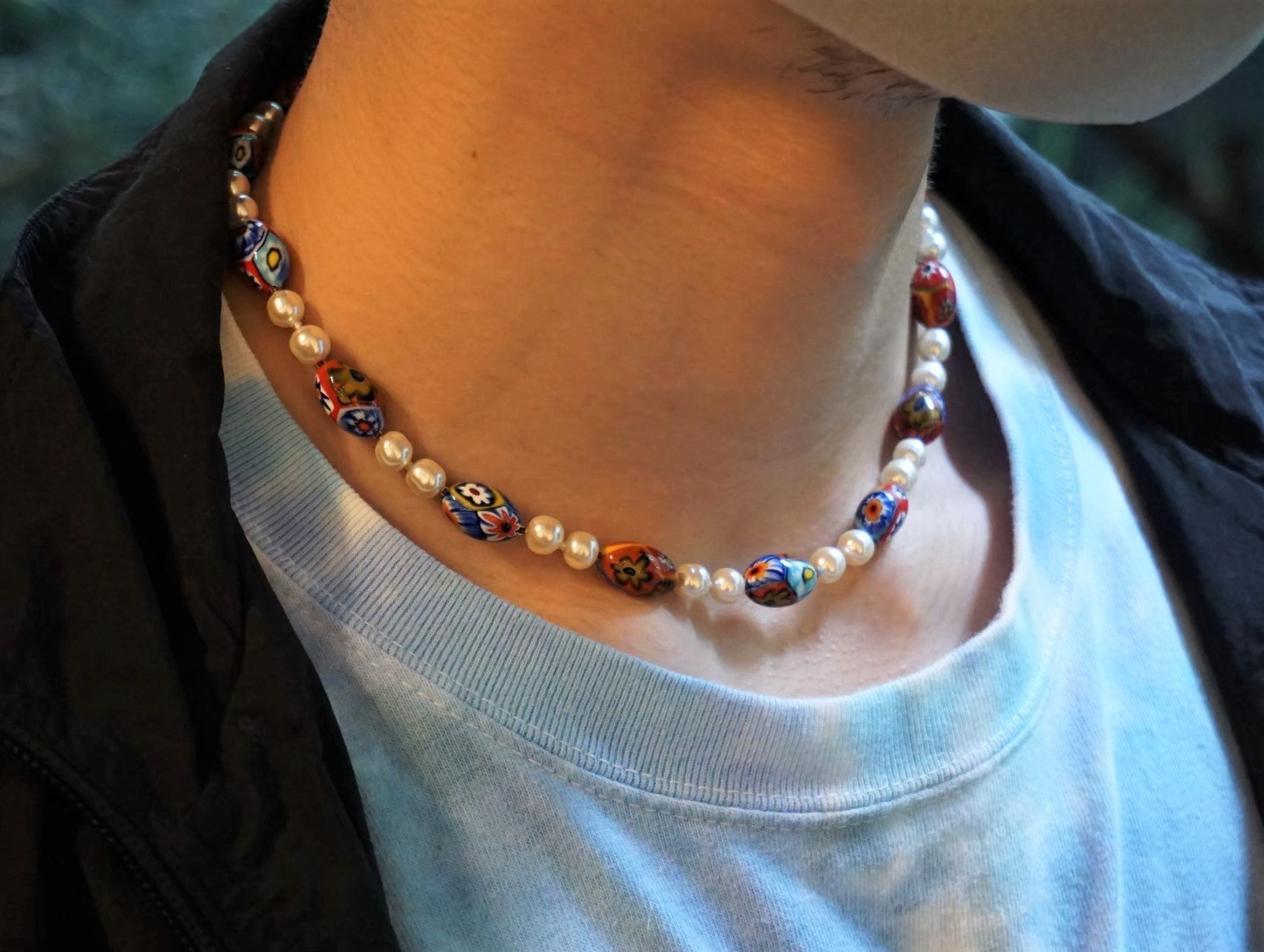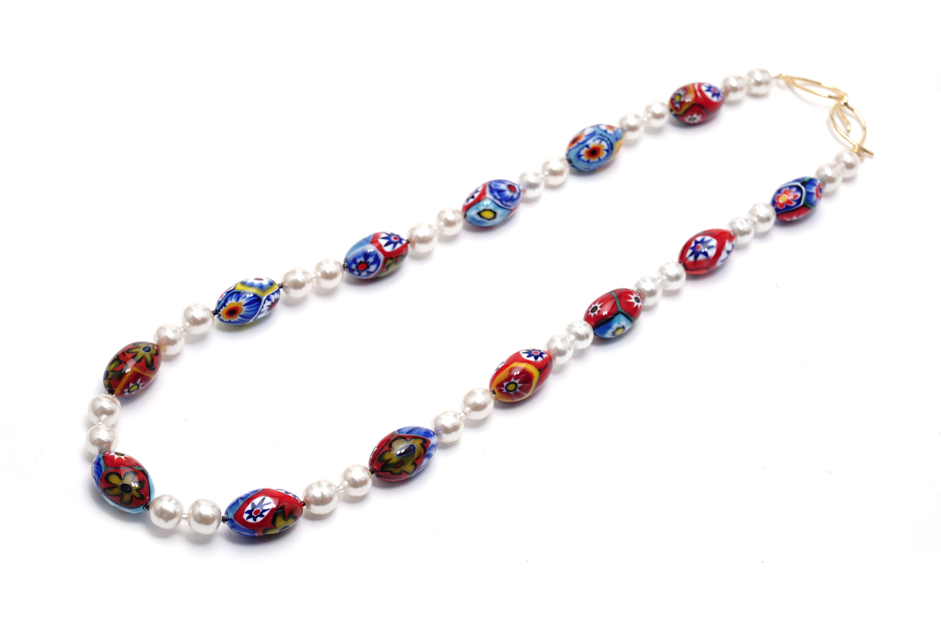 イタリアはムラーノ島の技術が光る、小さな金太郎飴状のガラス棒を芯に圧着し作るムリーネビーズ。