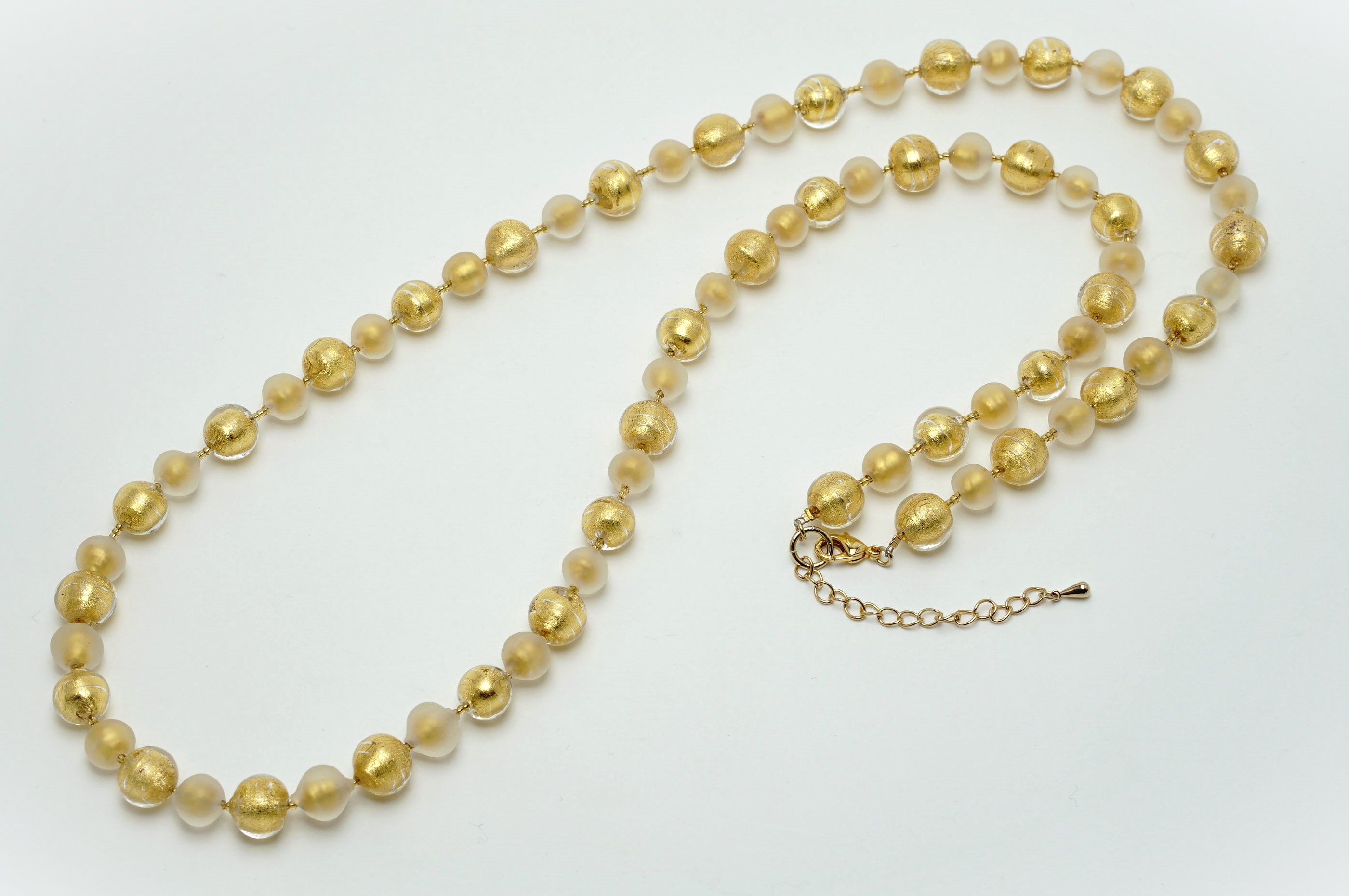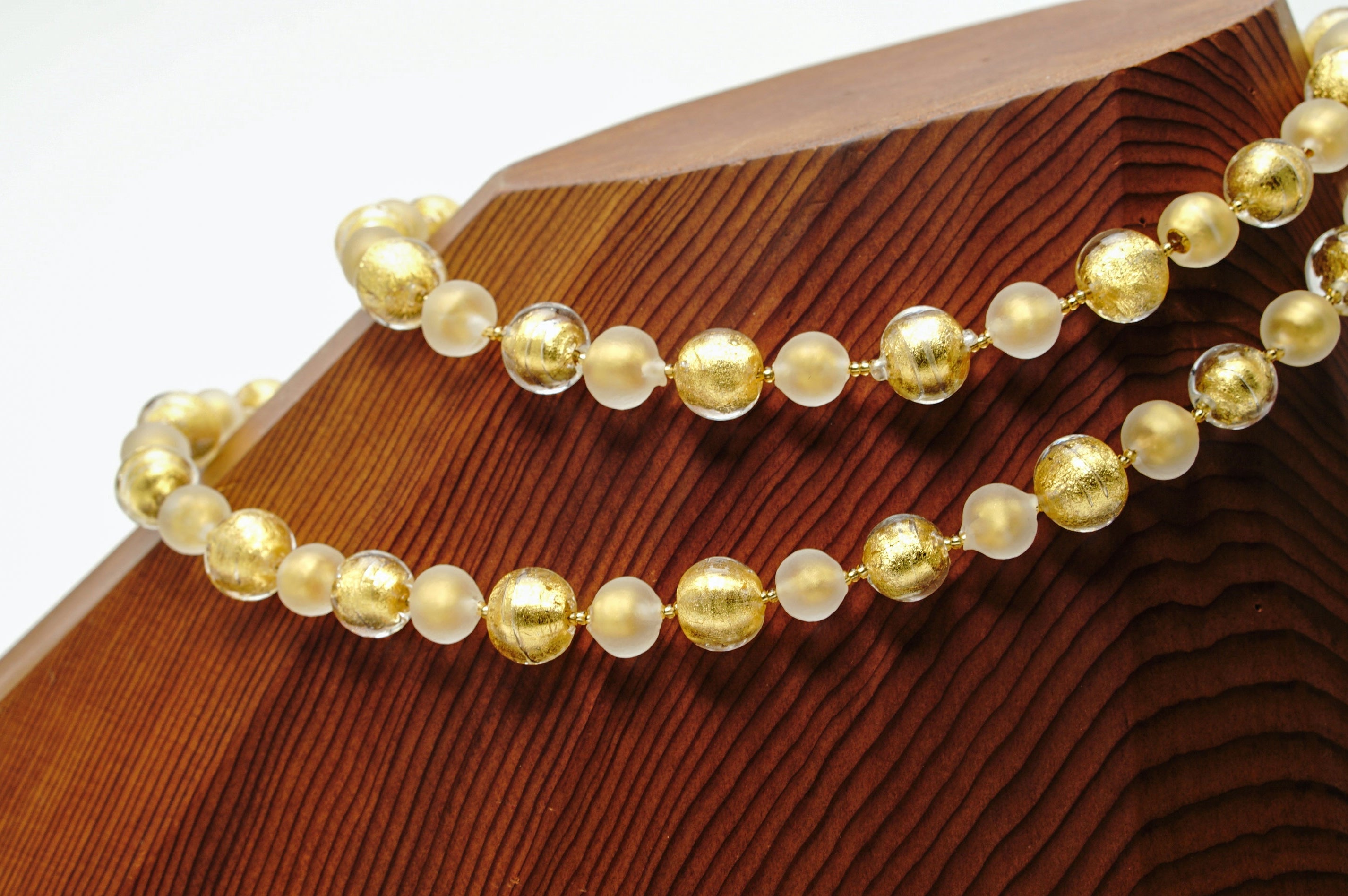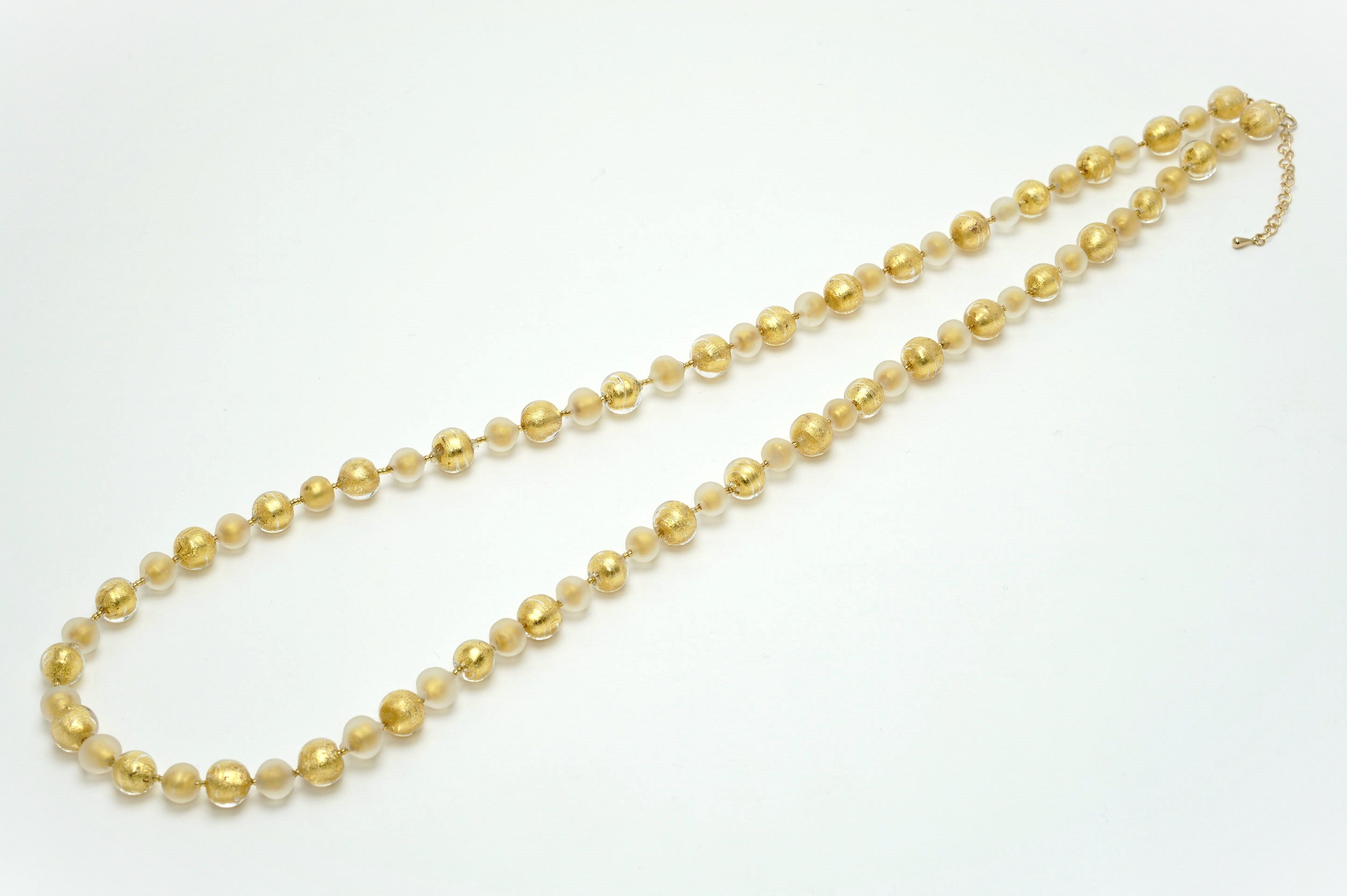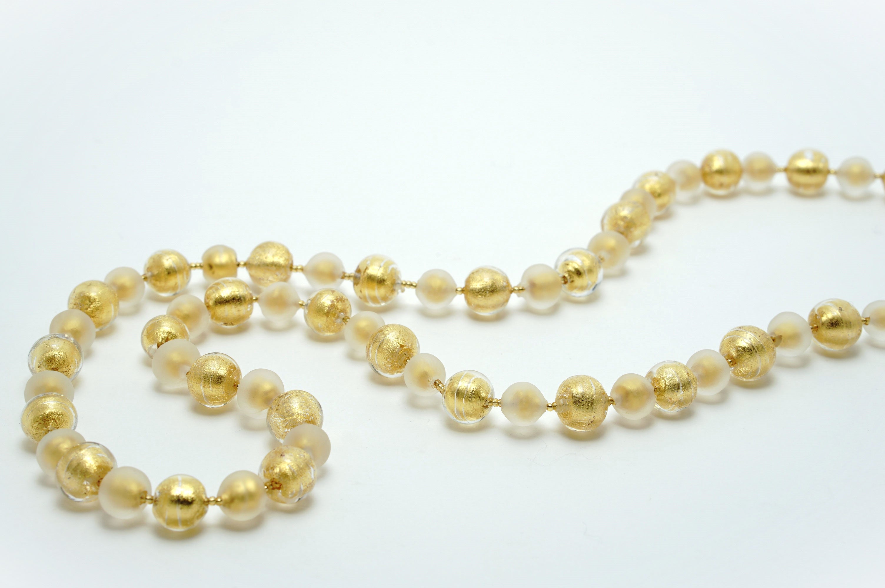透明なガラスと金箔のみのビーズを組み合わせたとってもシンプルなネックレス。