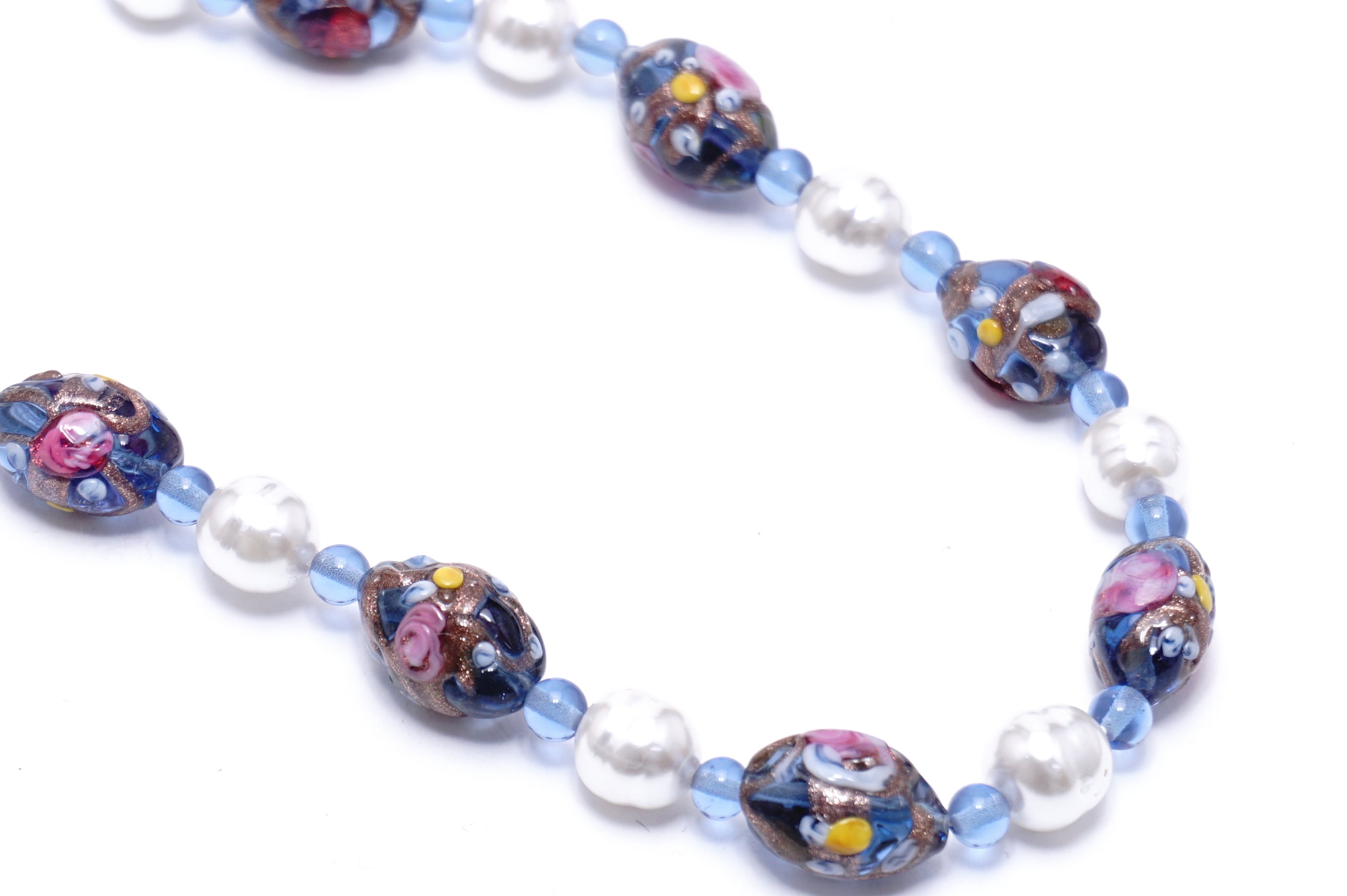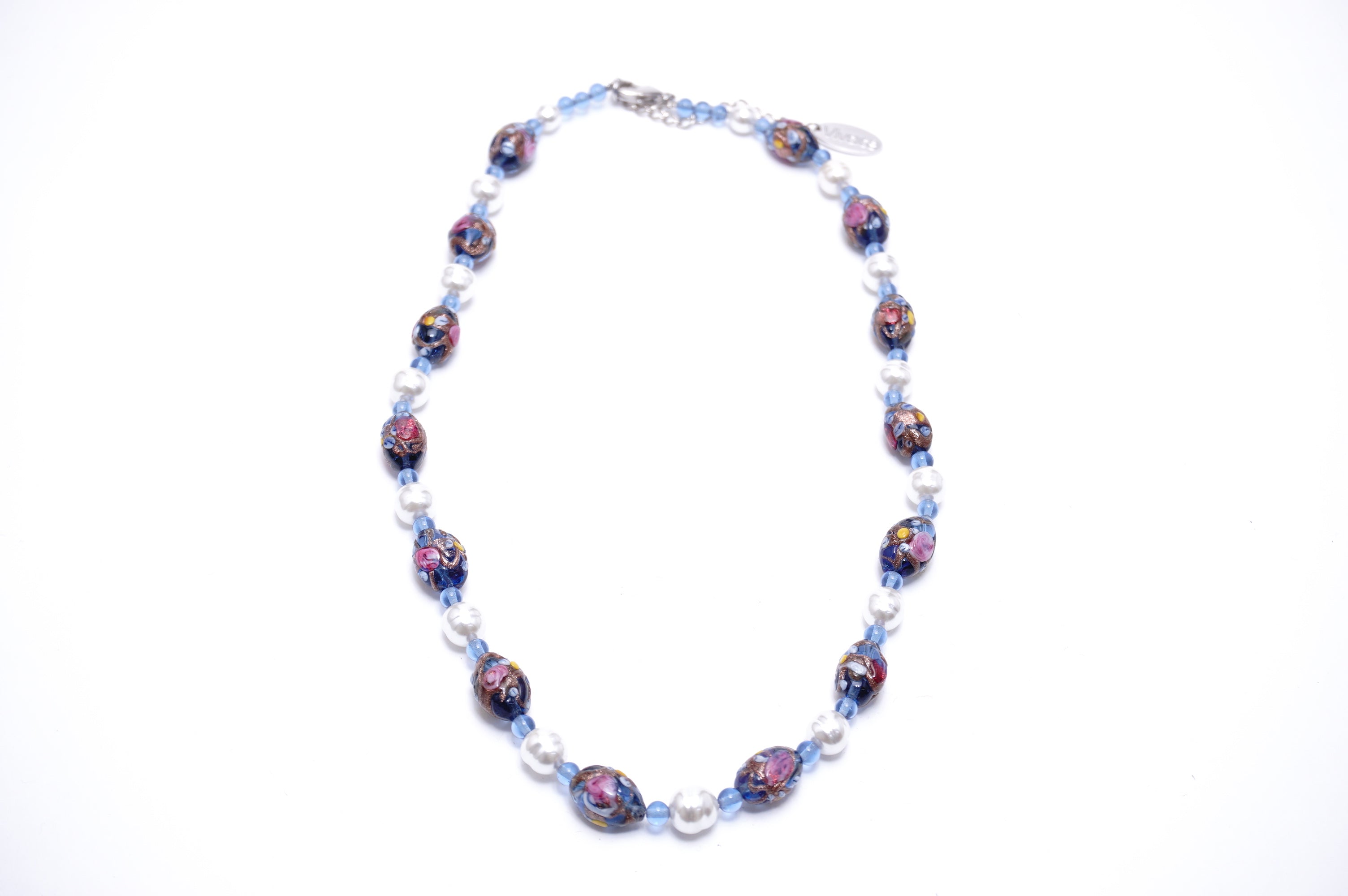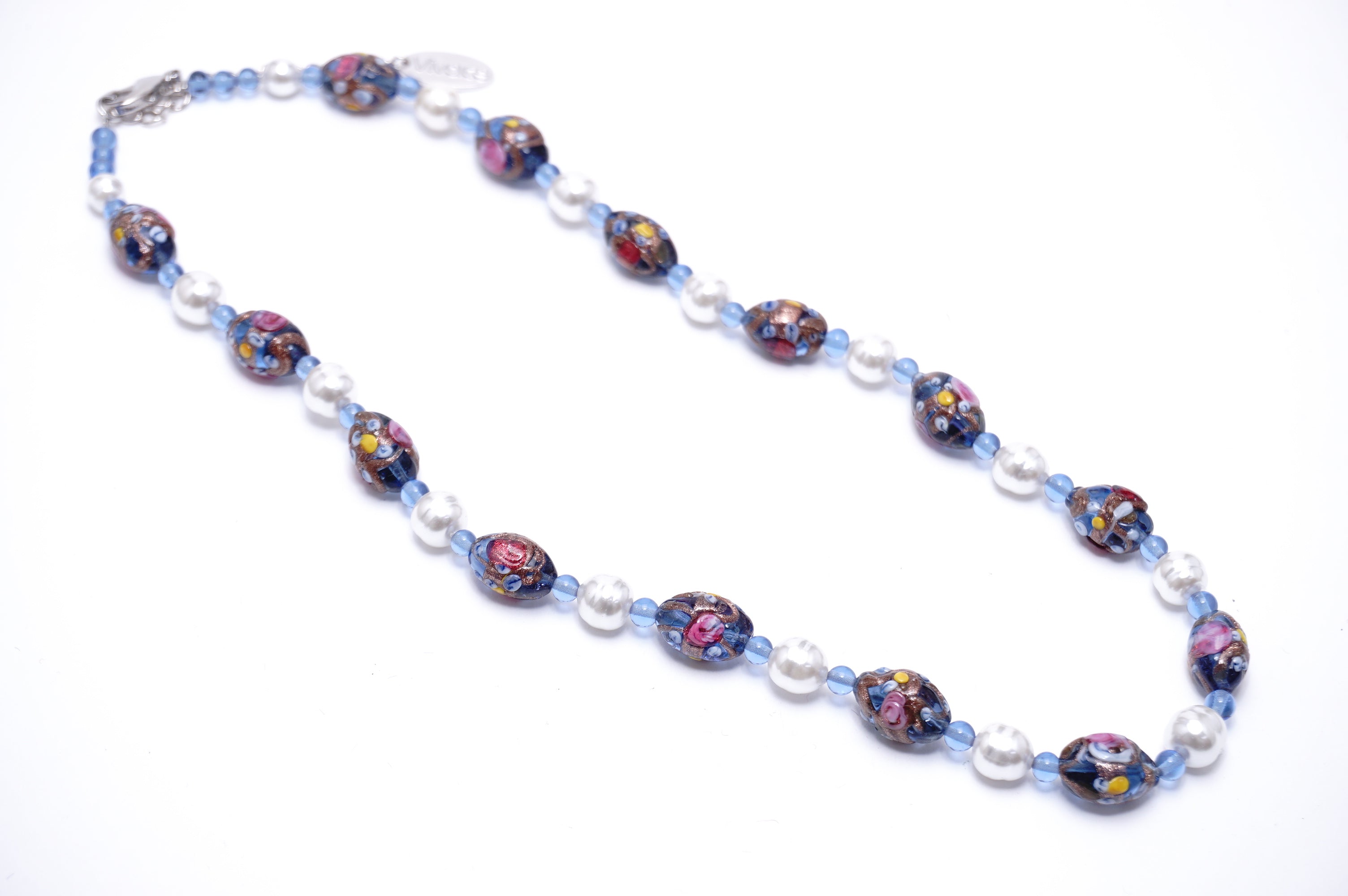 溶かしたガラス棒でお花柄を描く技法「フィオラーテ」ビーズと、日本製のガラスパールを繋ぎデザインしたネックレス。