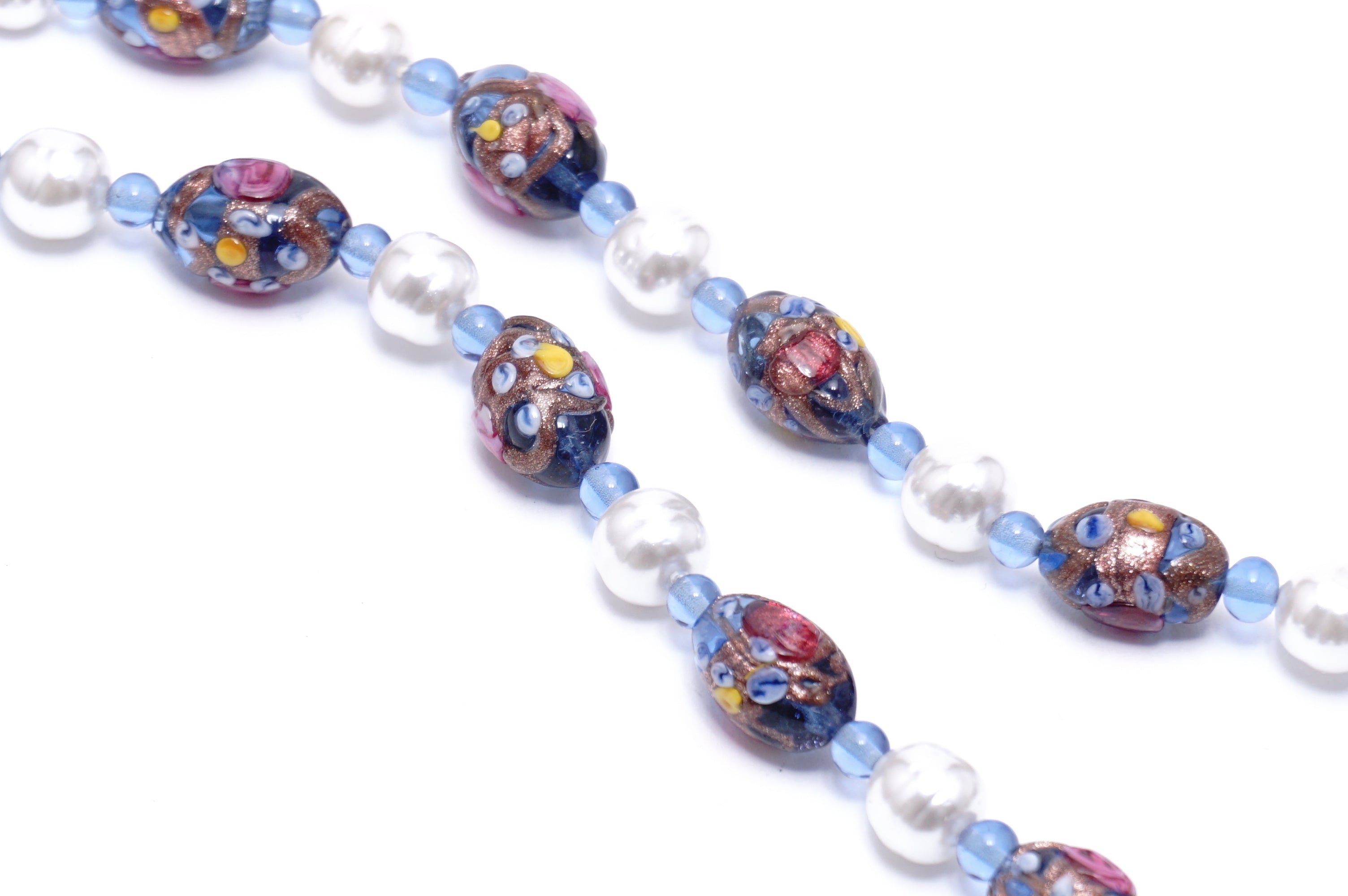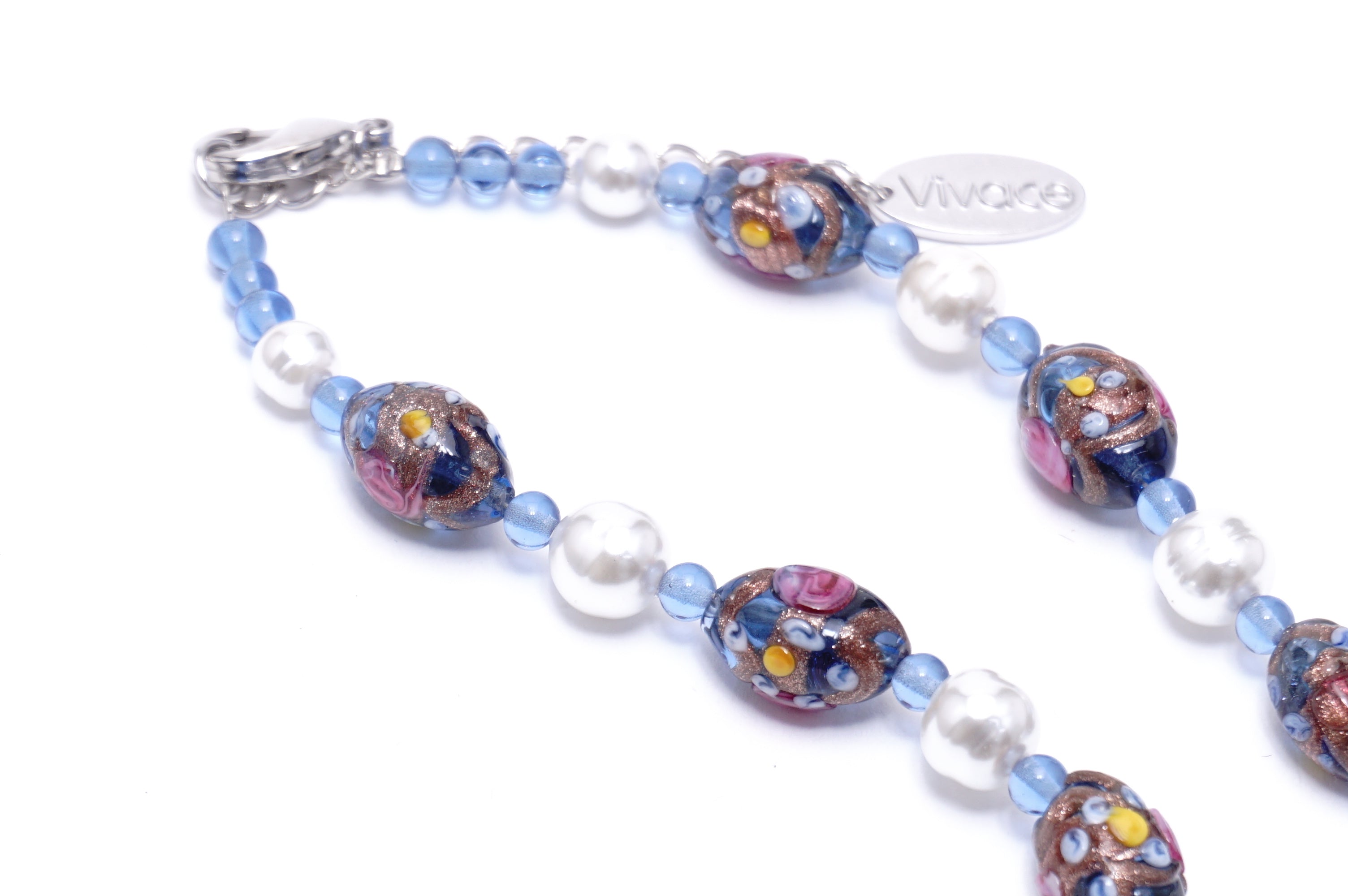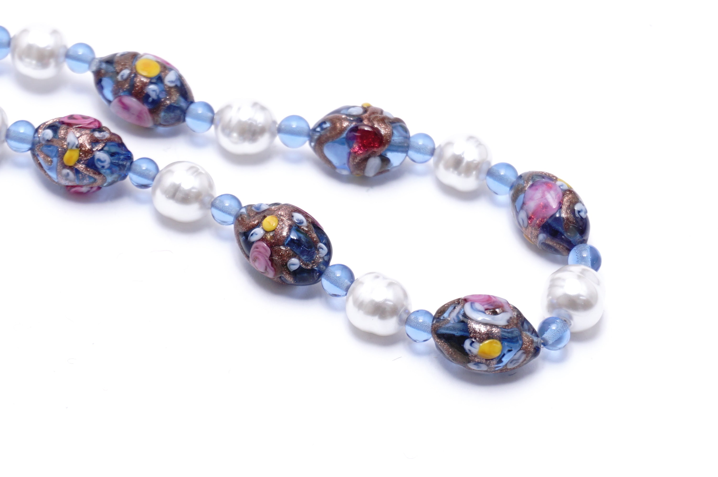 溶かしたガラス棒でお花柄を描く技法「フィオラーテ」ビーズと、日本製のガラスパールを繋ぎデザインしたネックレス。
