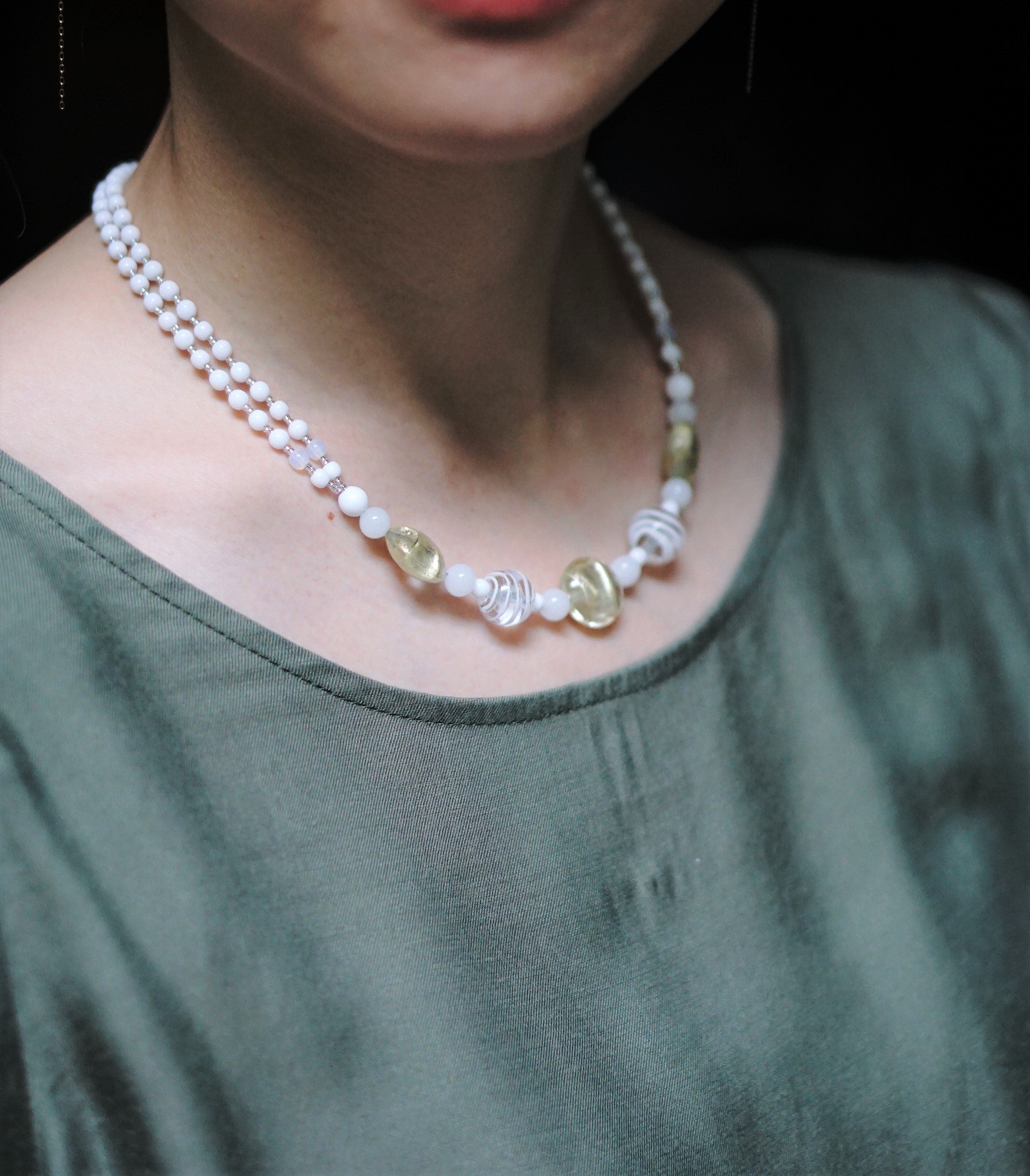 その他にはぐるぐるとしたうずまき模様のビーズ、アイボリーや乳白、白など様々な白色のビーズを使いデザインしています。