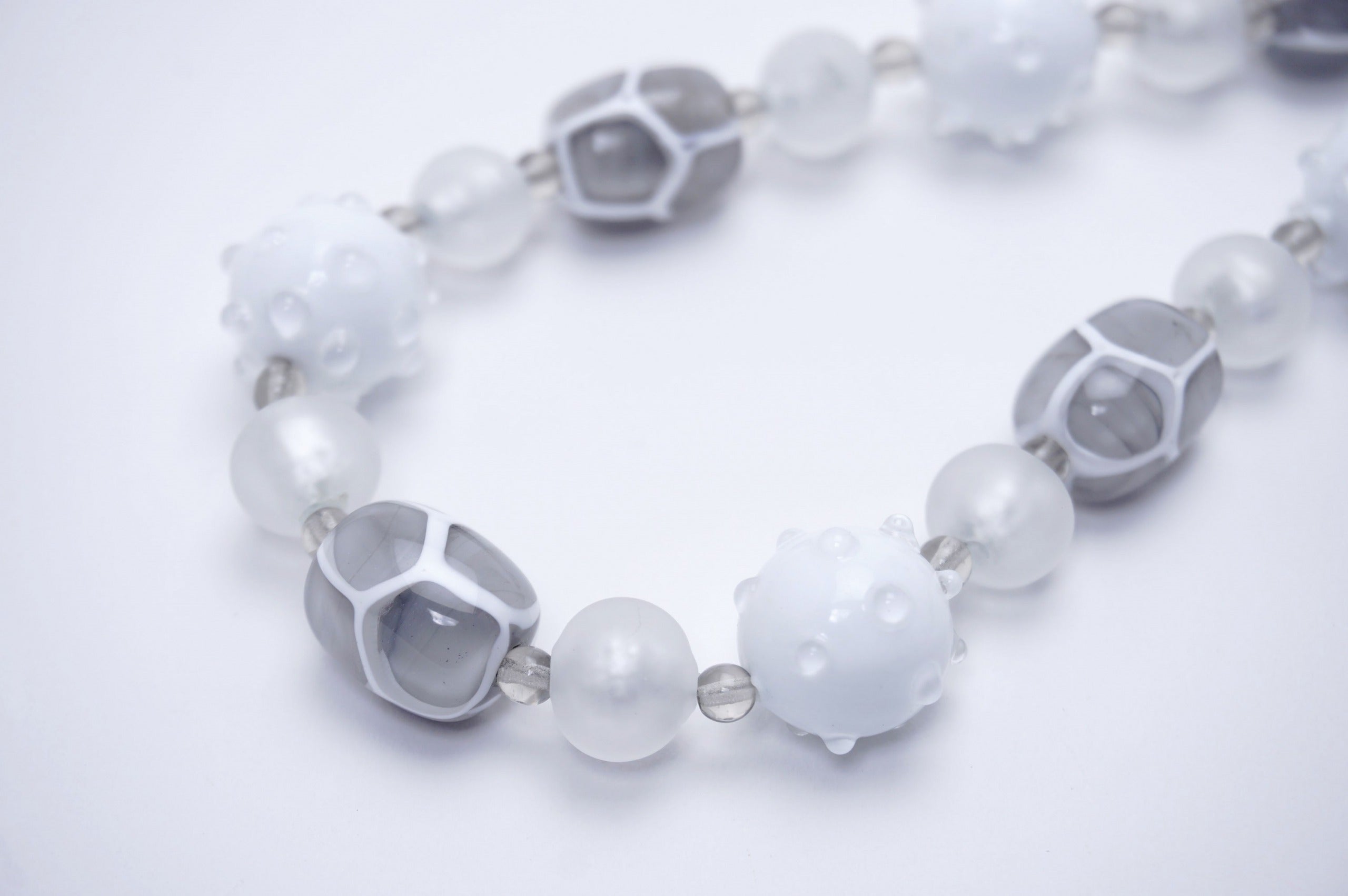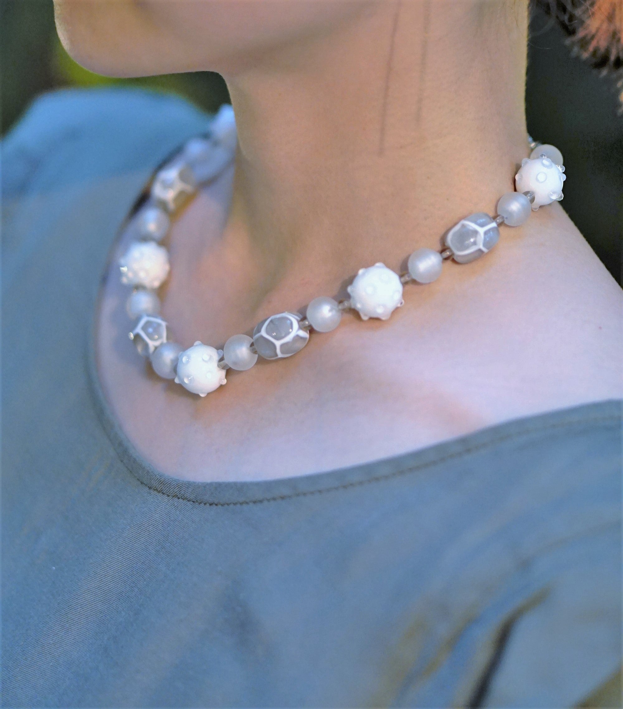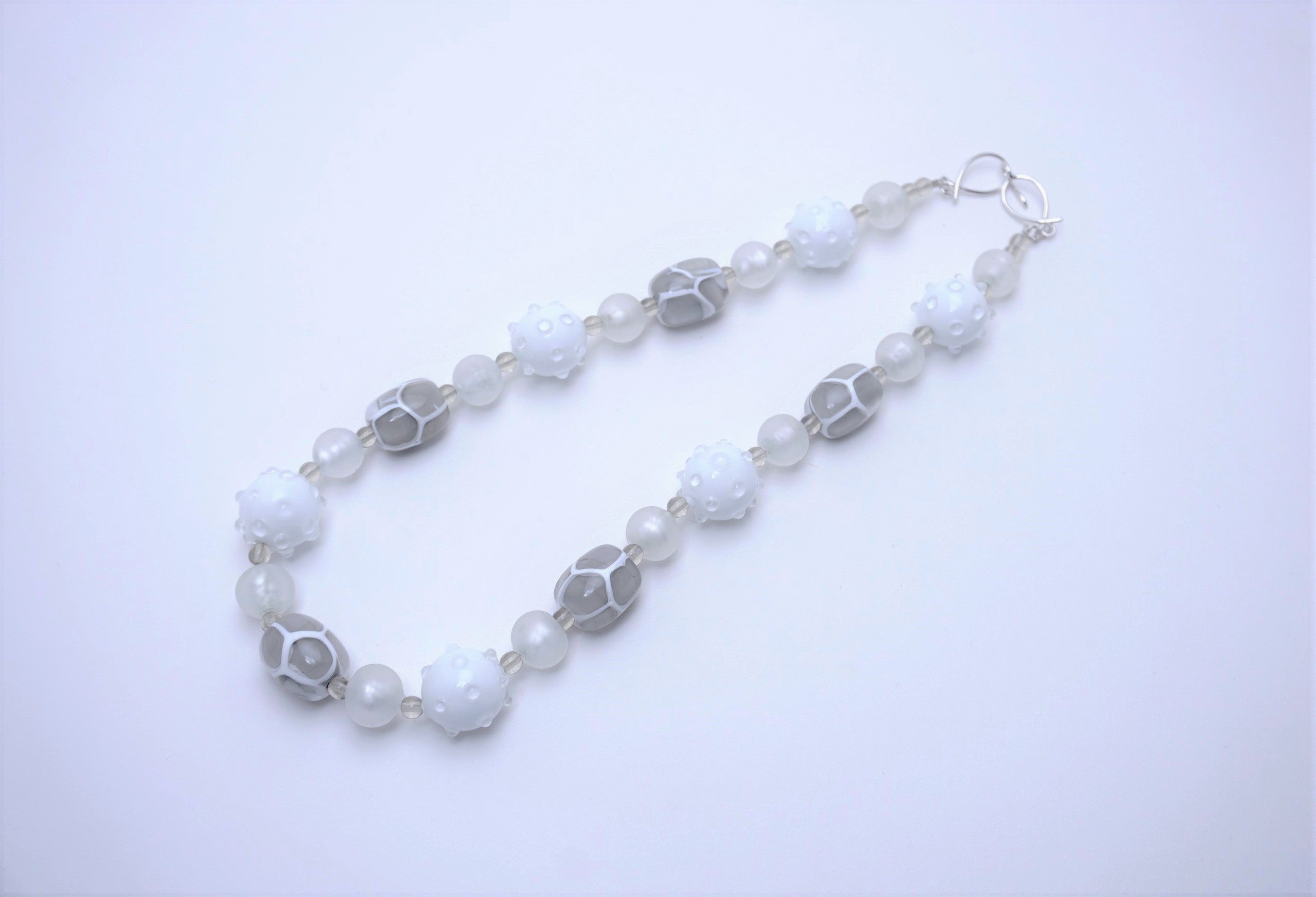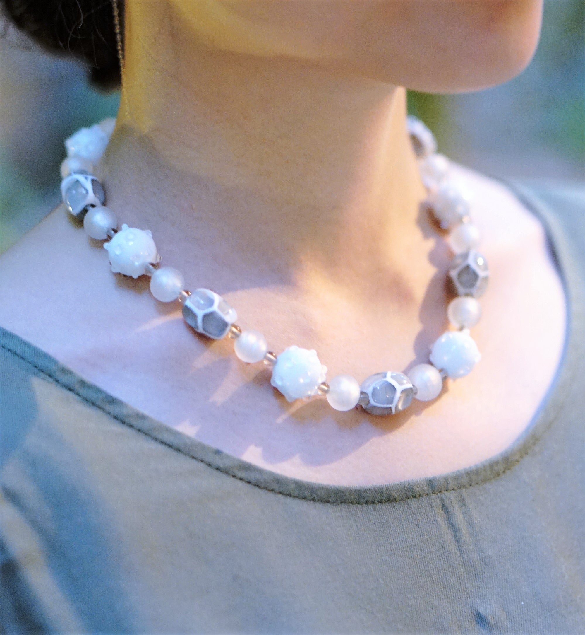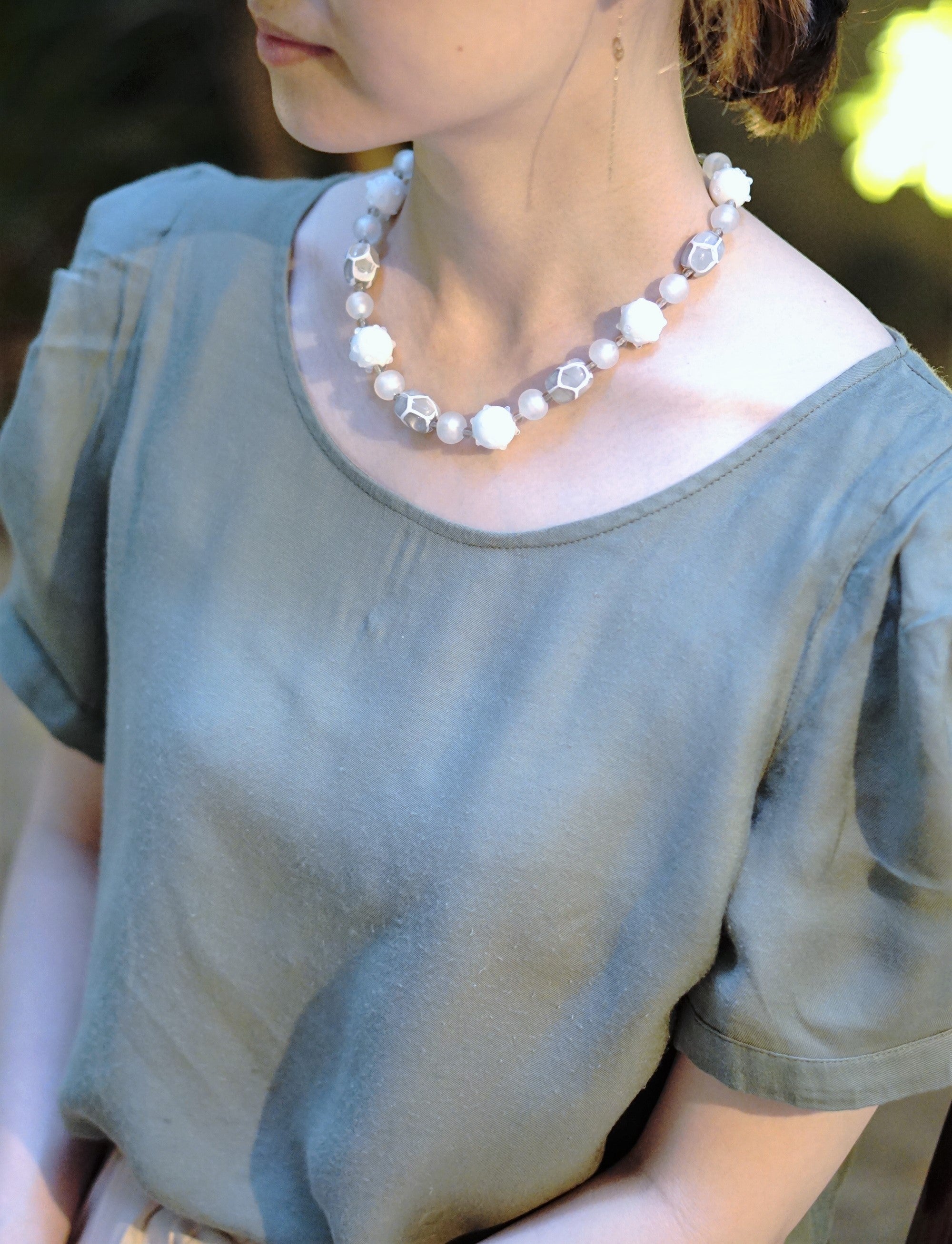 しんしんと降る雪空のように落ち着いたグレーでまとめたネックレス。