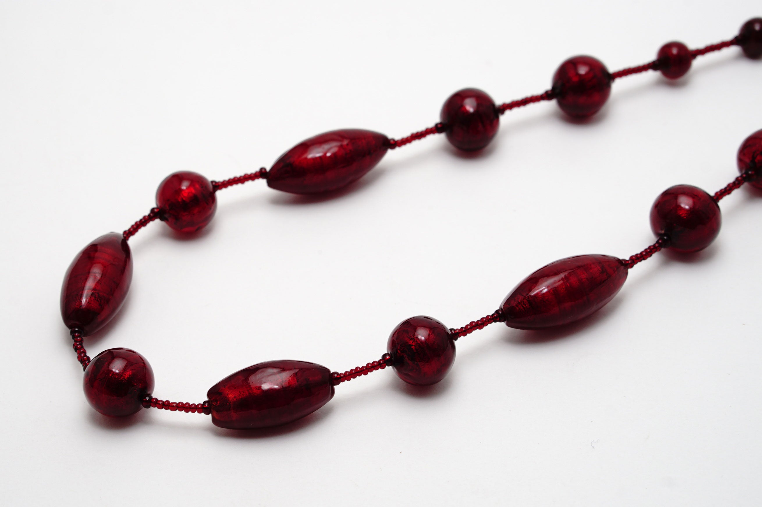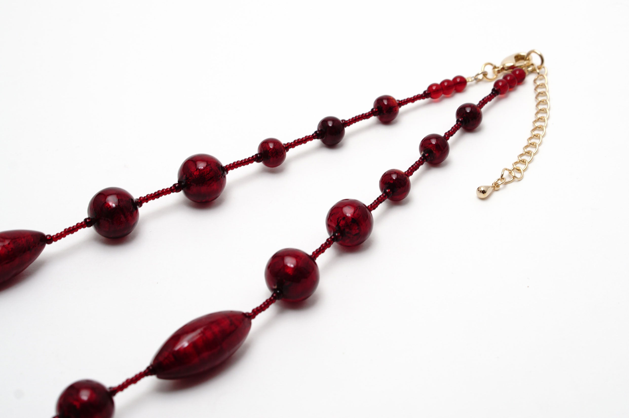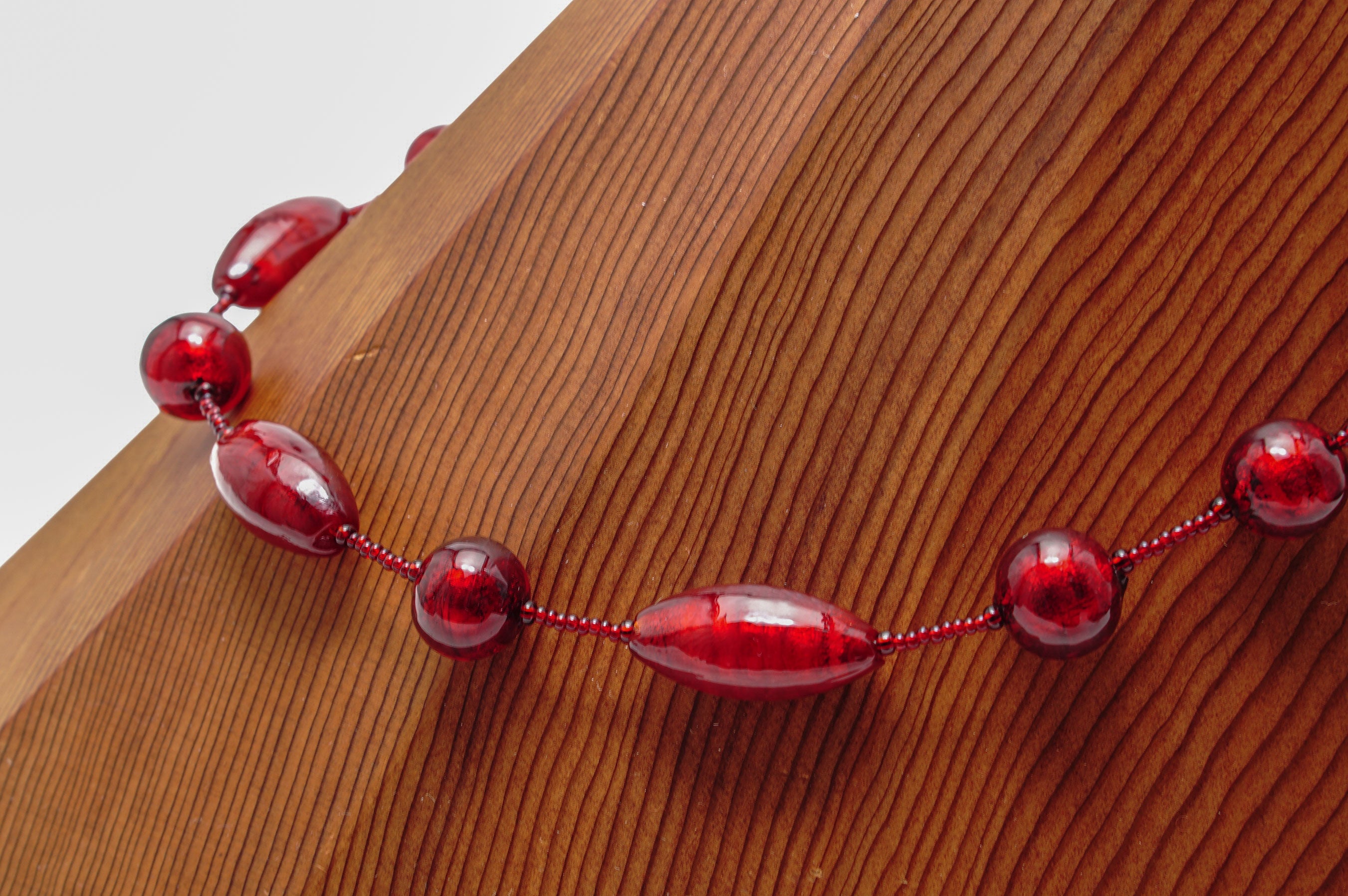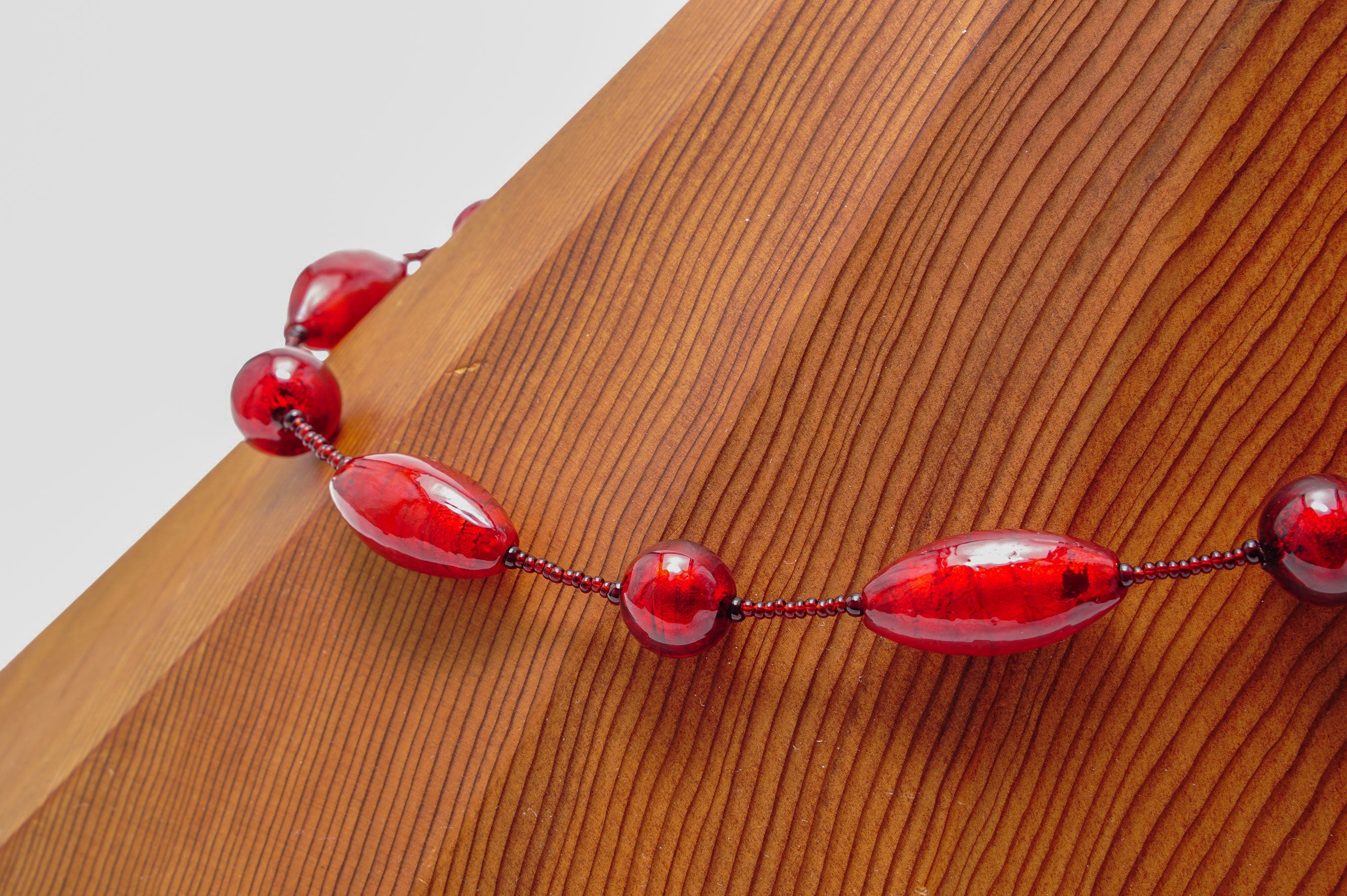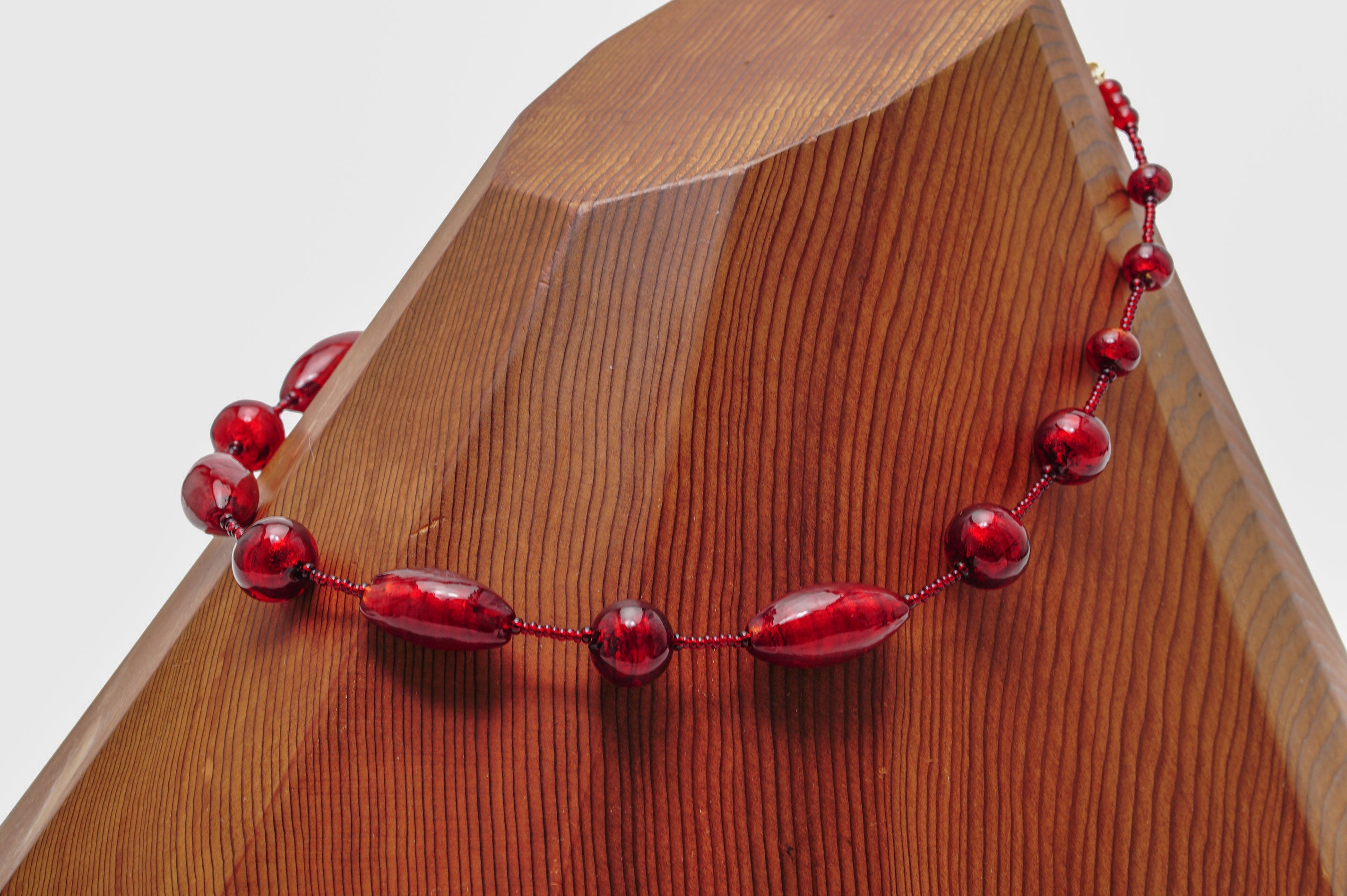 お洋服のお色やお肌の上などそれぞれ印象が大きく変わり、様々な表情をみせてくれるのもまたムラーノガラスの深紅の大きな特徴といえるでしょう。
