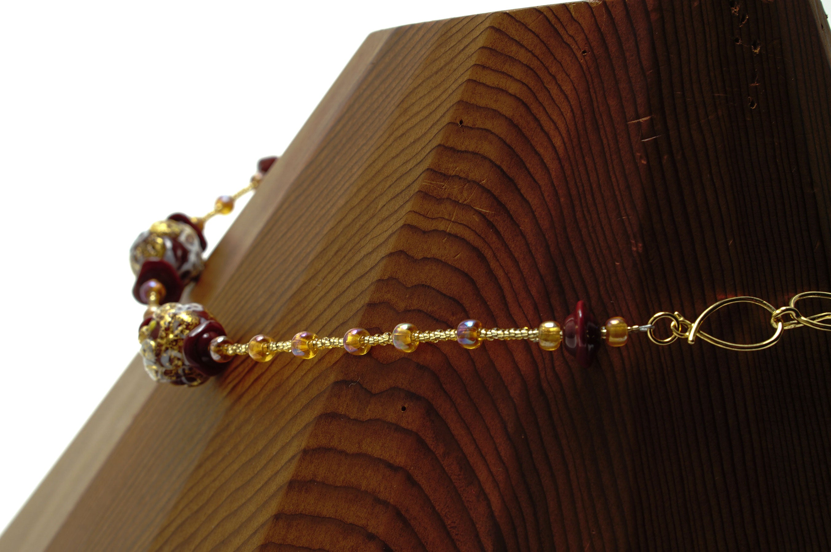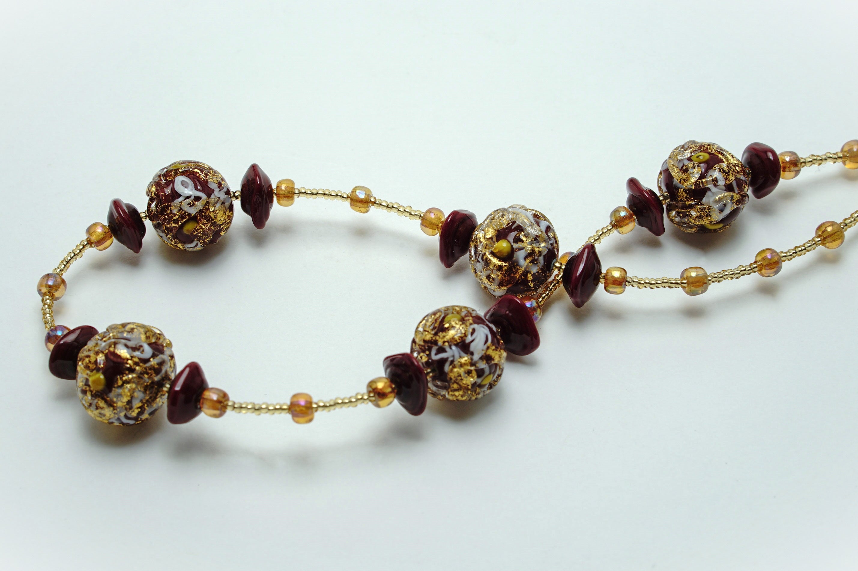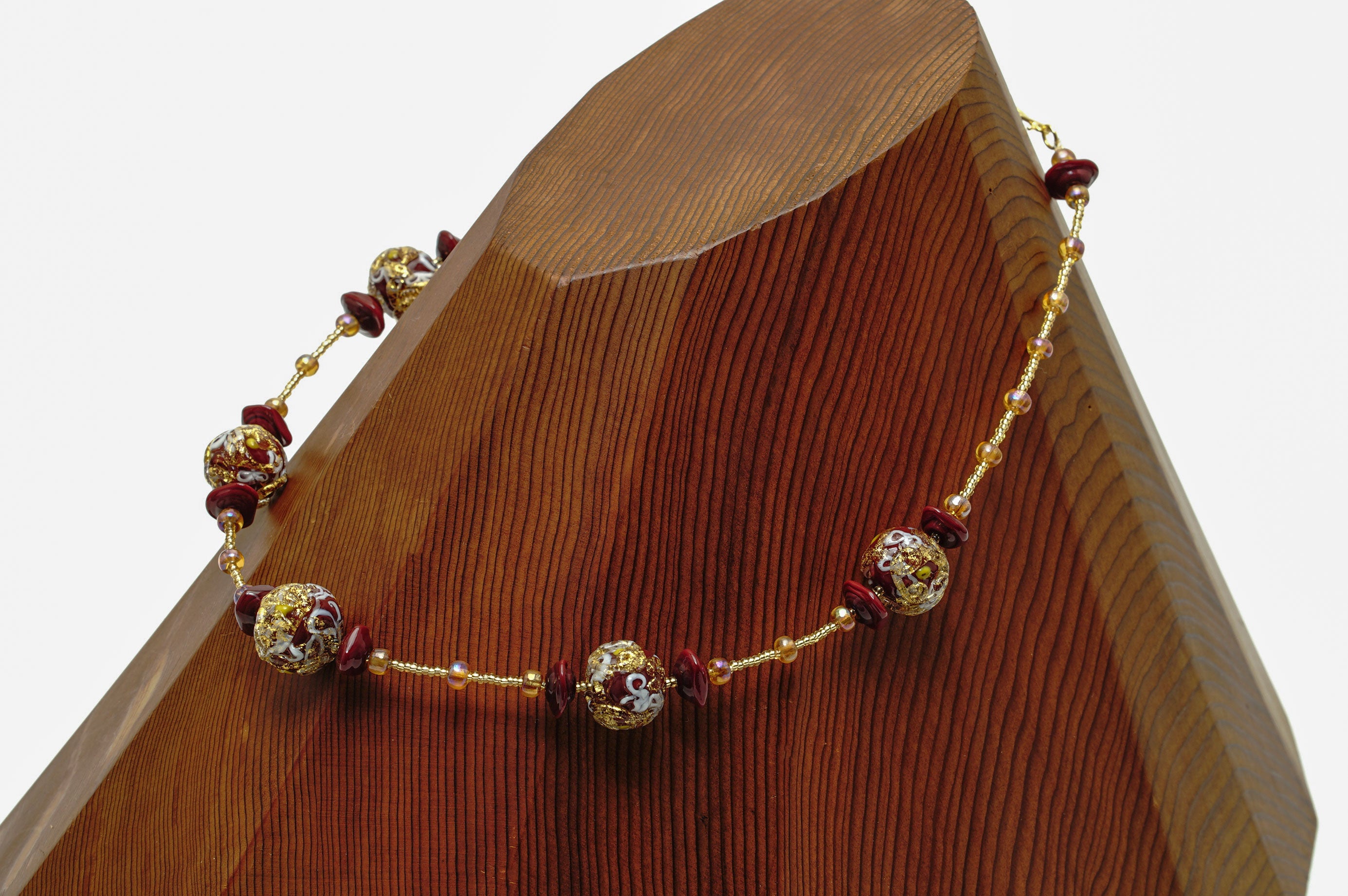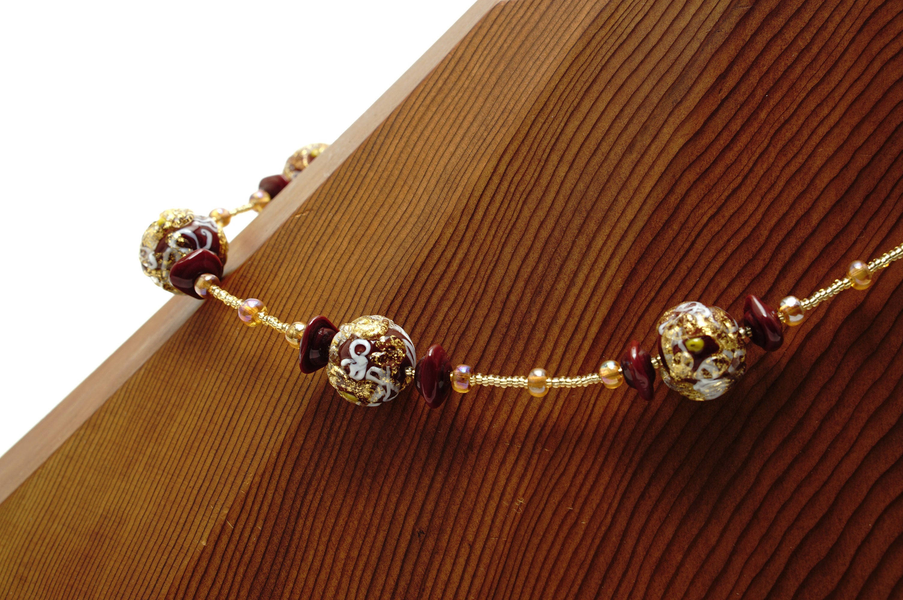 マットな赤色でビーズを作り、その上に細く引き伸ばした白色のガラス、さらにその上に金箔を付けた透明なガラスで模様を描いています。