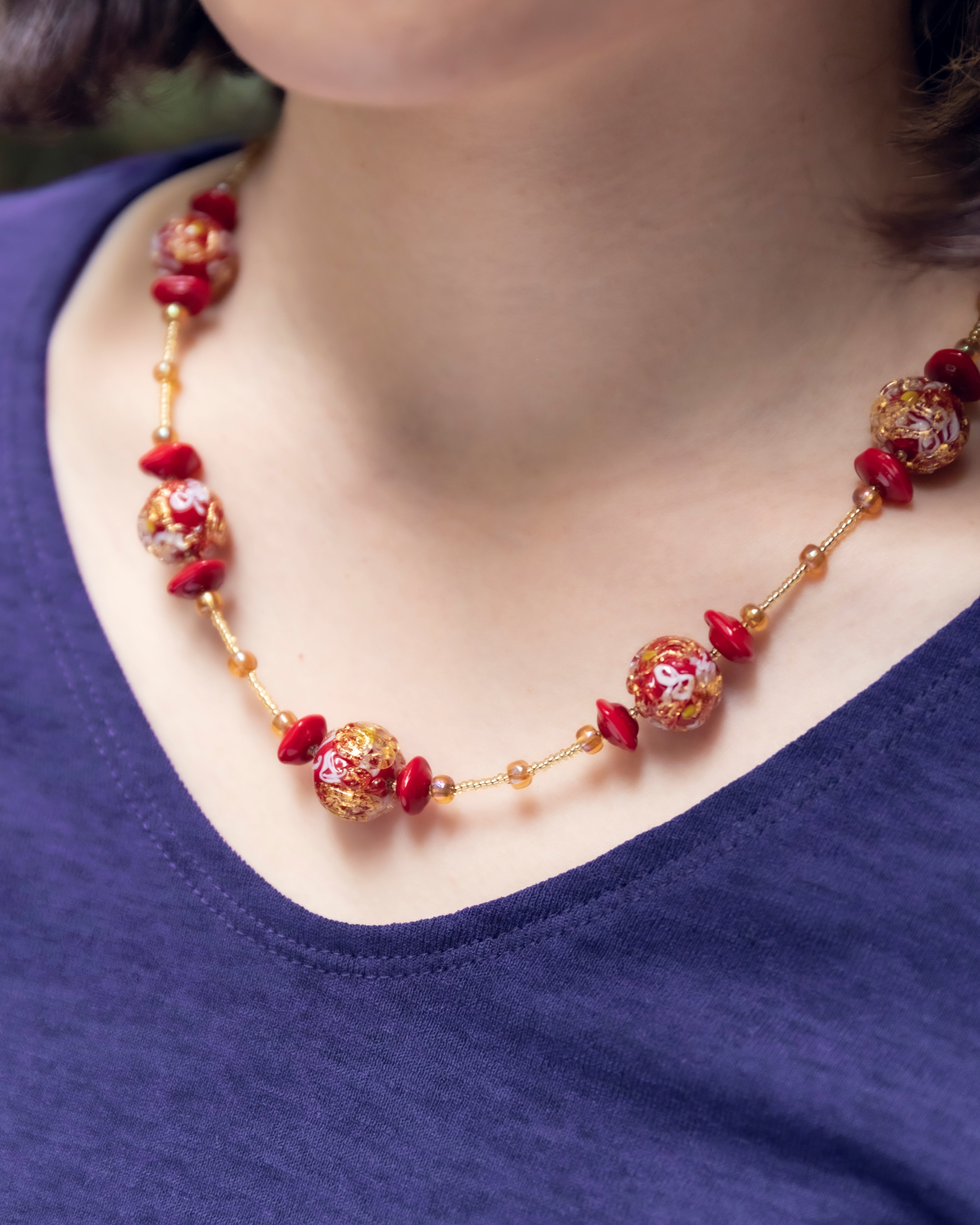 ムラーノガラスならではの赤は重厚感がありますが、重たくなりすぎないようにコンテリエという芥子粒大のガラスビーズと合わせました。