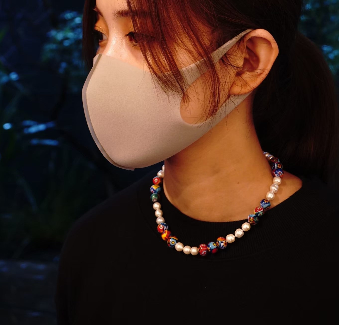 大地のように力強く、そして地球のように丸いムリーネビーズにガラスパールをかけ合わせました。