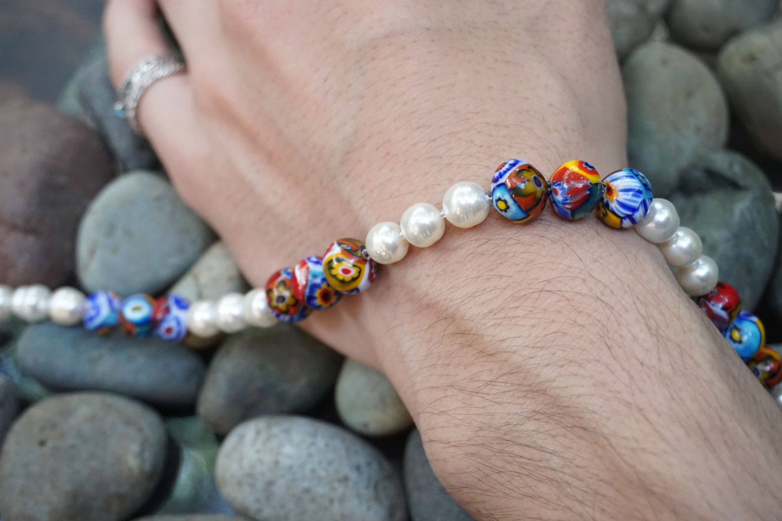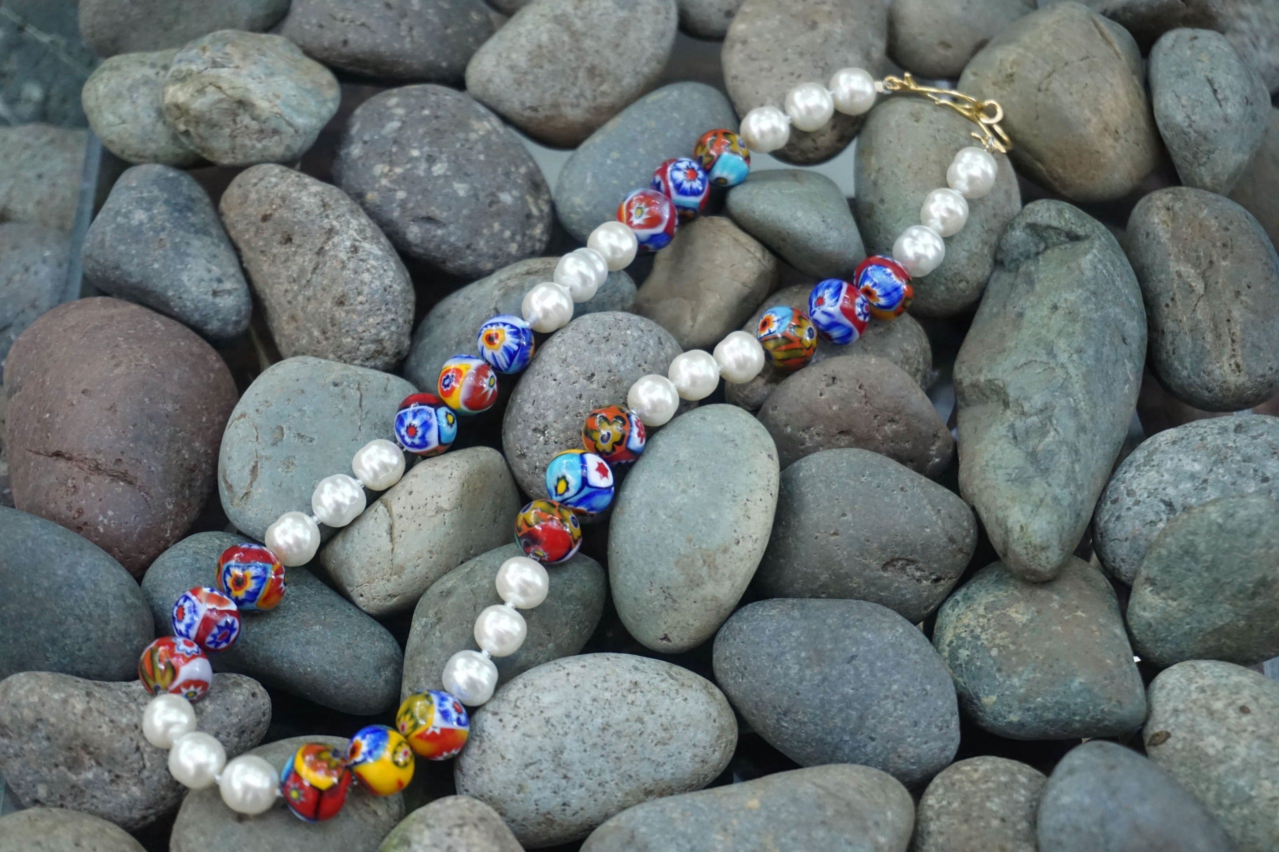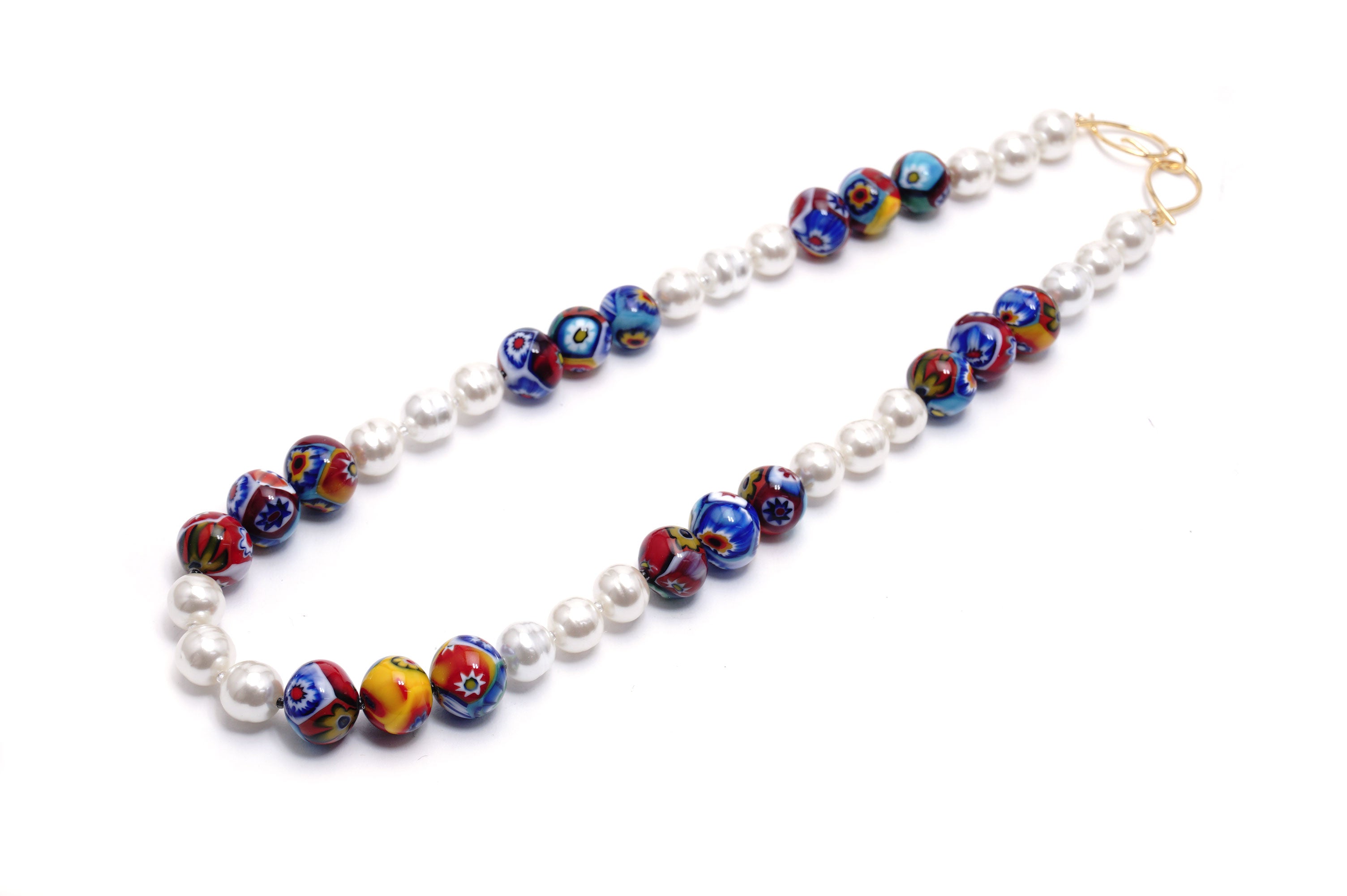 イタリアはムラーノ島の技術が光る、小さな金太郎飴状のガラス棒を芯に圧着し作るムリーネビーズ。
