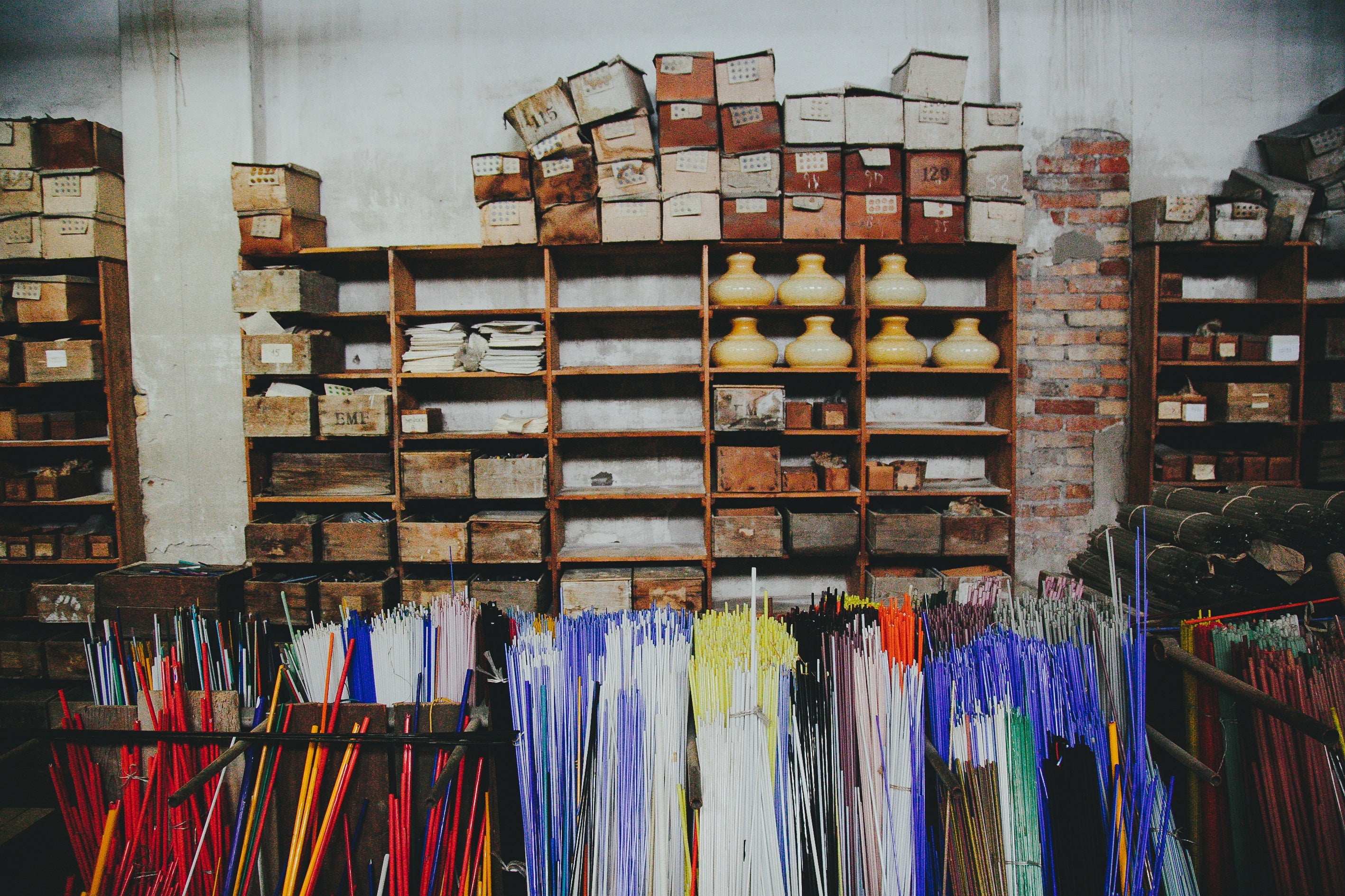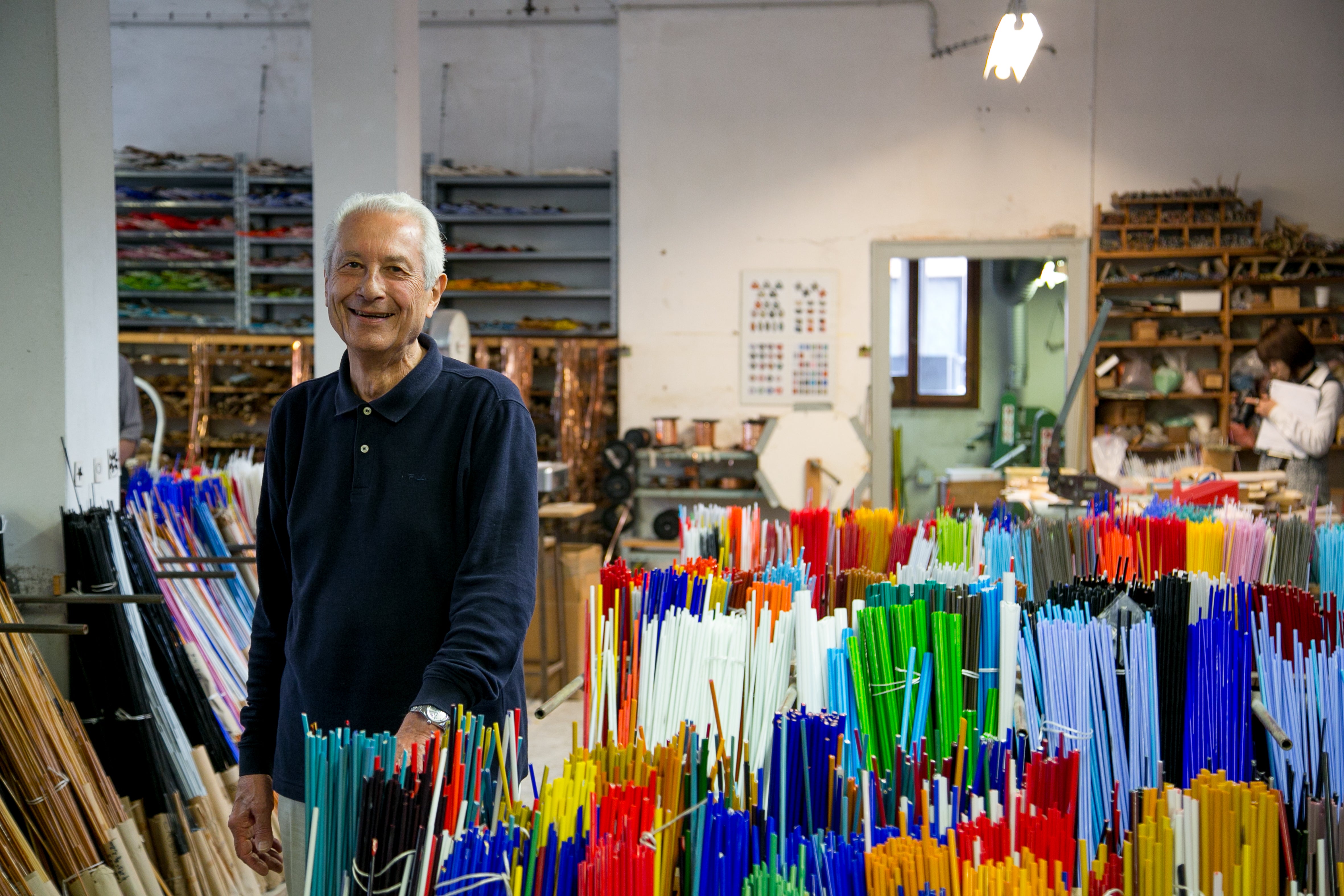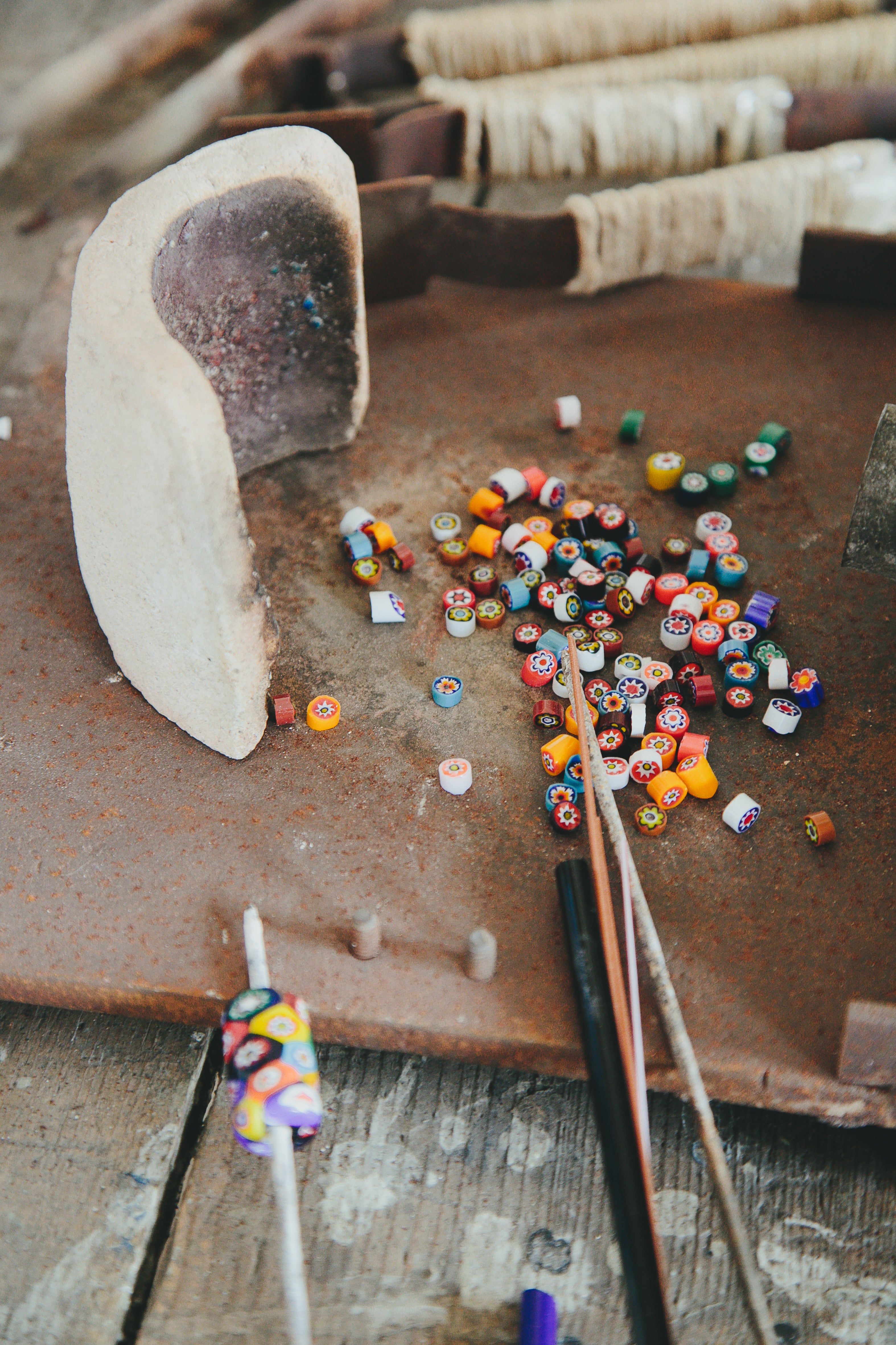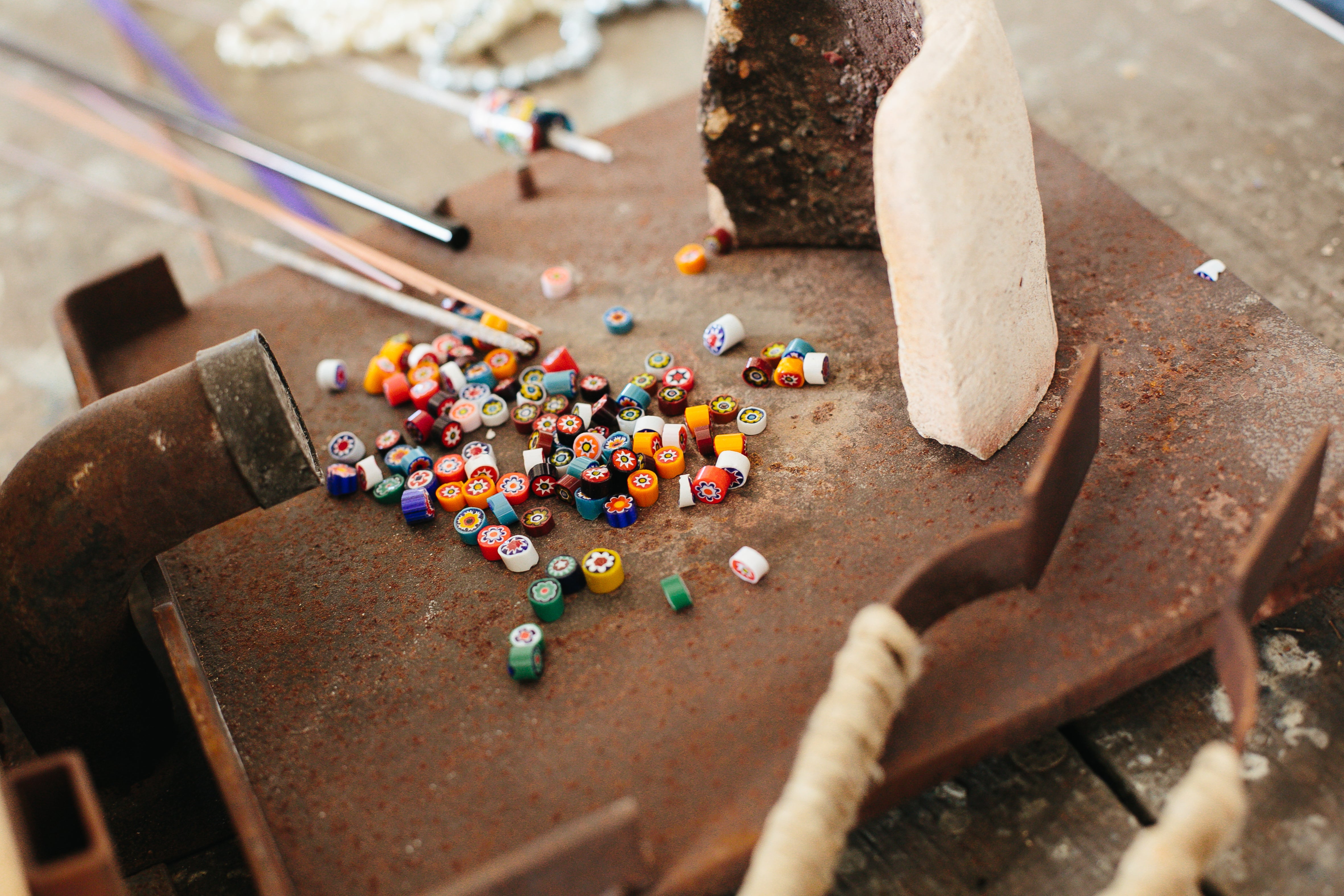 直径約1cmの小さなピースに仕上げるためには、極細に作られたガラス棒を一本一本ピンセットで慎重に並べるという、熟練の技術と忍耐が必要です。ムリーネ模様を丁寧に配置し、低温で焼成した後、丹念に磨き上げることで完成します。