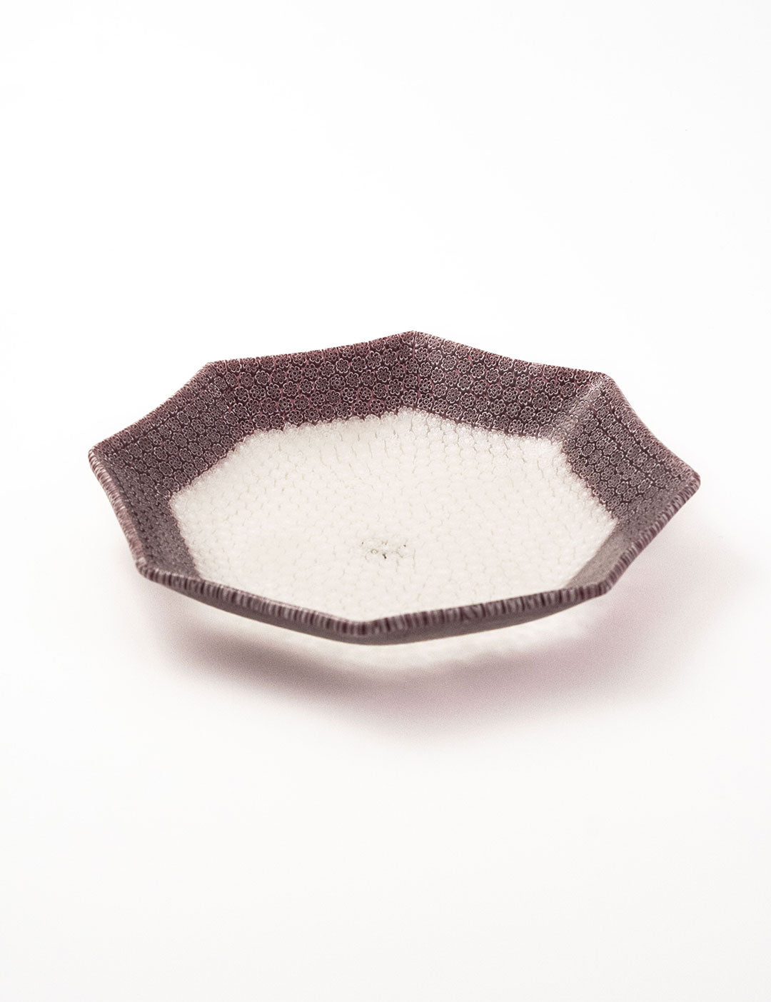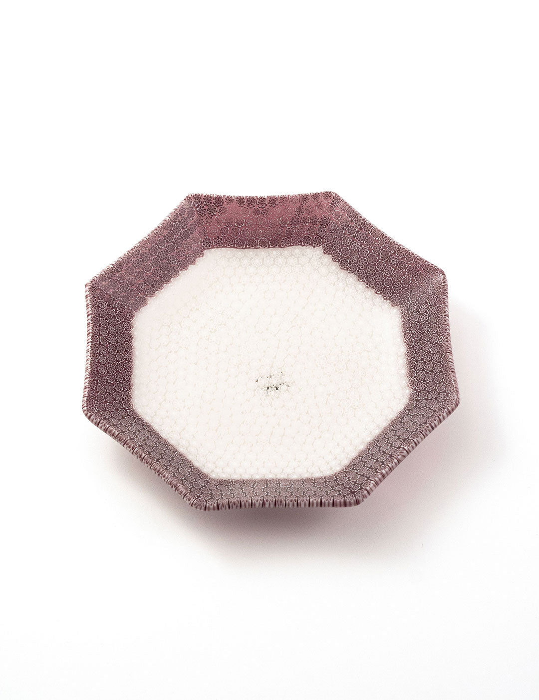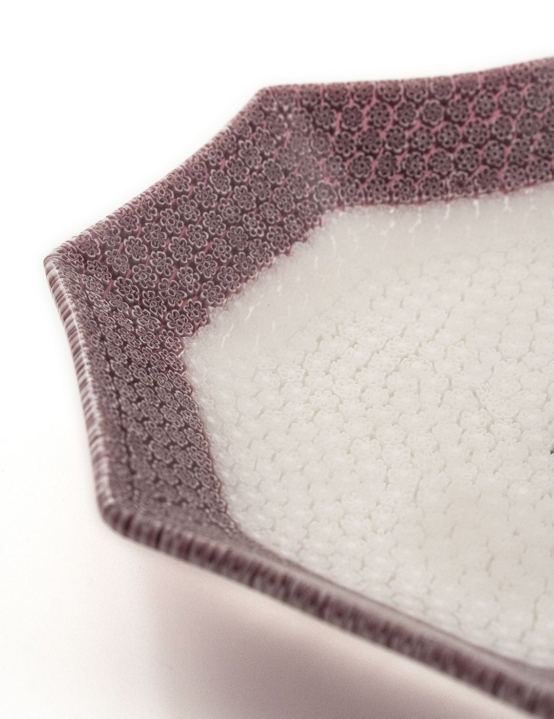 こちらの花霞は、アメジスト色のムリーネと白のムリーネを並べられて作られていますが、ムリーネのサイズがひとつずつ違うため、色の境目の並び方に独特なラインが生まれ、ユニークな表情をみせてくれています。ぜひお手に取って見ていただきたい作品です。
