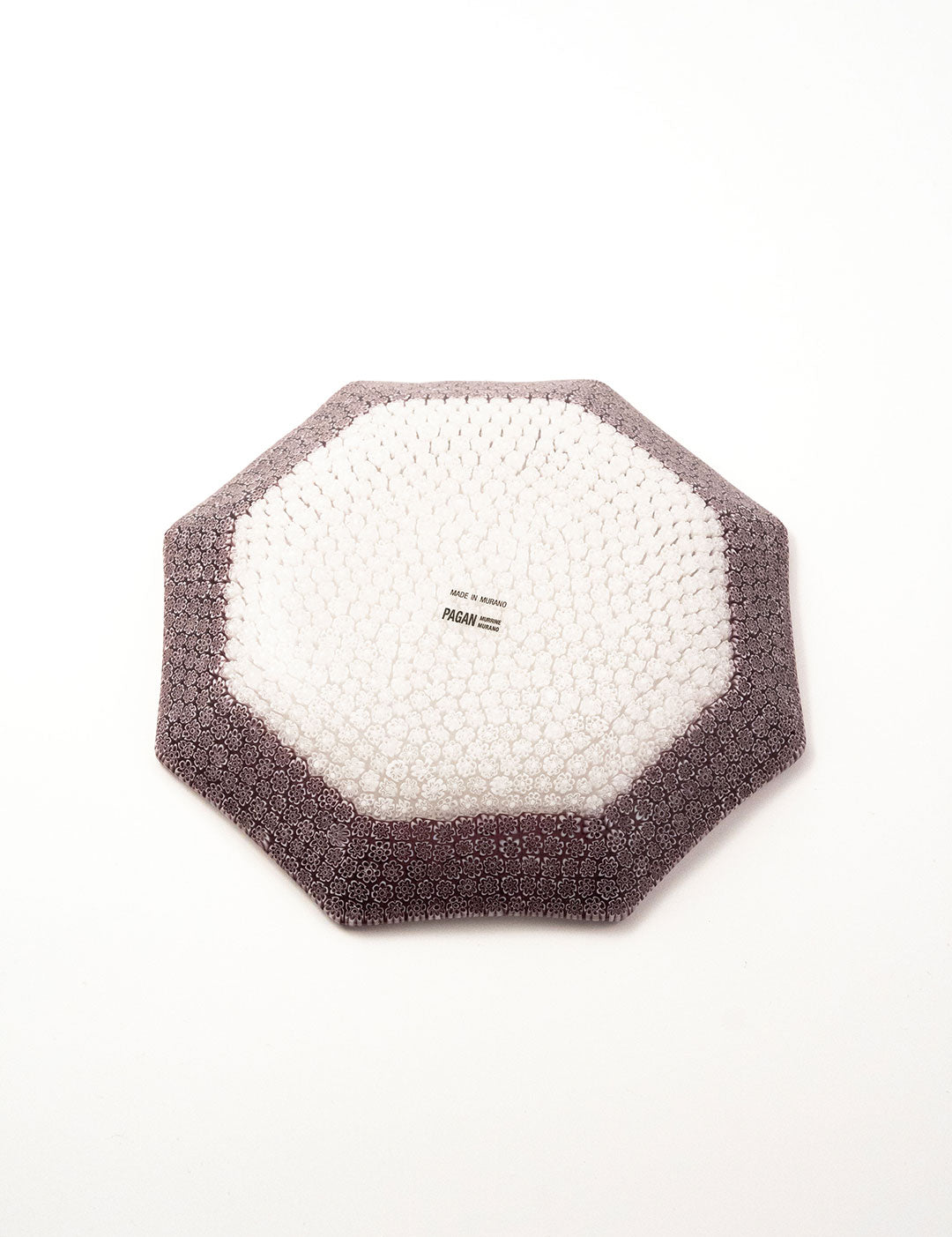 パガン工房の作品は、優しい風合いのムリーネが特徴的です。ほかのムリーネを扱う工房が分業制であるのに対し、ムリーネをピンセットで並べる作業から数回にわたる焼成、研磨まですべて自分たちで行っているため、一枚のお皿を作るのに5日間ほどかけて少人数で、丁寧につくられています。手に取ると、とても手なじみがよく、端まで美しく並んだムリーネひとつひとつの表情が大変に魅力的です。