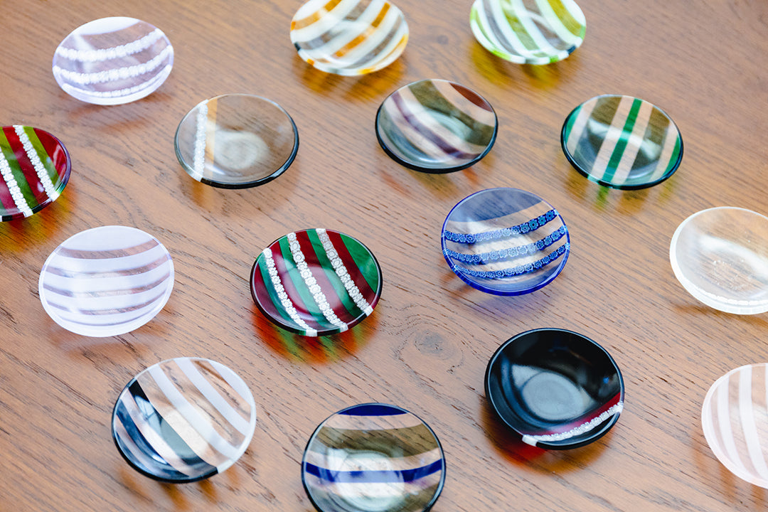 パガン工房の作品は、優しい風合いのムリーネが特徴的です。ほかのムリーネを扱う工房が分業制であるのに対し、ムリーネをピンセットで並べる作業から数回にわたる焼成、研磨まですべて自分たちで行っているため、一枚のお皿を作るのに5日間ほどかけて少人数で、丁寧につくられています。手に取ると、とても手なじみがよく、端まで美しく並んだムリーネひとつひとつの表情が大変に魅力的です。