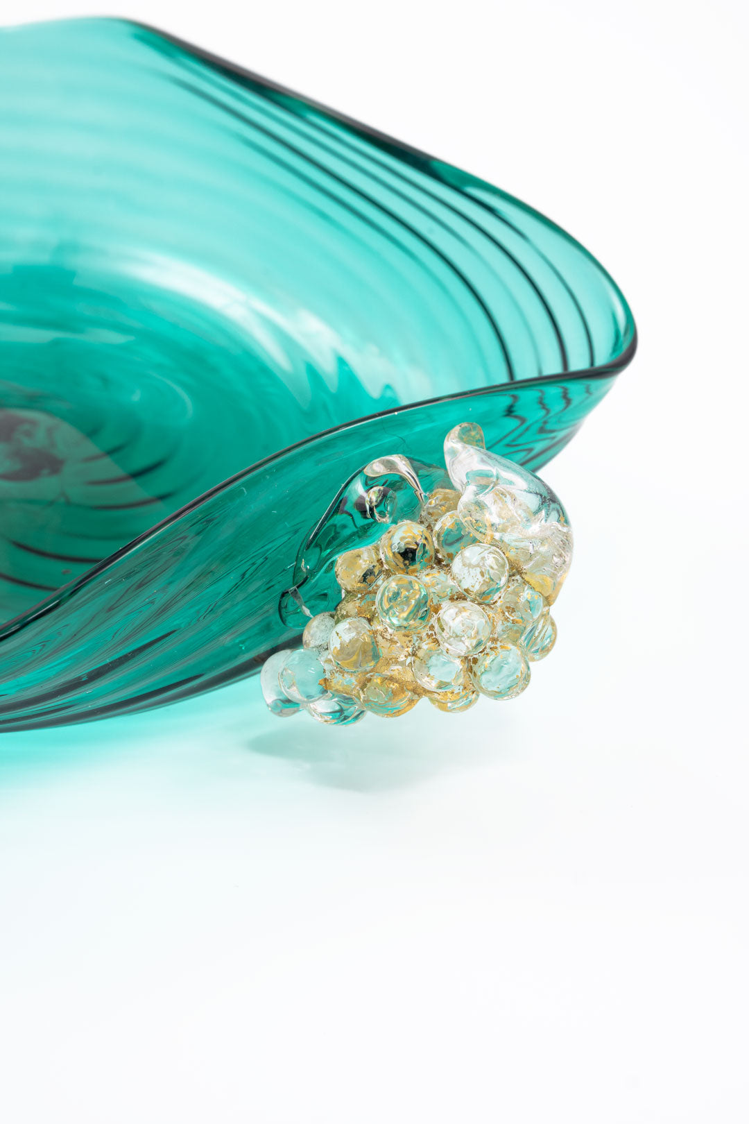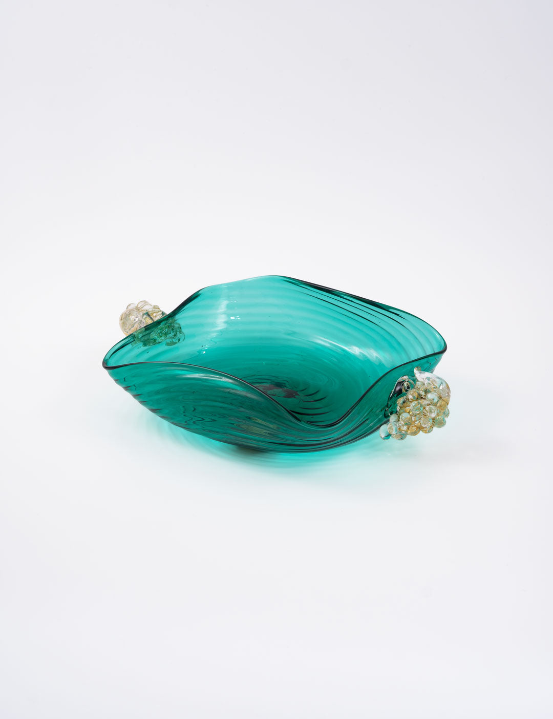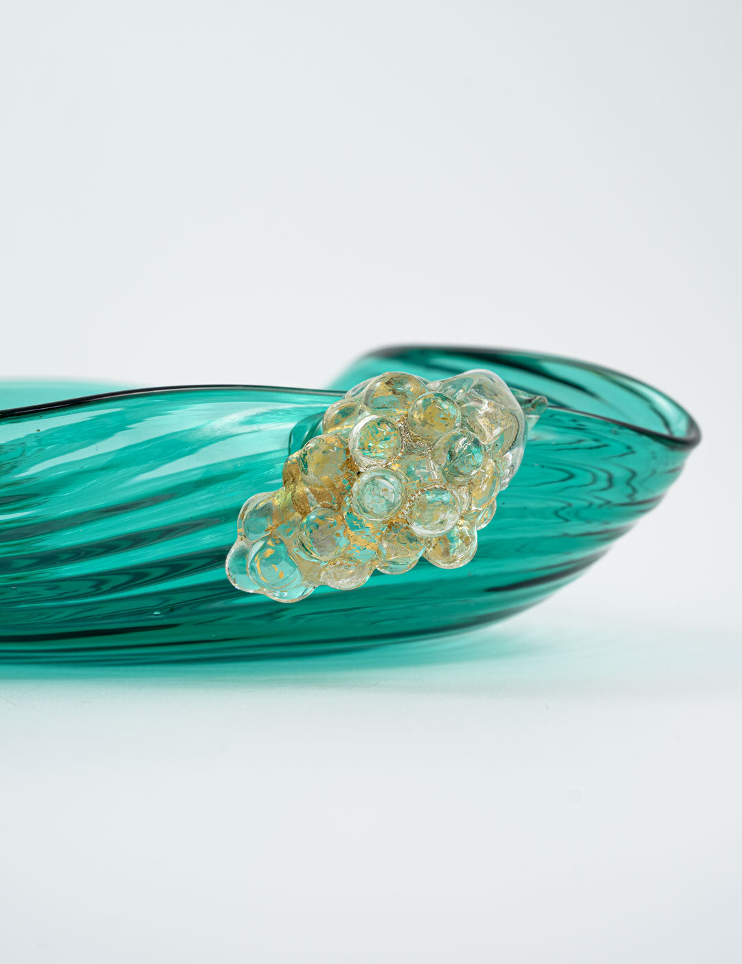 ぶどうは古来より豊かな収穫と繁栄を象徴し、ムラーノガラスでも多く愛されているデザインです。深い青みがかかったヴェルデの色味は、イタリアらしいカラーと言っても過言ではありません。波紋のように広がるガラスの表情は、食卓に贅沢な雰囲気と美しさを加えてくれます。70年前につくられたとは思えないテーブルウェアですが、木のテーブルにもピッタリ合います。