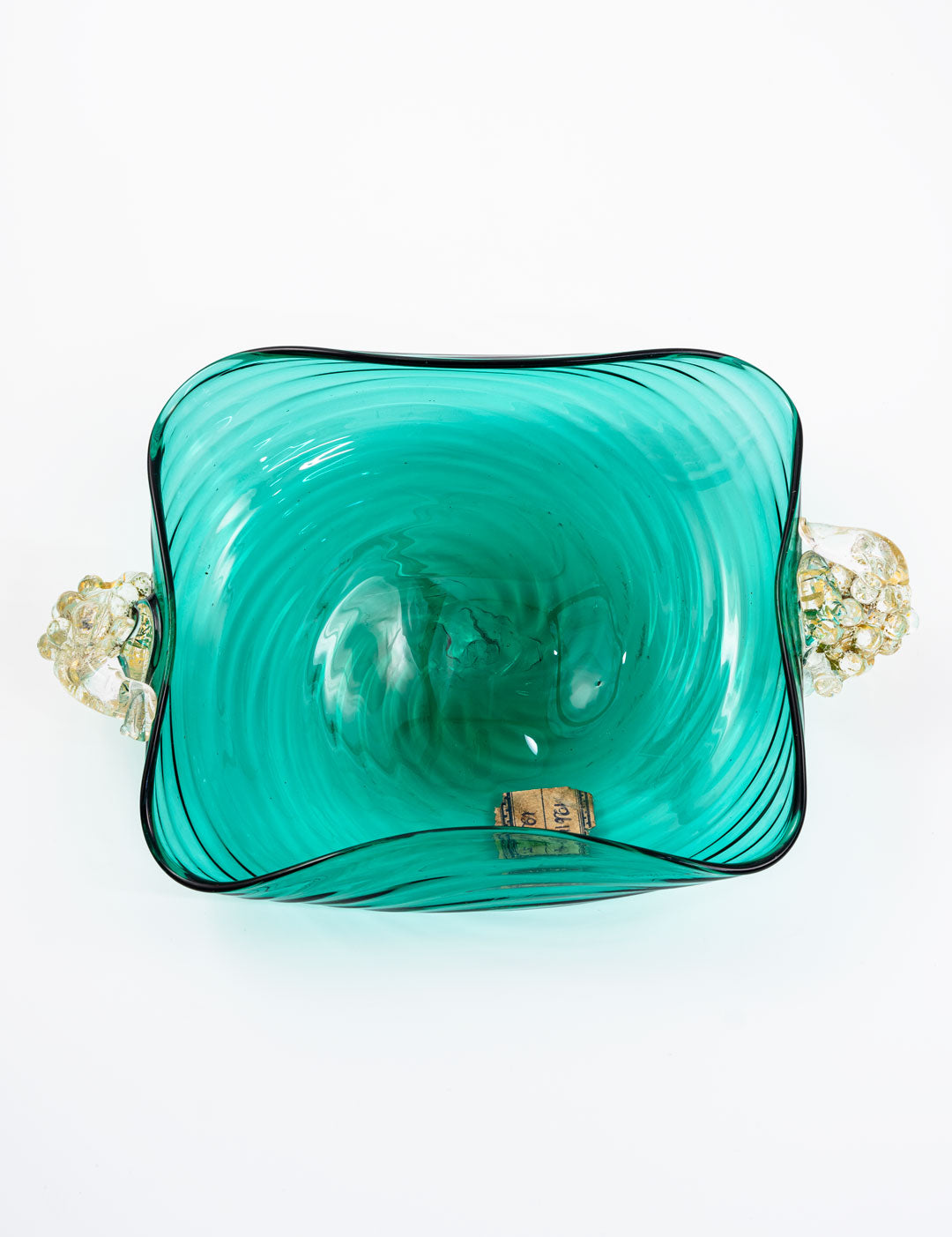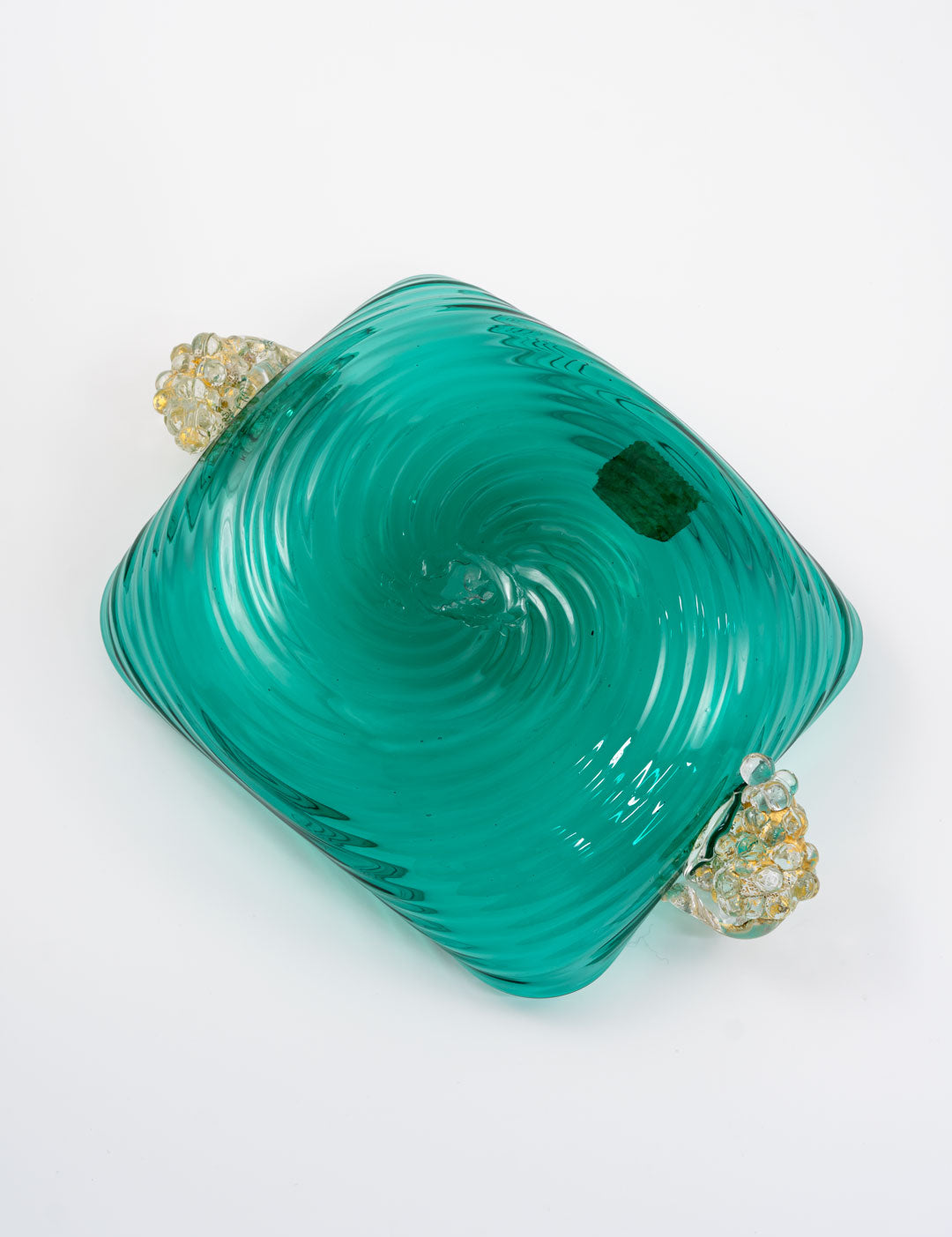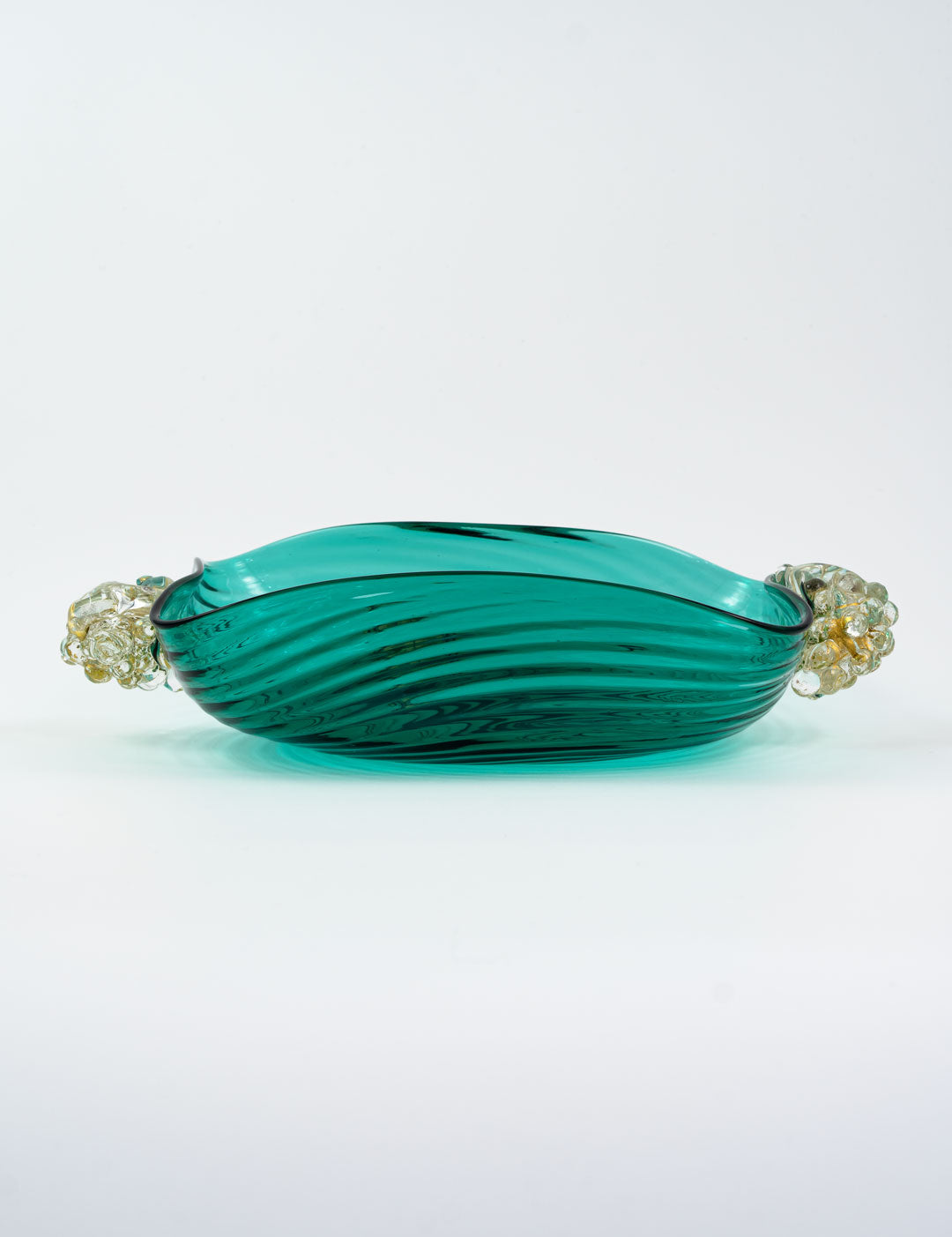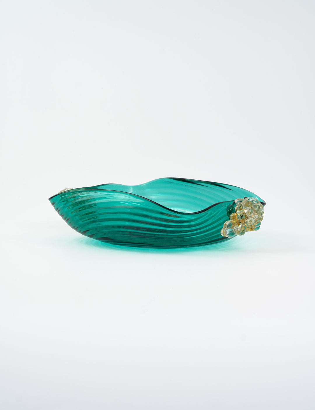 ぶどうは古来より豊かな収穫と繁栄を象徴し、ムラーノガラスでも多く愛されているデザインです。深い青みがかかったヴェルデの色味は、イタリアらしいカラーと言っても過言ではありません。波紋のように広がるガラスの表情は、食卓に贅沢な雰囲気と美しさを加えてくれます。70年前につくられたとは思えないテーブルウェアですが、木のテーブルにもピッタリ合います。