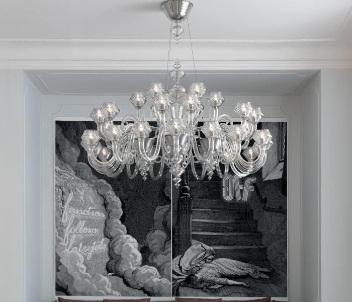 ムラーノガラスの照明は、シャンデリア、シーリングライト、卓上ランプ、ブラケットなど、多岐にわたります。