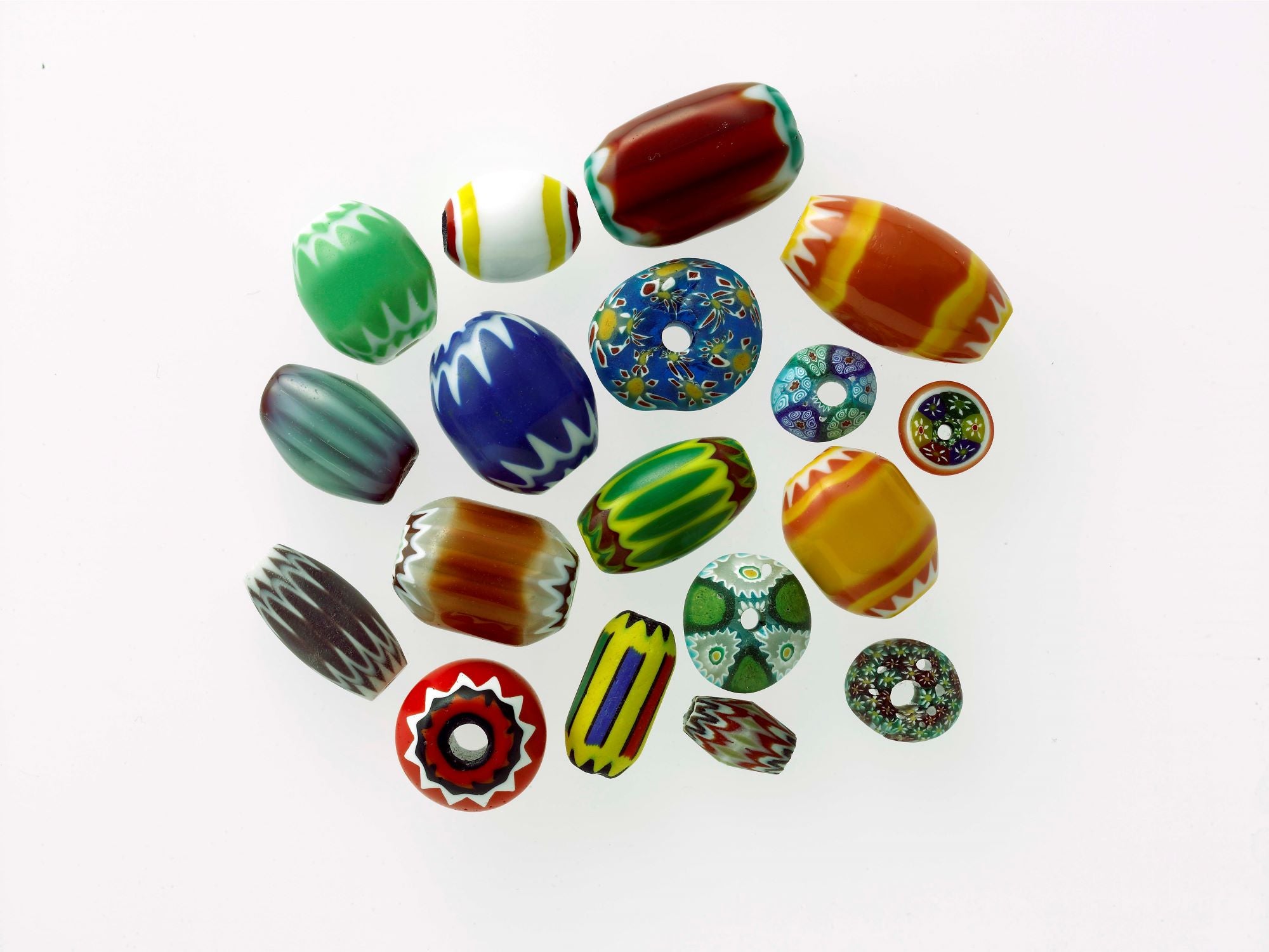大粒で簡形、紡錘形が多く、不透明なレンガ色、黄色、青、線、黒、白などの光沢の無い素地にコントラストが際立つ原色で文様を描いたビーズは褐色の肌に映え、アフリカの人々を狂喜させました。代表格はロゼッタ(シェヴロン)、カンネ(縞文様)、ピューマーテ(羽文様)、ムッリーネ(モザイク文様)、オッキオ(眼の文様)など。