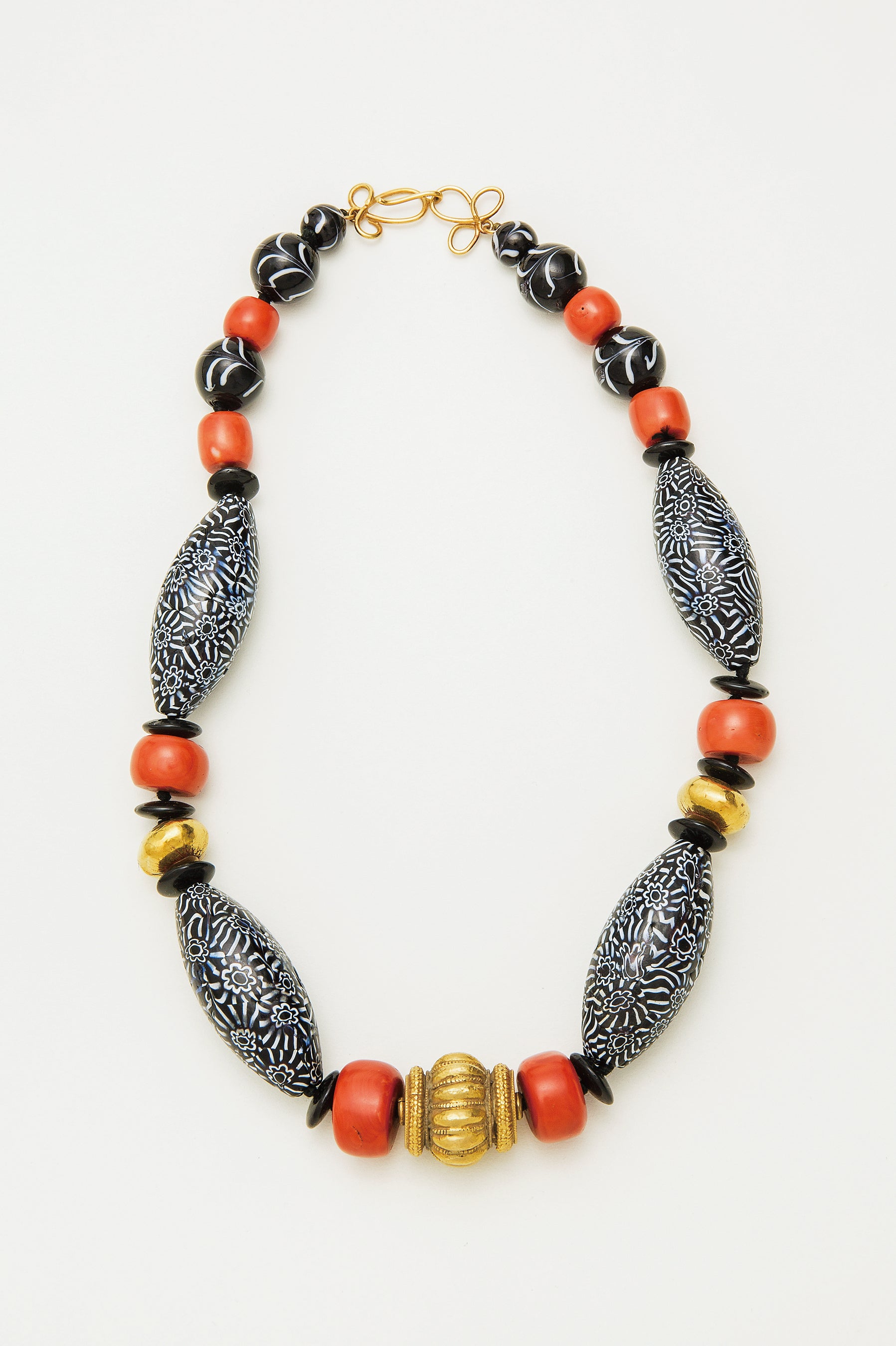 アフリカン・トレード・ビーズは交易用に考案されたビーズで、15世紀には盛んに作られていました。アフリカの国々の間で、また村々の間でも人々の好みはそれぞれ異なり、色彩はとりわけ重要な要素で、色彩が鮮烈である程、強い守護神の力が身に付ける者に宿ると信じられていたのです。
