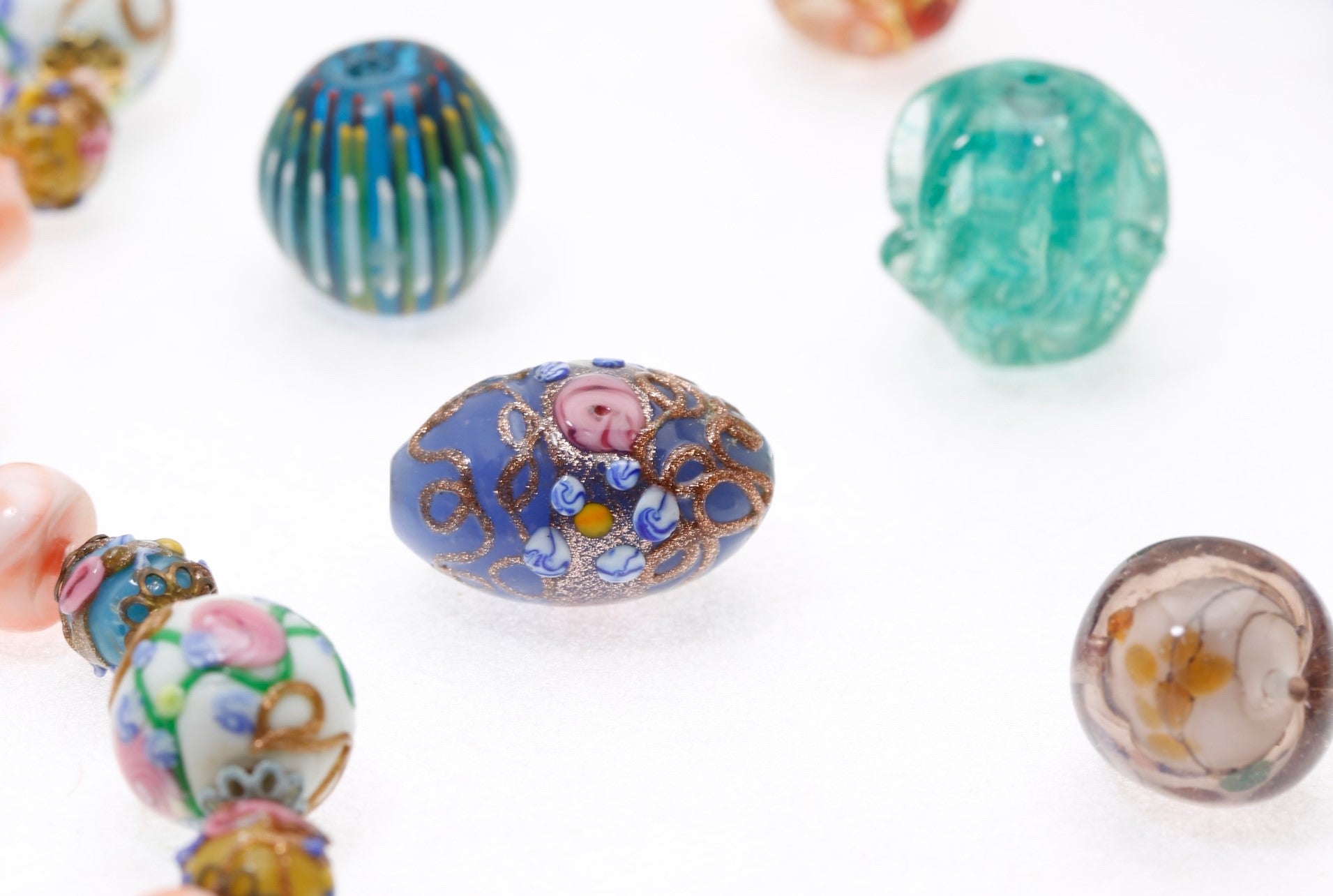 代表的な技法としては、ヴェネチアで考案されたフィオラーテ(花文様)、ソンメルソ(色ガラスや金銀箔を内包したビーズ)、ヴェッテ(流麗な線文様)やレース文様、ソフィアーテ(宙吹きビーズ)などがあり、軽やかで、洗練された優美なビーズです。