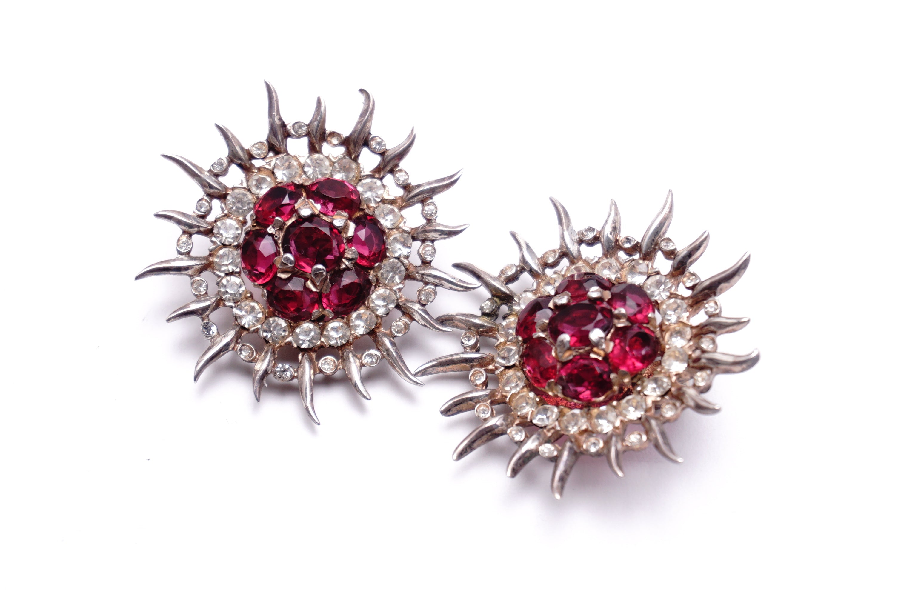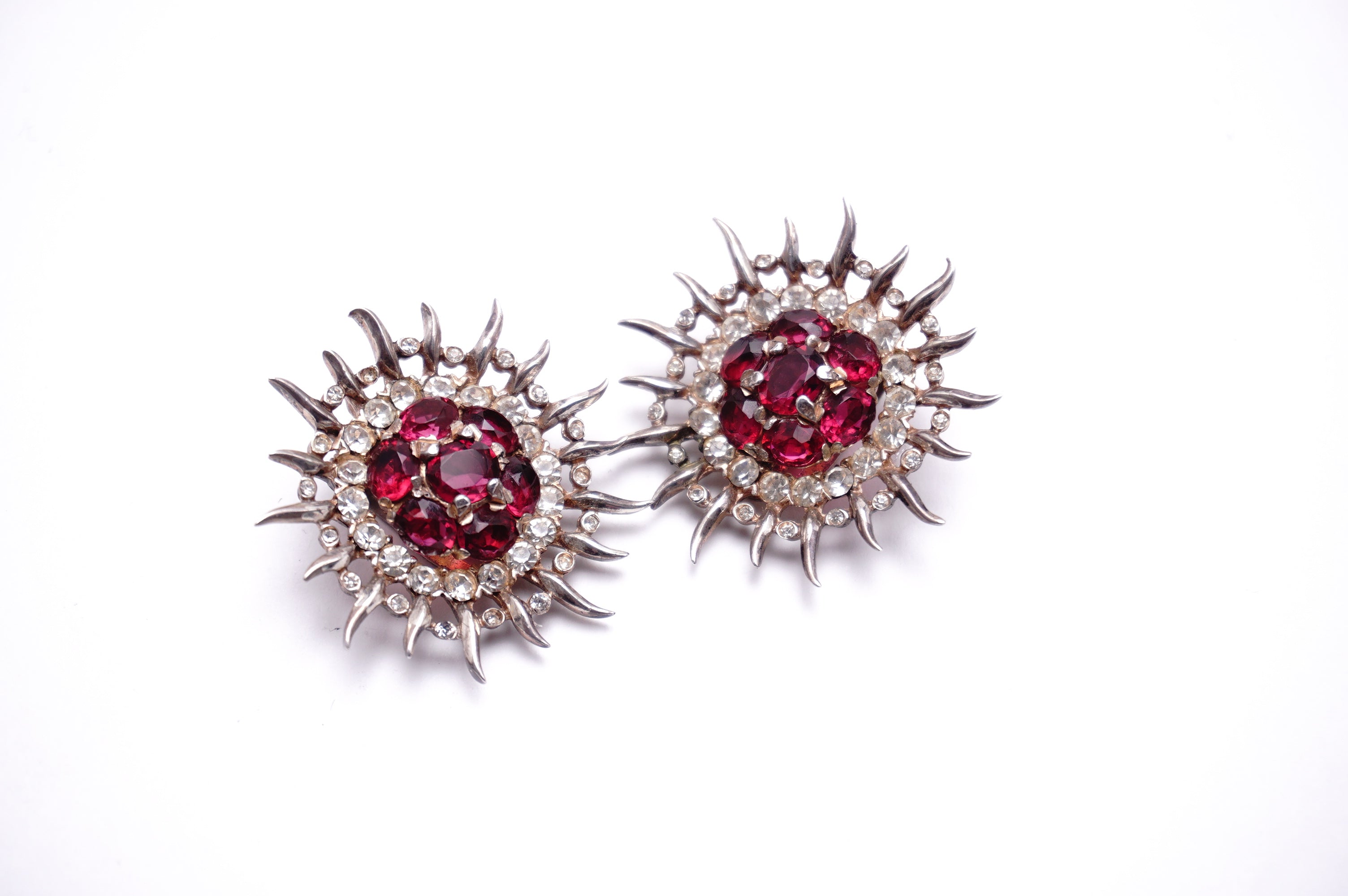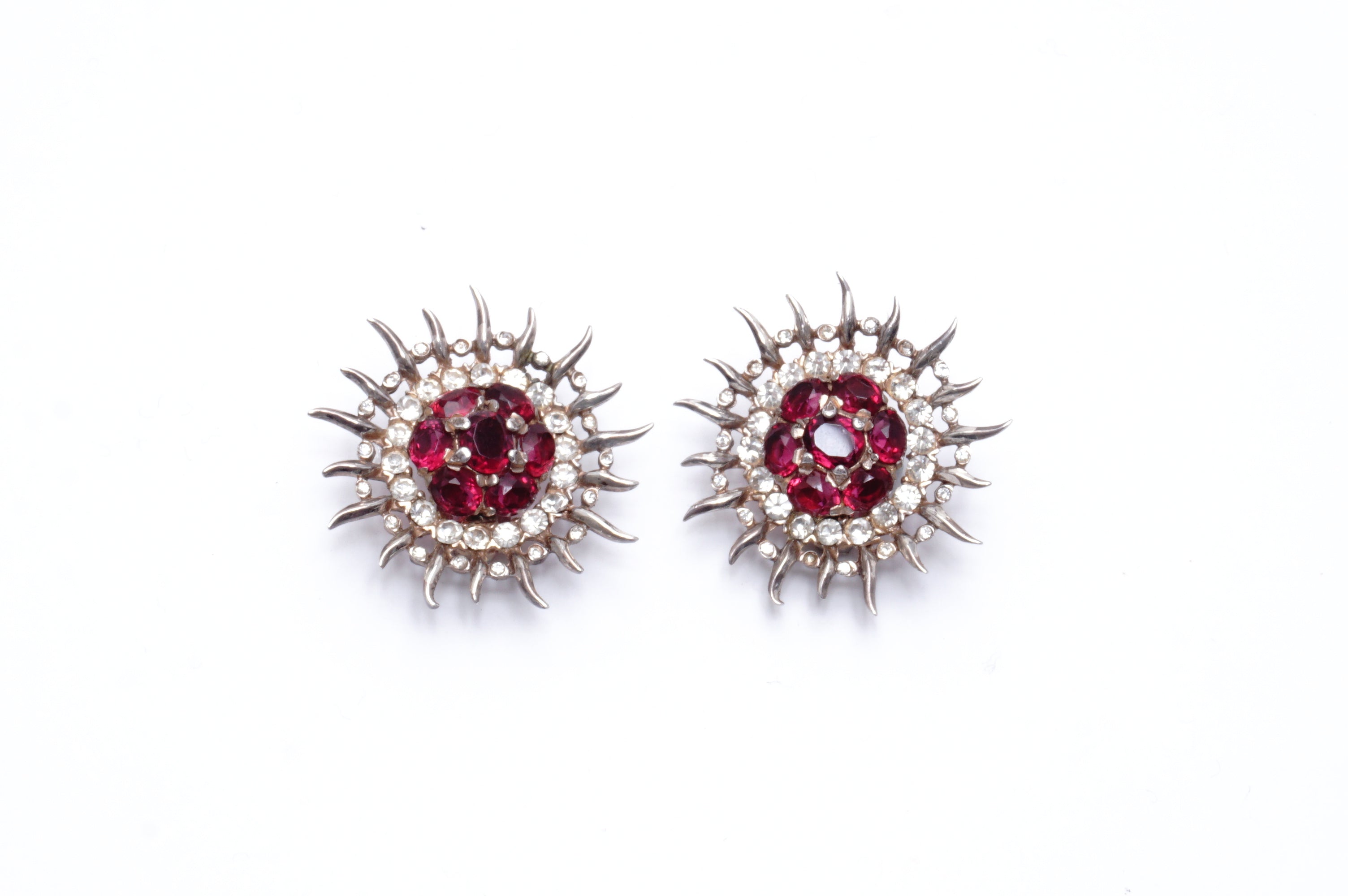 Trifari シルバー サンバースト ルビー イヤリング 白輪